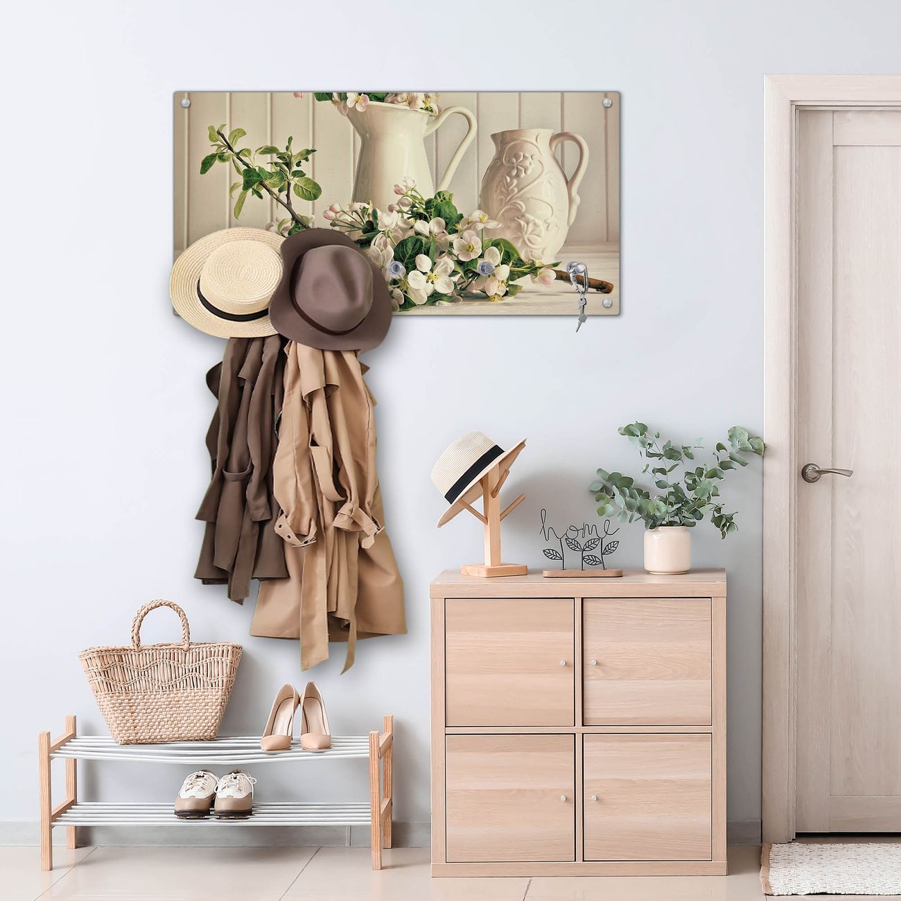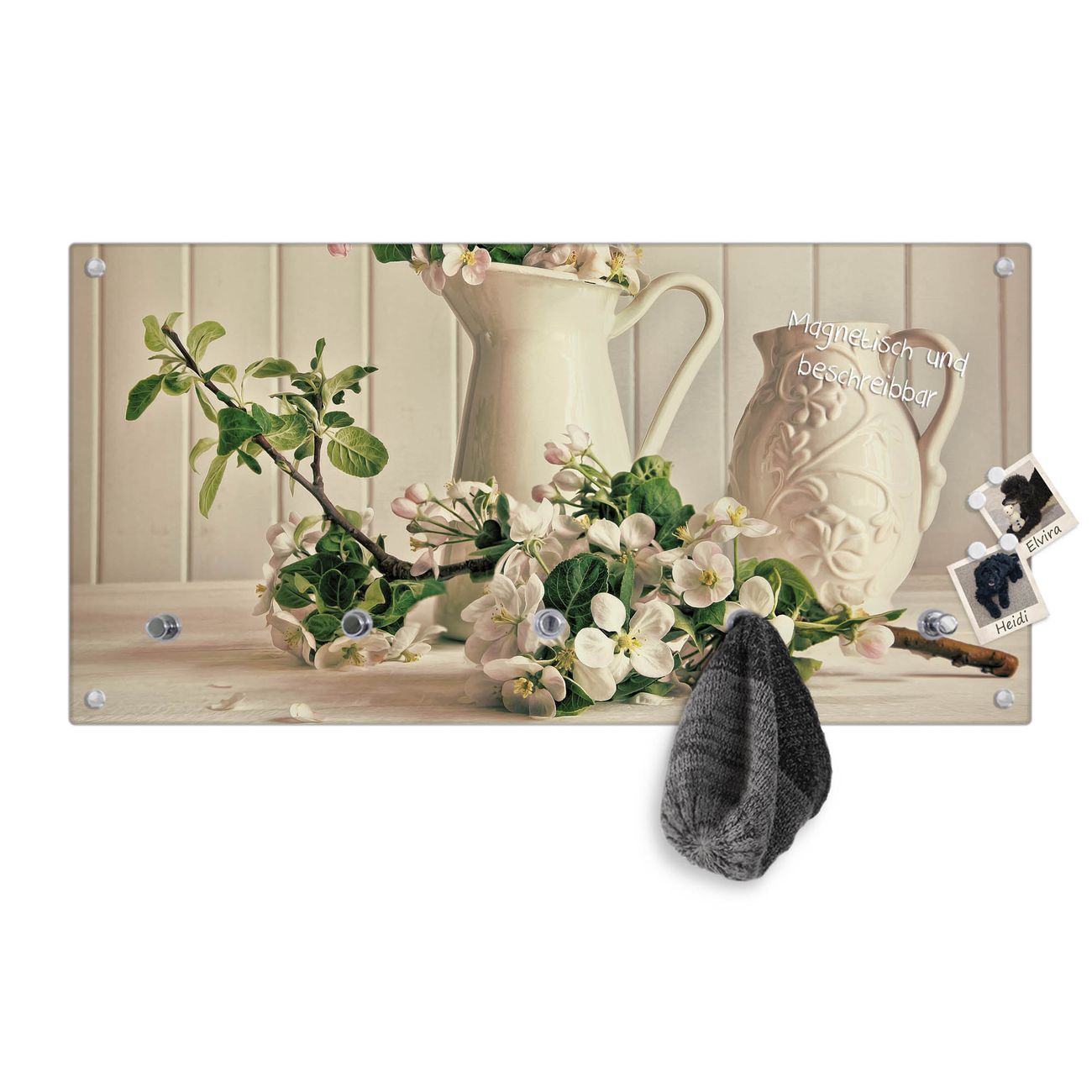 Bitte beachten Sie, dass an dieser Garderobe nur starke Neodym-Magnete halten! FUNKTION: Die banjado Wandgarderobe mit Motiv Stillleben Kirschblüten ist Ihr täglicher Begleiter. Zuverlässig hängen hier Ihre Jacken und Mäntel griffbereit. Gleichzeitig ist die Design Garderobe magnetisch, Sie können Notizen anheften und durch das Echtglas ist Ihr Paneel auch beschreibbar und wieder abwischbar. DESIGN: Sie erhalten eine Garderobenleiste aus elegantem Echtglas mit dem Farbbrillanten Motiv Stillleben Kirschblüten hinterklebt. Das Design ist zeitlos klassisch, ohne dabei auf Funktionalität zu verzichten. Suchen Sie aus einer Vielzahl von Motiven das für Ihre Einrichtung Passende aus. DETAILS: Die Flurgarderobe besteht aus 4mm gehärtetem Sicherheitsglas. Sie ist 80cm breit, 40cm hoch und 6cm tief. Die Garderobenhaken zur Selbstmontage präsentieren sich in Edelstahl-Optik, ebenso die Abstandshalter für die Wandmontage. Ihre neue Garderobe ist sofort einsatzbereit. NUTZEN: Ihre neue Garderobe hält nicht nur zuverlässig Ihre Kleidung, sie ist auch optisch ein Blickfang. Durch die magnetische Wirkung können Sie mit 4 beigefügten extrastarken Neodym-Magneten Notizen anheften und mit wasserlöslichen Kreidestiften oder Whiteboard-Markern auch Nachrichten hinterlassen. BANJADO: Wir sind ein kleines kreatives Team aus Sachsen und entwickeln Produkte die Design und Funktionalität verbinden sollen. Viel Freude mit Ihrer neuen Garderobe wünscht das banjado-Team!