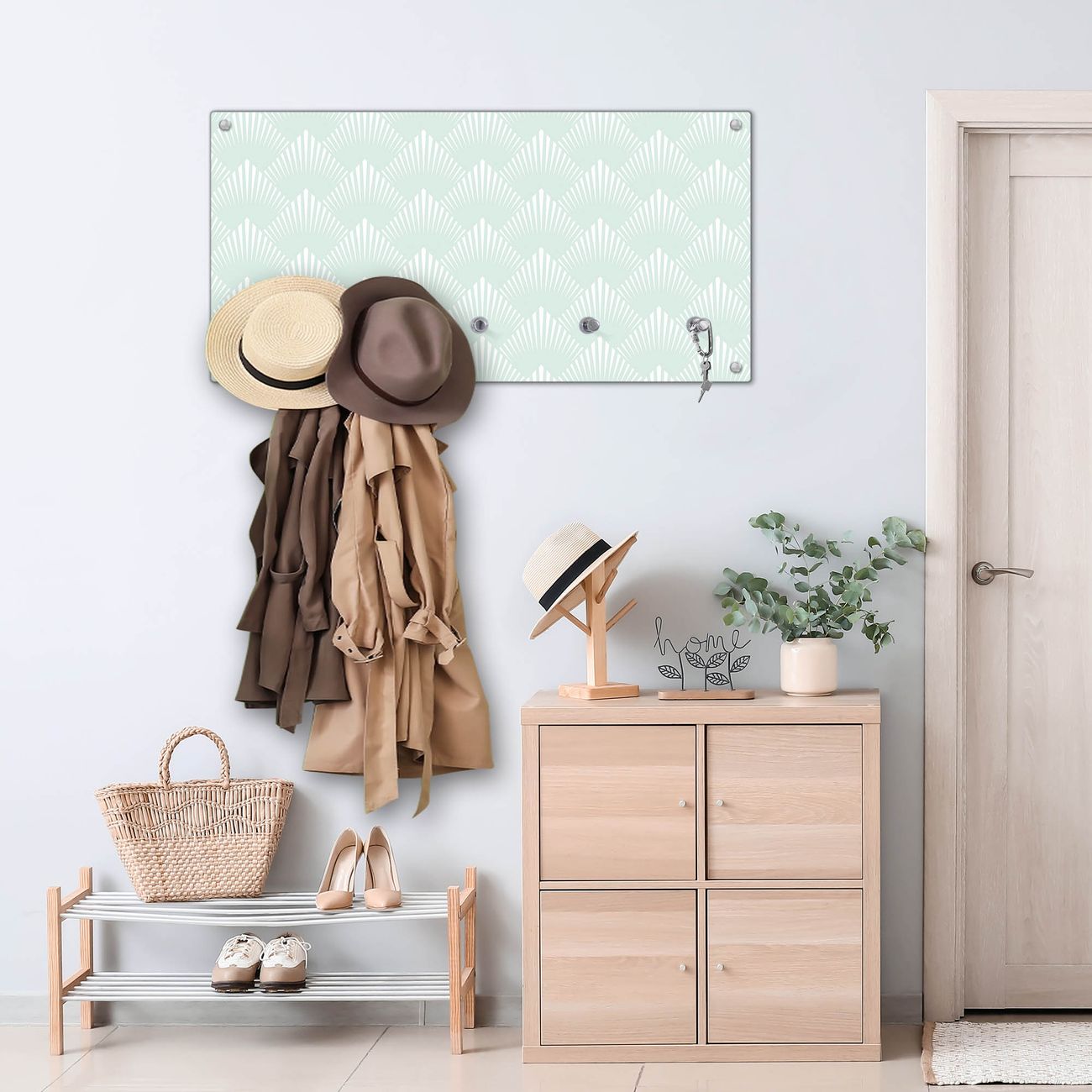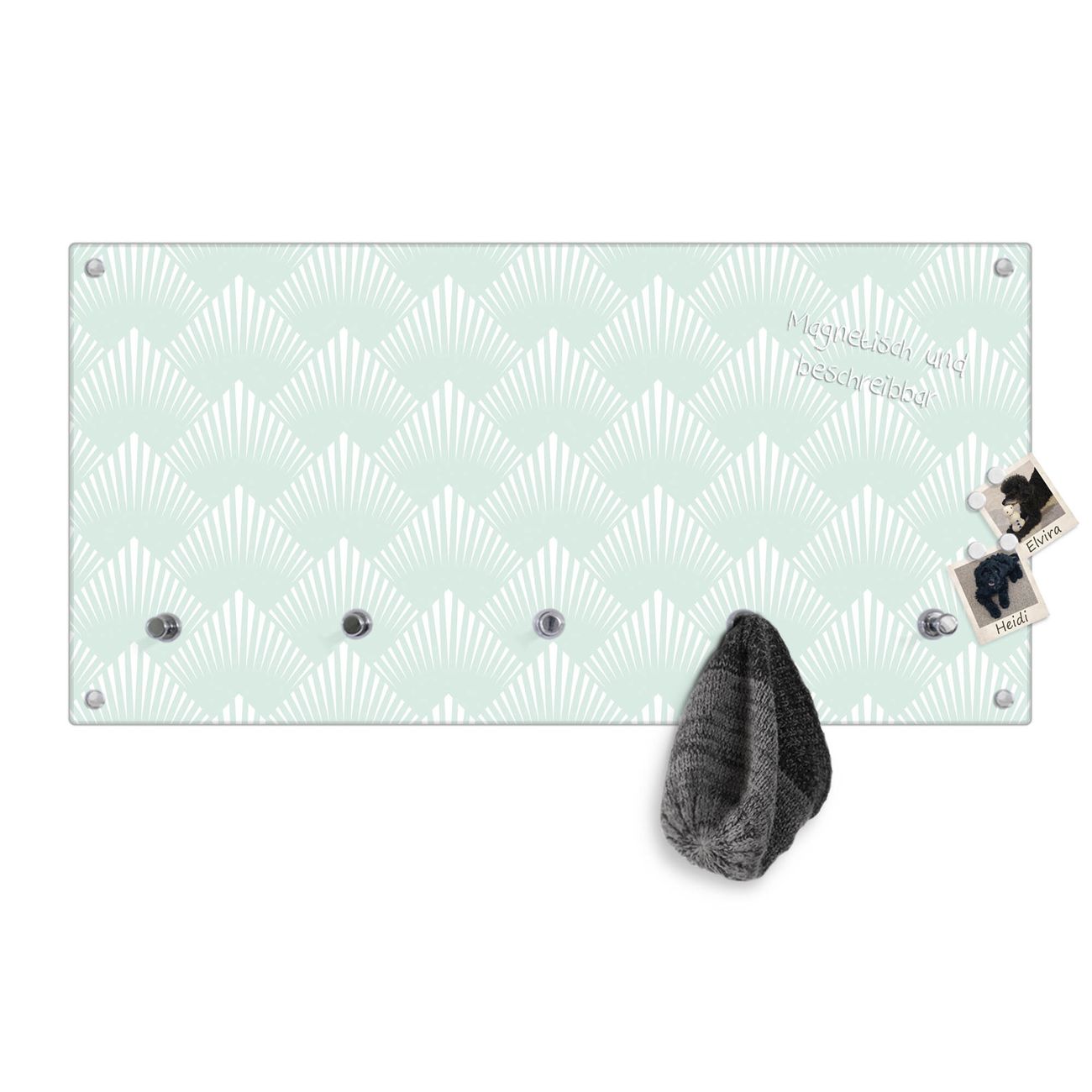Bitte beachten Sie, dass an dieser Garderobe nur starke Neodym-Magnete halten! FUNKTION: Die banjado Wandgarderobe mit Motiv Strahlen Mint ist Ihr täglicher Begleiter. Zuverlässig hängen hier Ihre Jacken und Mäntel griffbereit. Gleichzeitig ist die Design Garderobe magnetisch, Sie können Notizen anheften und durch das Echtglas ist Ihr Paneel auch beschreibbar und wieder abwischbar. DESIGN: Sie erhalten eine Garderobenleiste aus elegantem Echtglas mit dem Farbbrillanten Motiv Strahlen Mint hinterklebt. Das Design ist zeitlos klassisch, ohne dabei auf Funktionalität zu verzichten. Suchen Sie aus einer Vielzahl von Motiven das für Ihre Einrichtung Passende aus. DETAILS: Die Flurgarderobe besteht aus 4mm gehärtetem Sicherheitsglas. Sie ist 80cm breit, 40cm hoch und 6cm tief. Die Garderobenhaken zur Selbstmontage präsentieren sich in Edelstahl-Optik, ebenso die Abstandshalter für die Wandmontage. Ihre neue Garderobe ist sofort einsatzbereit. NUTZEN: Ihre neue Garderobe hält nicht nur zuverlässig Ihre Kleidung, sie ist auch optisch ein Blickfang. Durch die magnetische Wirkung können Sie mit 4 beigefügten extrastarken Neodym-Magneten Notizen anheften und mit wasserlöslichen Kreidestiften oder Whiteboard-Markern auch Nachrichten hinterlassen. BANJADO: Wir sind ein kleines kreatives Team aus Sachsen und entwickeln Produkte die Design und Funktionalität verbinden sollen. Viel Freude mit Ihrer neuen Garderobe wünscht das banjado-Team!