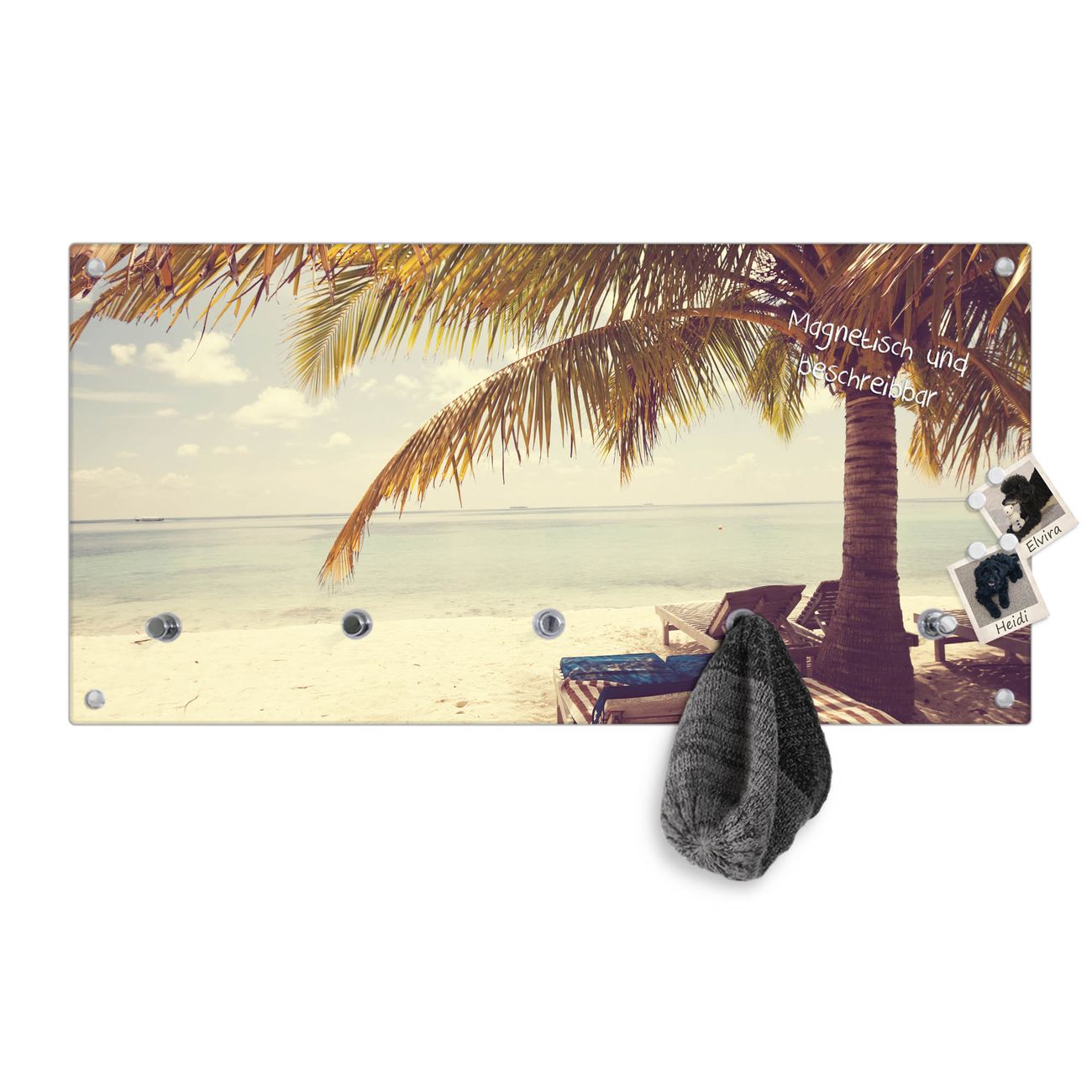 Bitte beachten Sie, dass an dieser Garderobe nur starke Neodym-Magnete halten! FUNKTION: Die banjado Wandgarderobe mit Motiv Südseestrand ist Ihr täglicher Begleiter. Zuverlässig hängen hier Ihre Jacken und Mäntel griffbereit. Gleichzeitig ist die Design Garderobe magnetisch, Sie können Notizen anheften und durch das Echtglas ist Ihr Paneel auch beschreibbar und wieder abwischbar. DESIGN: Sie erhalten eine Garderobenleiste aus elegantem Echtglas mit dem Farbbrillanten Motiv Südseestrand hinterklebt. Das Design ist zeitlos klassisch, ohne dabei auf Funktionalität zu verzichten. Suchen Sie aus einer Vielzahl von Motiven das für Ihre Einrichtung Passende aus. DETAILS: Die Flurgarderobe besteht aus 4mm gehärtetem Sicherheitsglas. Sie ist 80cm breit, 40cm hoch und 6cm tief. Die Garderobenhaken zur Selbstmontage präsentieren sich in Edelstahl-Optik, ebenso die Abstandshalter für die Wandmontage. Ihre neue Garderobe ist sofort einsatzbereit. NUTZEN: Ihre neue Garderobe hält nicht nur zuverlässig Ihre Kleidung, sie ist auch optisch ein Blickfang. Durch die magnetische Wirkung können Sie mit 4 beigefügten extrastarken Neodym-Magneten Notizen anheften und mit wasserlöslichen Kreidestiften oder Whiteboard-Markern auch Nachrichten hinterlassen. BANJADO: Wir sind ein kleines kreatives Team aus Sachsen und entwickeln Produkte die Design und Funktionalität verbinden sollen. Viel Freude mit Ihrer neuen Garderobe wünscht das banjado-Team!