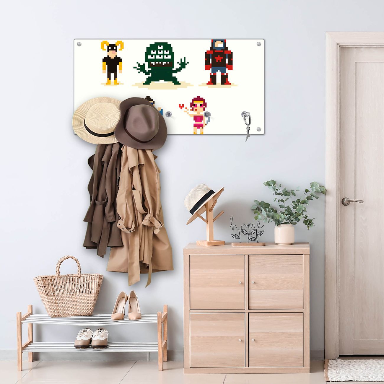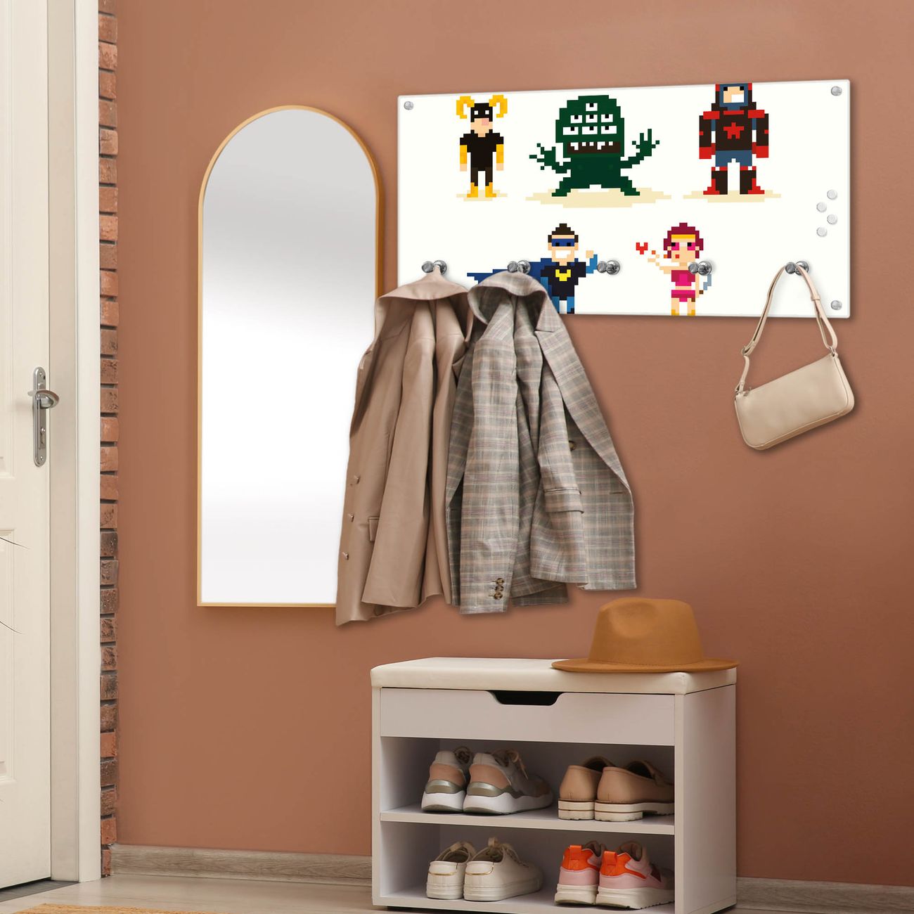 Bitte beachten Sie, dass an dieser Garderobe nur starke Neodym-Magnete halten! FUNKTION: Die banjado Wandgarderobe mit Motiv Superhelden ist Ihr täglicher Begleiter. Zuverlässig hängen hier Ihre Jacken und Mäntel griffbereit. Gleichzeitig ist die Design Garderobe magnetisch, Sie können Notizen anheften und durch das Echtglas ist Ihr Paneel auch beschreibbar und wieder abwischbar. DESIGN: Sie erhalten eine Garderobenleiste aus elegantem Echtglas mit dem Farbbrillanten Motiv Superhelden hinterklebt. Das Design ist zeitlos klassisch, ohne dabei auf Funktionalität zu verzichten. Suchen Sie aus einer Vielzahl von Motiven das für Ihre Einrichtung Passende aus. DETAILS: Die Flurgarderobe besteht aus 4mm gehärtetem Sicherheitsglas. Sie ist 80cm breit, 40cm hoch und 6cm tief. Die Garderobenhaken zur Selbstmontage präsentieren sich in Edelstahl-Optik, ebenso die Abstandshalter für die Wandmontage. Ihre neue Garderobe ist sofort einsatzbereit. NUTZEN: Ihre neue Garderobe hält nicht nur zuverlässig Ihre Kleidung, sie ist auch optisch ein Blickfang. Durch die magnetische Wirkung können Sie mit 4 beigefügten extrastarken Neodym-Magneten Notizen anheften und mit wasserlöslichen Kreidestiften oder Whiteboard-Markern auch Nachrichten hinterlassen. BANJADO: Wir sind ein kleines kreatives Team aus Sachsen und entwickeln Produkte die Design und Funktionalität verbinden sollen. Viel Freude mit Ihrer neuen Garderobe wünscht das banjado-Team!