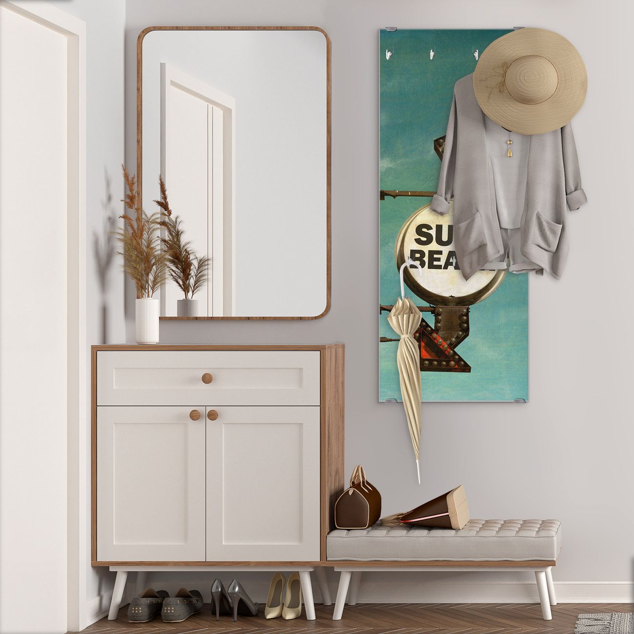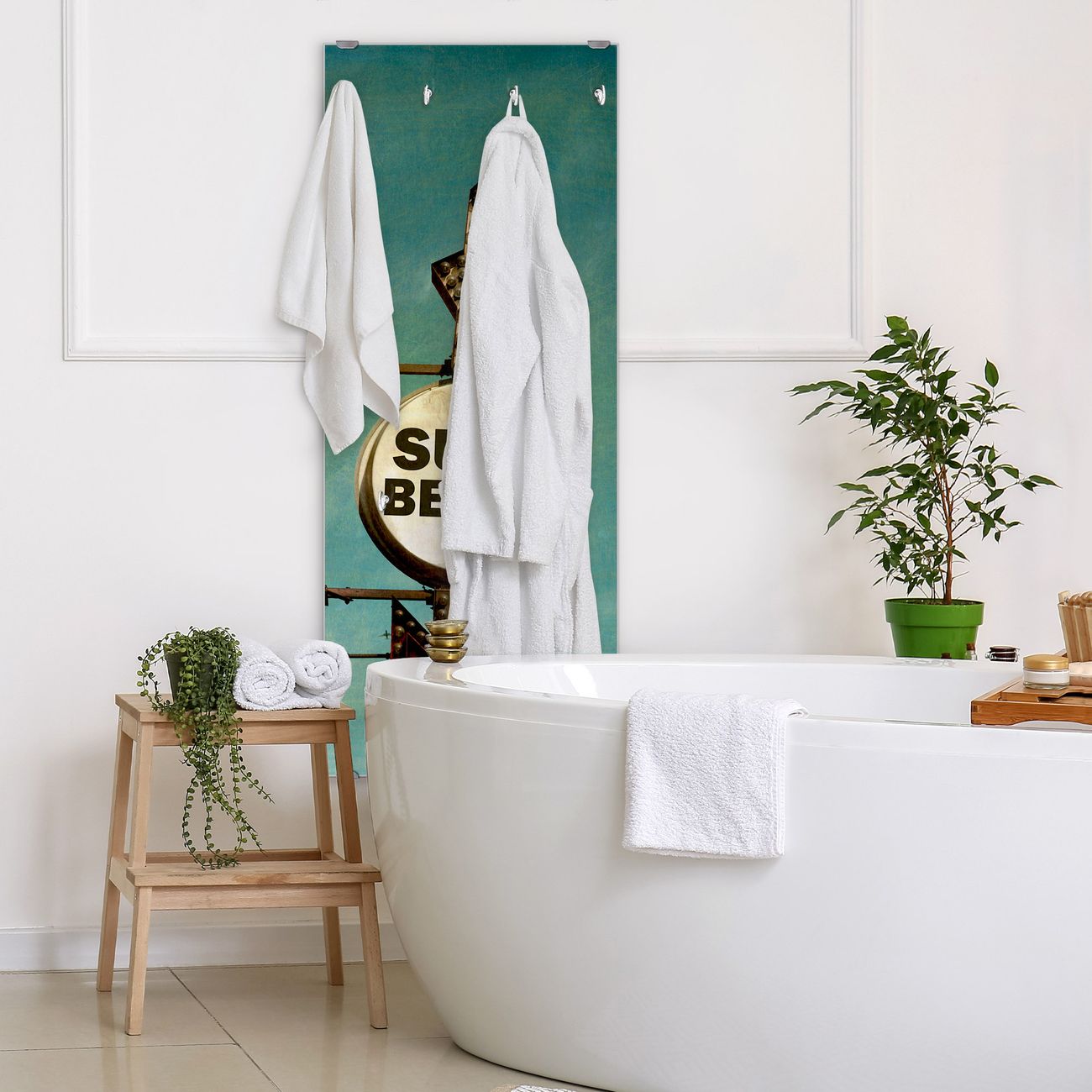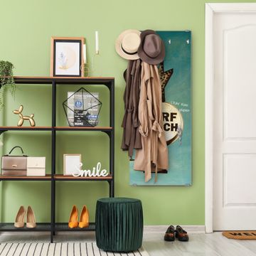 FUNKTION: Die banjado Wandgarderobe mit Motiv Surf Beach ist Ihr täglicher Begleiter. Zuverlässig hängen hier Ihre Jacken und Mäntel griffbereit. Das Echtglas ist Ihr Paneel auch beschreibbar und wieder abwischbar. DESIGN: Sie erhalten eine Garderobenleiste aus elegantem Echtglas mit dem Farbbrillanten Motiv Surf Beach hinterklebt. Das Design ist zeitlos klassisch, ohne dabei auf Funktionalität zu verzichten. Suchen Sie aus einer Vielzahl von Motiven das für Ihre Einrichtung Passende aus. DETAILS: Die Flurgarderobe besteht aus 4mm gehärtetem Sicherheitsglas. Sie ist 50cm breit, 125cm hoch und 6cm tief. Die Garderobenhaken zur Selbstmontage präsentieren sich in Edelstahl-Optik, ebenso die Abstandshalter für die Wandmontage. Ihre neue Garderobe ist sofort einsatzbereit. NUTZEN: Ihre neue Garderobe hält nicht nur zuverlässig Ihre Kleidung, sie ist auch optisch ein Blickfang. Durch das Glas können Sie an der Garderobe mit wasserlöslichen Kreidestiften oder Whiteboard-Markern auch Nachrichten hinterlassen. BANJADO: Wir sind ein kleines kreatives Team aus Sachsen und entwickeln Produkte die Design und Funktionalität verbinden sollen. Viel Freude mit Ihrer neuen Garderobe wünscht das banjado-Team!