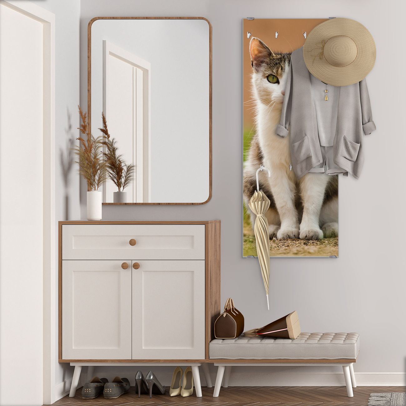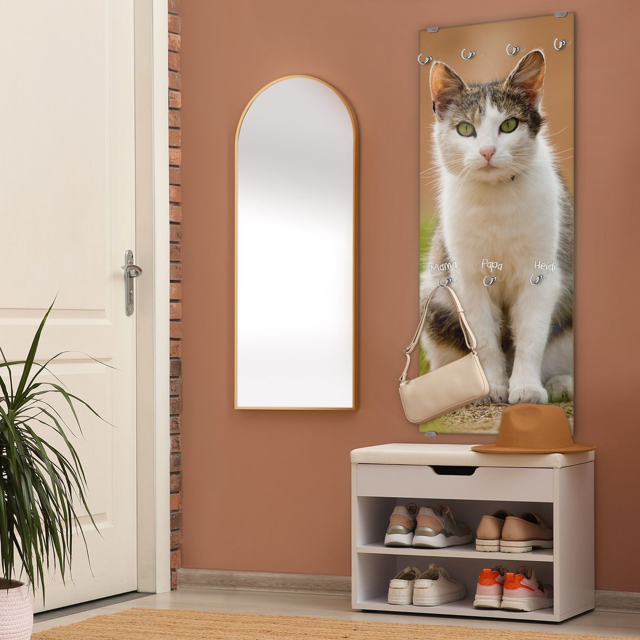 FUNKTION: Die banjado Wandgarderobe mit Motiv Suse ist Ihr täglicher Begleiter. Zuverlässig hängen hier Ihre Jacken und Mäntel griffbereit. Das Echtglas ist Ihr Paneel auch beschreibbar und wieder abwischbar. DESIGN: Sie erhalten eine Garderobenleiste aus elegantem Echtglas mit dem Farbbrillanten Motiv Suse hinterklebt. Das Design ist zeitlos klassisch, ohne dabei auf Funktionalität zu verzichten. Suchen Sie aus einer Vielzahl von Motiven das für Ihre Einrichtung Passende aus. DETAILS: Die Flurgarderobe besteht aus 4mm gehärtetem Sicherheitsglas. Sie ist 50cm breit, 125cm hoch und 6cm tief. Die Garderobenhaken zur Selbstmontage präsentieren sich in Edelstahl-Optik, ebenso die Abstandshalter für die Wandmontage. Ihre neue Garderobe ist sofort einsatzbereit. NUTZEN: Ihre neue Garderobe hält nicht nur zuverlässig Ihre Kleidung, sie ist auch optisch ein Blickfang. Durch das Glas können Sie an der Garderobe mit wasserlöslichen Kreidestiften oder Whiteboard-Markern auch Nachrichten hinterlassen. BANJADO: Wir sind ein kleines kreatives Team aus Sachsen und entwickeln Produkte die Design und Funktionalität verbinden sollen. Viel Freude mit Ihrer neuen Garderobe wünscht das banjado-Team!