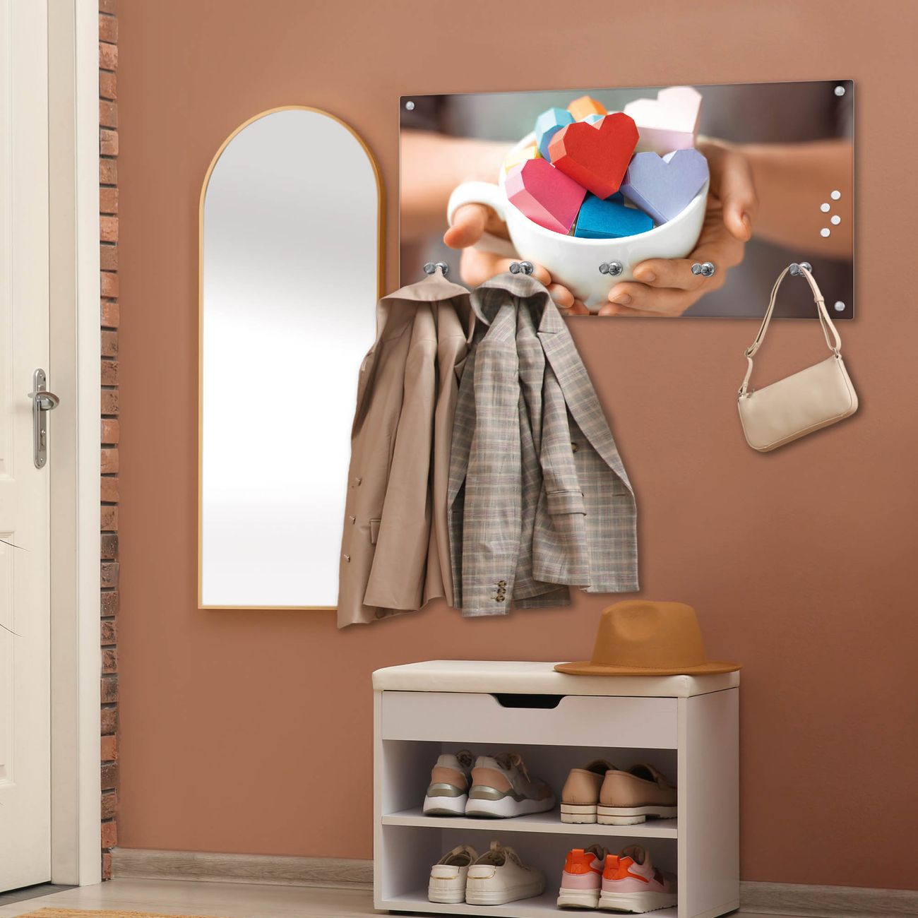 Bitte beachten Sie, dass an dieser Garderobe nur starke Neodym-Magnete halten! FUNKTION: Die banjado Wandgarderobe mit Motiv Tasse voller Herzen ist Ihr täglicher Begleiter. Zuverlässig hängen hier Ihre Jacken und Mäntel griffbereit. Gleichzeitig ist die Design Garderobe magnetisch, Sie können Notizen anheften und durch das Echtglas ist Ihr Paneel auch beschreibbar und wieder abwischbar. DESIGN: Sie erhalten eine Garderobenleiste aus elegantem Echtglas mit dem Farbbrillanten Motiv Tasse voller Herzen hinterklebt. Das Design ist zeitlos klassisch, ohne dabei auf Funktionalität zu verzichten. Suchen Sie aus einer Vielzahl von Motiven das für Ihre Einrichtung Passende aus. DETAILS: Die Flurgarderobe besteht aus 4mm gehärtetem Sicherheitsglas. Sie ist 80cm breit, 40cm hoch und 6cm tief. Die Garderobenhaken zur Selbstmontage präsentieren sich in Edelstahl-Optik, ebenso die Abstandshalter für die Wandmontage. Ihre neue Garderobe ist sofort einsatzbereit. NUTZEN: Ihre neue Garderobe hält nicht nur zuverlässig Ihre Kleidung, sie ist auch optisch ein Blickfang. Durch die magnetische Wirkung können Sie mit 4 beigefügten extrastarken Neodym-Magneten Notizen anheften und mit wasserlöslichen Kreidestiften oder Whiteboard-Markern auch Nachrichten hinterlassen. BANJADO: Wir sind ein kleines kreatives Team aus Sachsen und entwickeln Produkte die Design und Funktionalität verbinden sollen. Viel Freude mit Ihrer neuen Garderobe wünscht das banjado-Team!