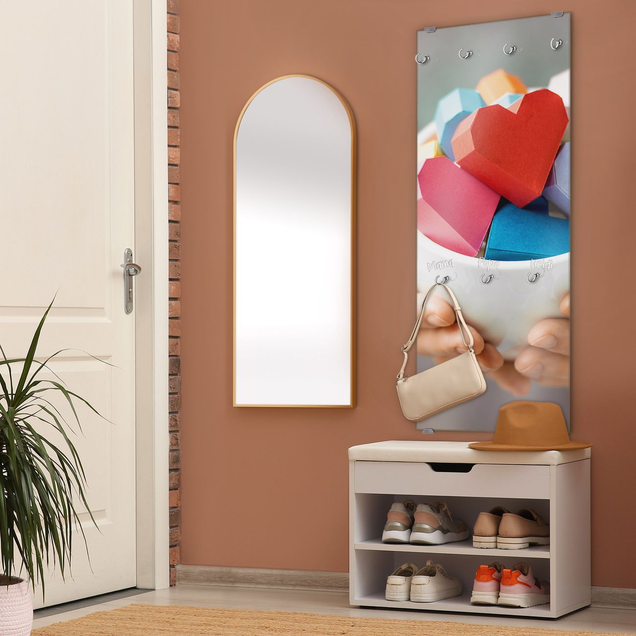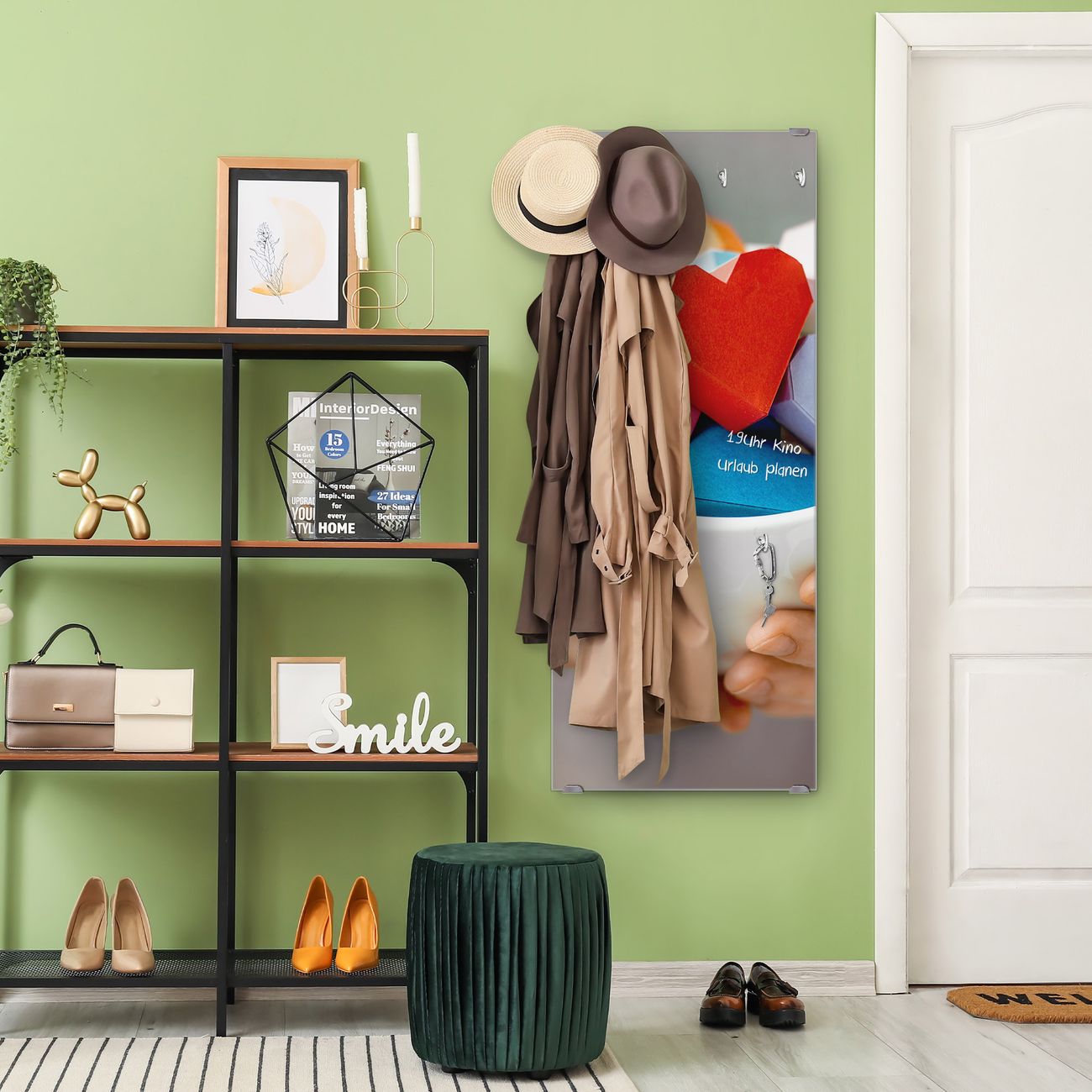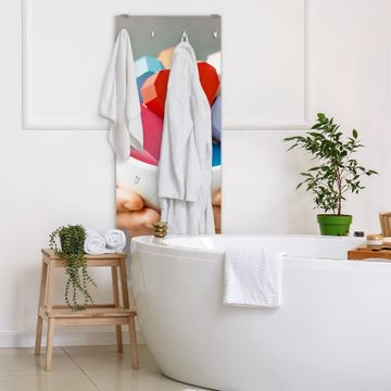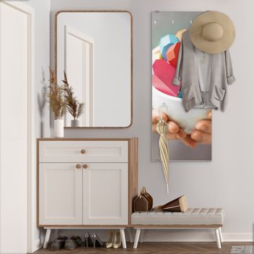 FUNKTION: Die banjado Wandgarderobe mit Motiv Tasse voller Herzen ist Ihr täglicher Begleiter. Zuverlässig hängen hier Ihre Jacken und Mäntel griffbereit. Das Echtglas ist Ihr Paneel auch beschreibbar und wieder abwischbar. DESIGN: Sie erhalten eine Garderobenleiste aus elegantem Echtglas mit dem Farbbrillanten Motiv Tasse voller Herzen hinterklebt. Das Design ist zeitlos klassisch, ohne dabei auf Funktionalität zu verzichten. Suchen Sie aus einer Vielzahl von Motiven das für Ihre Einrichtung Passende aus. DETAILS: Die Flurgarderobe besteht aus 4mm gehärtetem Sicherheitsglas. Sie ist 50cm breit, 125cm hoch und 6cm tief. Die Garderobenhaken zur Selbstmontage präsentieren sich in Edelstahl-Optik, ebenso die Abstandshalter für die Wandmontage. Ihre neue Garderobe ist sofort einsatzbereit. NUTZEN: Ihre neue Garderobe hält nicht nur zuverlässig Ihre Kleidung, sie ist auch optisch ein Blickfang. Durch das Glas können Sie an der Garderobe mit wasserlöslichen Kreidestiften oder Whiteboard-Markern auch Nachrichten hinterlassen. BANJADO: Wir sind ein kleines kreatives Team aus Sachsen und entwickeln Produkte die Design und Funktionalität verbinden sollen. Viel Freude mit Ihrer neuen Garderobe wünscht das banjado-Team!