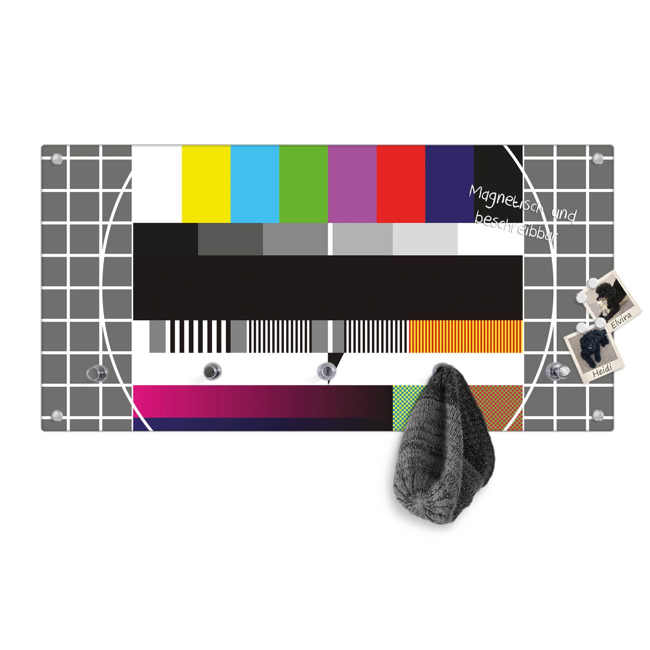 Bitte beachten Sie, dass an dieser Garderobe nur starke Neodym-Magnete halten! FUNKTION: Die banjado Wandgarderobe mit Motiv Testbild ist Ihr täglicher Begleiter. Zuverlässig hängen hier Ihre Jacken und Mäntel griffbereit. Gleichzeitig ist die Design Garderobe magnetisch, Sie können Notizen anheften und durch das Echtglas ist Ihr Paneel auch beschreibbar und wieder abwischbar. DESIGN: Sie erhalten eine Garderobenleiste aus elegantem Echtglas mit dem Farbbrillanten Motiv Testbild hinterklebt. Das Design ist zeitlos klassisch, ohne dabei auf Funktionalität zu verzichten. Suchen Sie aus einer Vielzahl von Motiven das für Ihre Einrichtung Passende aus. DETAILS: Die Flurgarderobe besteht aus 4mm gehärtetem Sicherheitsglas. Sie ist 80cm breit, 40cm hoch und 6cm tief. Die Garderobenhaken zur Selbstmontage präsentieren sich in Edelstahl-Optik, ebenso die Abstandshalter für die Wandmontage. Ihre neue Garderobe ist sofort einsatzbereit. NUTZEN: Ihre neue Garderobe hält nicht nur zuverlässig Ihre Kleidung, sie ist auch optisch ein Blickfang. Durch die magnetische Wirkung können Sie mit 4 beigefügten extrastarken Neodym-Magneten Notizen anheften und mit wasserlöslichen Kreidestiften oder Whiteboard-Markern auch Nachrichten hinterlassen. BANJADO: Wir sind ein kleines kreatives Team aus Sachsen und entwickeln Produkte die Design und Funktionalität verbinden sollen. Viel Freude mit Ihrer neuen Garderobe wünscht das banjado-Team!