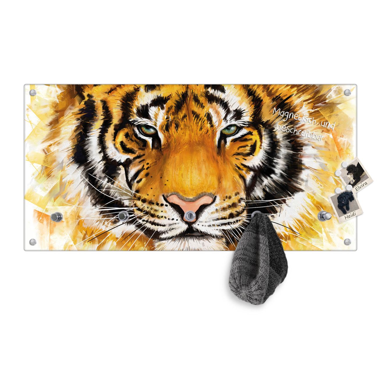 Bitte beachten Sie, dass an dieser Garderobe nur starke Neodym-Magnete halten! FUNKTION: Die banjado Wandgarderobe mit Motiv Tigerkopf ist Ihr täglicher Begleiter. Zuverlässig hängen hier Ihre Jacken und Mäntel griffbereit. Gleichzeitig ist die Design Garderobe magnetisch, Sie können Notizen anheften und durch das Echtglas ist Ihr Paneel auch beschreibbar und wieder abwischbar. DESIGN: Sie erhalten eine Garderobenleiste aus elegantem Echtglas mit dem Farbbrillanten Motiv Tigerkopf hinterklebt. Das Design ist zeitlos klassisch, ohne dabei auf Funktionalität zu verzichten. Suchen Sie aus einer Vielzahl von Motiven das für Ihre Einrichtung Passende aus. DETAILS: Die Flurgarderobe besteht aus 4mm gehärtetem Sicherheitsglas. Sie ist 80cm breit, 40cm hoch und 6cm tief. Die Garderobenhaken zur Selbstmontage präsentieren sich in Edelstahl-Optik, ebenso die Abstandshalter für die Wandmontage. Ihre neue Garderobe ist sofort einsatzbereit. NUTZEN: Ihre neue Garderobe hält nicht nur zuverlässig Ihre Kleidung, sie ist auch optisch ein Blickfang. Durch die magnetische Wirkung können Sie mit 4 beigefügten extrastarken Neodym-Magneten Notizen anheften und mit wasserlöslichen Kreidestiften oder Whiteboard-Markern auch Nachrichten hinterlassen. BANJADO: Wir sind ein kleines kreatives Team aus Sachsen und entwickeln Produkte die Design und Funktionalität verbinden sollen. Viel Freude mit Ihrer neuen Garderobe wünscht das banjado-Team!