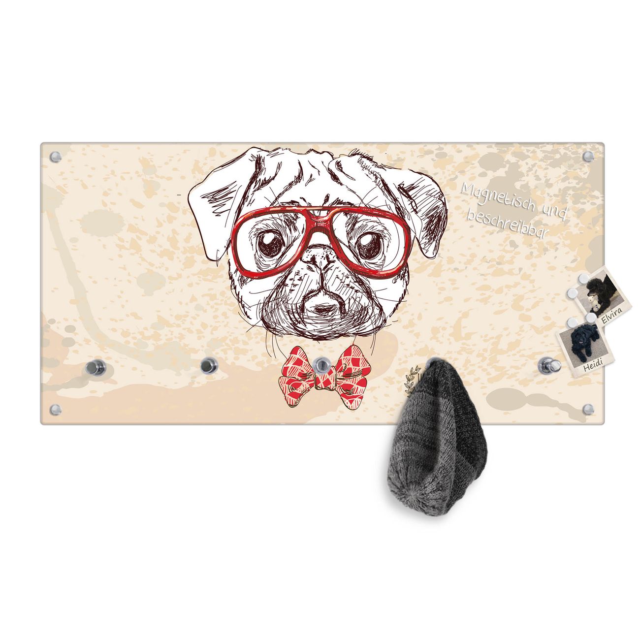 Bitte beachten Sie, dass an dieser Garderobe nur starke Neodym-Magnete halten! FUNKTION: Die banjado Wandgarderobe mit Motiv Timothy ist Ihr täglicher Begleiter. Zuverlässig hängen hier Ihre Jacken und Mäntel griffbereit. Gleichzeitig ist die Design Garderobe magnetisch, Sie können Notizen anheften und durch das Echtglas ist Ihr Paneel auch beschreibbar und wieder abwischbar. DESIGN: Sie erhalten eine Garderobenleiste aus elegantem Echtglas mit dem Farbbrillanten Motiv Timothy hinterklebt. Das Design ist zeitlos klassisch, ohne dabei auf Funktionalität zu verzichten. Suchen Sie aus einer Vielzahl von Motiven das für Ihre Einrichtung Passende aus. DETAILS: Die Flurgarderobe besteht aus 4mm gehärtetem Sicherheitsglas. Sie ist 80cm breit, 40cm hoch und 6cm tief. Die Garderobenhaken zur Selbstmontage präsentieren sich in Edelstahl-Optik, ebenso die Abstandshalter für die Wandmontage. Ihre neue Garderobe ist sofort einsatzbereit. NUTZEN: Ihre neue Garderobe hält nicht nur zuverlässig Ihre Kleidung, sie ist auch optisch ein Blickfang. Durch die magnetische Wirkung können Sie mit 4 beigefügten extrastarken Neodym-Magneten Notizen anheften und mit wasserlöslichen Kreidestiften oder Whiteboard-Markern auch Nachrichten hinterlassen. BANJADO: Wir sind ein kleines kreatives Team aus Sachsen und entwickeln Produkte die Design und Funktionalität verbinden sollen. Viel Freude mit Ihrer neuen Garderobe wünscht das banjado-Team!