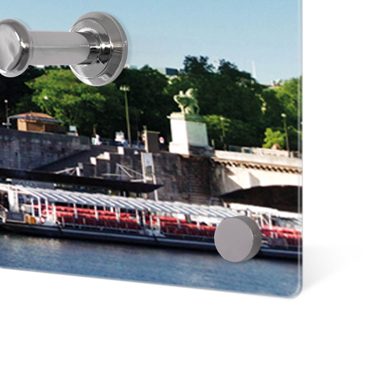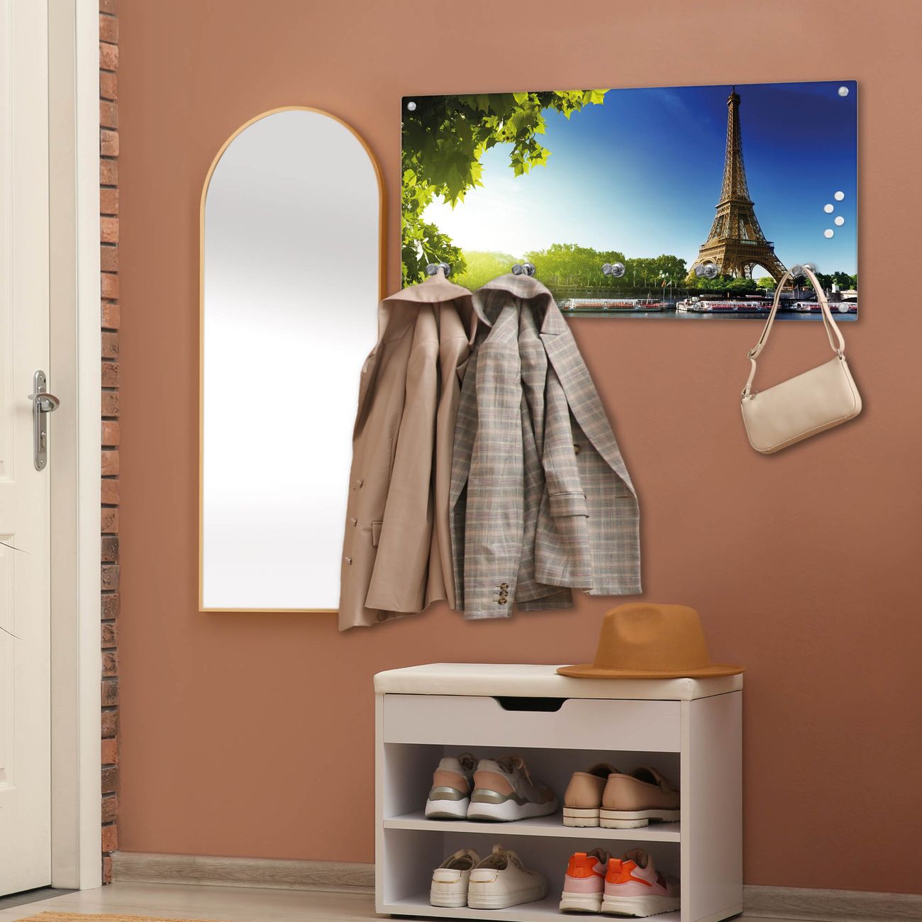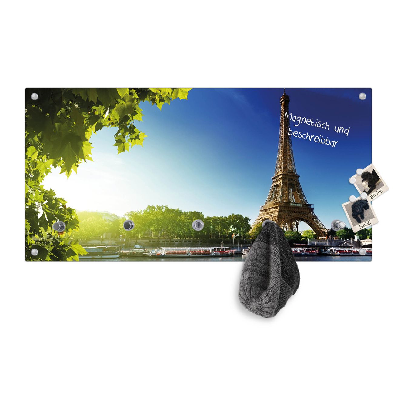 Bitte beachten Sie, dass an dieser Garderobe nur starke Neodym-Magnete halten! FUNKTION: Die banjado Wandgarderobe mit Motiv Tour Eiffel ist Ihr täglicher Begleiter. Zuverlässig hängen hier Ihre Jacken und Mäntel griffbereit. Gleichzeitig ist die Design Garderobe magnetisch, Sie können Notizen anheften und durch das Echtglas ist Ihr Paneel auch beschreibbar und wieder abwischbar. DESIGN: Sie erhalten eine Garderobenleiste aus elegantem Echtglas mit dem Farbbrillanten Motiv Tour Eiffel hinterklebt. Das Design ist zeitlos klassisch, ohne dabei auf Funktionalität zu verzichten. Suchen Sie aus einer Vielzahl von Motiven das für Ihre Einrichtung Passende aus. DETAILS: Die Flurgarderobe besteht aus 4mm gehärtetem Sicherheitsglas. Sie ist 80cm breit, 40cm hoch und 6cm tief. Die Garderobenhaken zur Selbstmontage präsentieren sich in Edelstahl-Optik, ebenso die Abstandshalter für die Wandmontage. Ihre neue Garderobe ist sofort einsatzbereit. NUTZEN: Ihre neue Garderobe hält nicht nur zuverlässig Ihre Kleidung, sie ist auch optisch ein Blickfang. Durch die magnetische Wirkung können Sie mit 4 beigefügten extrastarken Neodym-Magneten Notizen anheften und mit wasserlöslichen Kreidestiften oder Whiteboard-Markern auch Nachrichten hinterlassen. BANJADO: Wir sind ein kleines kreatives Team aus Sachsen und entwickeln Produkte die Design und Funktionalität verbinden sollen. Viel Freude mit Ihrer neuen Garderobe wünscht das banjado-Team!