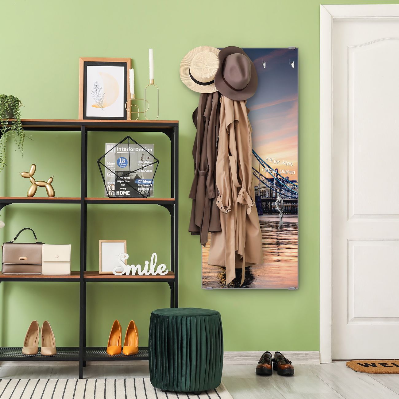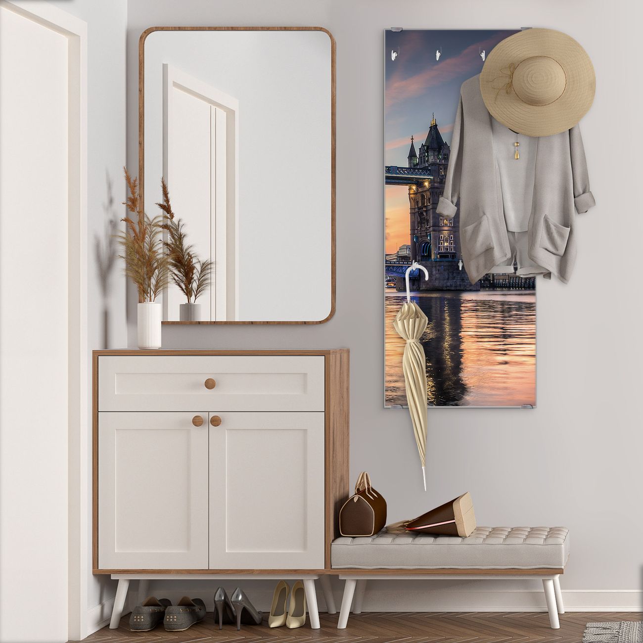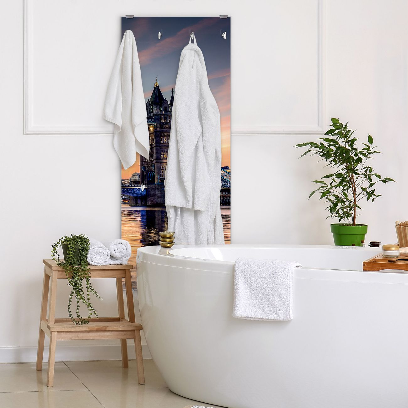FUNKTION: Die banjado Wandgarderobe mit Motiv Tower Bridge ist Ihr täglicher Begleiter. Zuverlässig hängen hier Ihre Jacken und Mäntel griffbereit. Das Echtglas ist Ihr Paneel auch beschreibbar und wieder abwischbar. DESIGN: Sie erhalten eine Garderobenleiste aus elegantem Echtglas mit dem Farbbrillanten Motiv Tower Bridge hinterklebt. Das Design ist zeitlos klassisch, ohne dabei auf Funktionalität zu verzichten. Suchen Sie aus einer Vielzahl von Motiven das für Ihre Einrichtung Passende aus. DETAILS: Die Flurgarderobe besteht aus 4mm gehärtetem Sicherheitsglas. Sie ist 50cm breit, 125cm hoch und 6cm tief. Die Garderobenhaken zur Selbstmontage präsentieren sich in Edelstahl-Optik, ebenso die Abstandshalter für die Wandmontage. Ihre neue Garderobe ist sofort einsatzbereit. NUTZEN: Ihre neue Garderobe hält nicht nur zuverlässig Ihre Kleidung, sie ist auch optisch ein Blickfang. Durch das Glas können Sie an der Garderobe mit wasserlöslichen Kreidestiften oder Whiteboard-Markern auch Nachrichten hinterlassen. BANJADO: Wir sind ein kleines kreatives Team aus Sachsen und entwickeln Produkte die Design und Funktionalität verbinden sollen. Viel Freude mit Ihrer neuen Garderobe wünscht das banjado-Team!