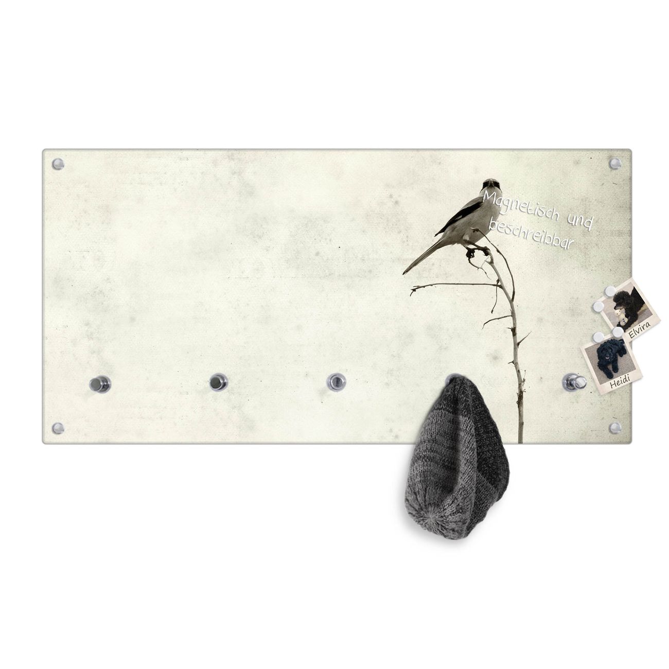 Bitte beachten Sie, dass an dieser Garderobe nur starke Neodym-Magnete halten! FUNKTION: Die banjado Wandgarderobe mit Motiv Tristessa ist Ihr täglicher Begleiter. Zuverlässig hängen hier Ihre Jacken und Mäntel griffbereit. Gleichzeitig ist die Design Garderobe magnetisch, Sie können Notizen anheften und durch das Echtglas ist Ihr Paneel auch beschreibbar und wieder abwischbar. DESIGN: Sie erhalten eine Garderobenleiste aus elegantem Echtglas mit dem Farbbrillanten Motiv Tristessa hinterklebt. Das Design ist zeitlos klassisch, ohne dabei auf Funktionalität zu verzichten. Suchen Sie aus einer Vielzahl von Motiven das für Ihre Einrichtung Passende aus. DETAILS: Die Flurgarderobe besteht aus 4mm gehärtetem Sicherheitsglas. Sie ist 80cm breit, 40cm hoch und 6cm tief. Die Garderobenhaken zur Selbstmontage präsentieren sich in Edelstahl-Optik, ebenso die Abstandshalter für die Wandmontage. Ihre neue Garderobe ist sofort einsatzbereit. NUTZEN: Ihre neue Garderobe hält nicht nur zuverlässig Ihre Kleidung, sie ist auch optisch ein Blickfang. Durch die magnetische Wirkung können Sie mit 4 beigefügten extrastarken Neodym-Magneten Notizen anheften und mit wasserlöslichen Kreidestiften oder Whiteboard-Markern auch Nachrichten hinterlassen. BANJADO: Wir sind ein kleines kreatives Team aus Sachsen und entwickeln Produkte die Design und Funktionalität verbinden sollen. Viel Freude mit Ihrer neuen Garderobe wünscht das banjado-Team!