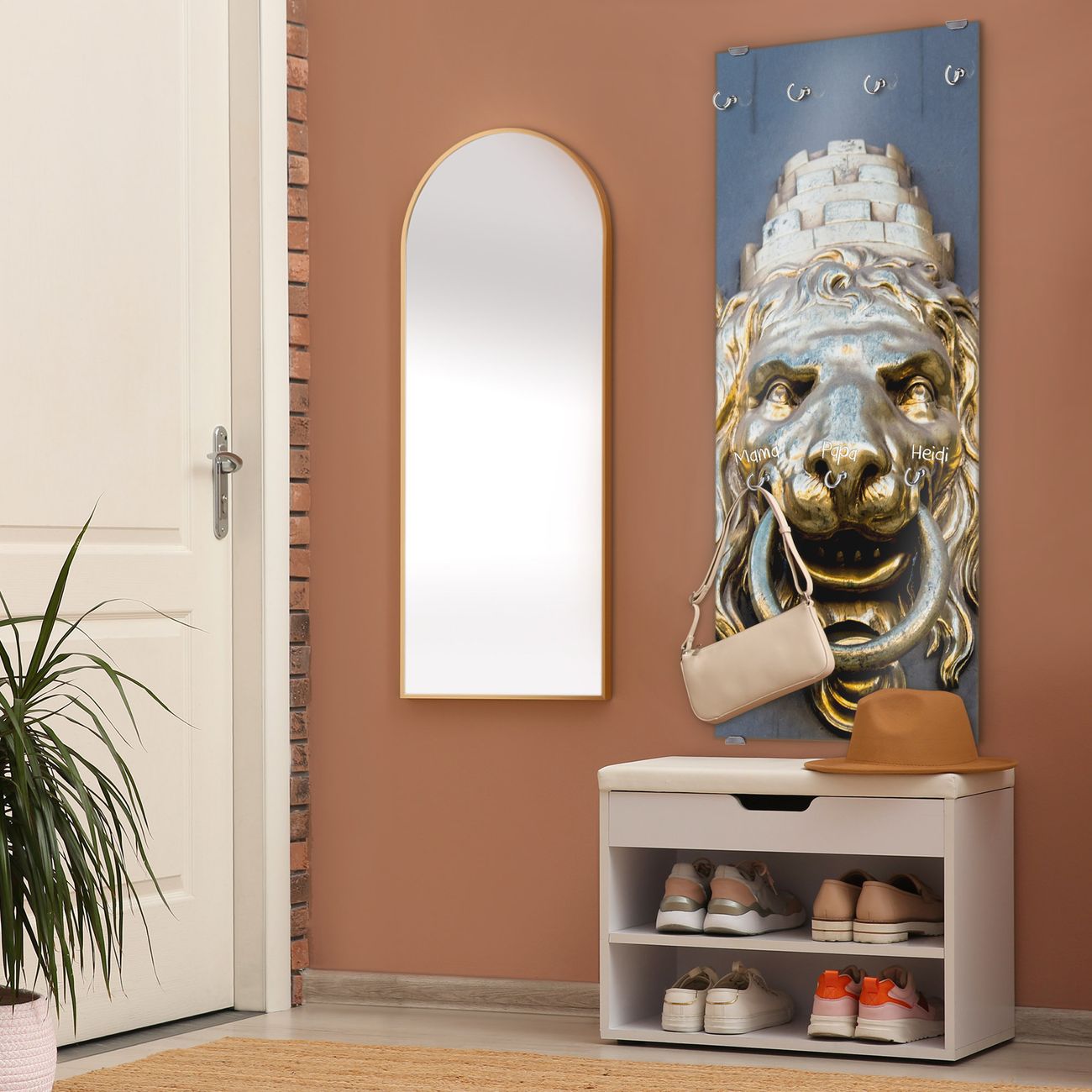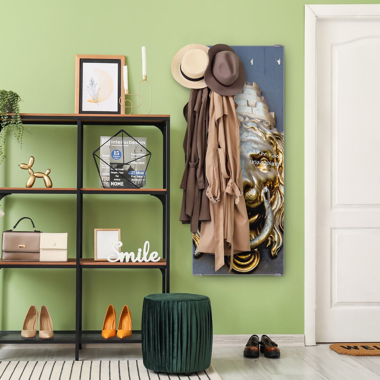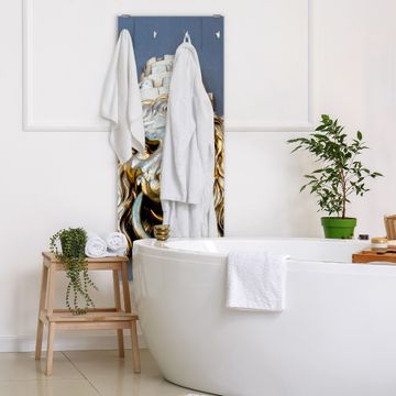 FUNKTION: Die banjado Wandgarderobe mit Motiv Türklopfer Löwe ist Ihr täglicher Begleiter. Zuverlässig hängen hier Ihre Jacken und Mäntel griffbereit. Das Echtglas ist Ihr Paneel auch beschreibbar und wieder abwischbar. DESIGN: Sie erhalten eine Garderobenleiste aus elegantem Echtglas mit dem Farbbrillanten Motiv Türklopfer Löwe hinterklebt. Das Design ist zeitlos klassisch, ohne dabei auf Funktionalität zu verzichten. Suchen Sie aus einer Vielzahl von Motiven das für Ihre Einrichtung Passende aus. DETAILS: Die Flurgarderobe besteht aus 4mm gehärtetem Sicherheitsglas. Sie ist 50cm breit, 125cm hoch und 6cm tief. Die Garderobenhaken zur Selbstmontage präsentieren sich in Edelstahl-Optik, ebenso die Abstandshalter für die Wandmontage. Ihre neue Garderobe ist sofort einsatzbereit. NUTZEN: Ihre neue Garderobe hält nicht nur zuverlässig Ihre Kleidung, sie ist auch optisch ein Blickfang. Durch das Glas können Sie an der Garderobe mit wasserlöslichen Kreidestiften oder Whiteboard-Markern auch Nachrichten hinterlassen. BANJADO: Wir sind ein kleines kreatives Team aus Sachsen und entwickeln Produkte die Design und Funktionalität verbinden sollen. Viel Freude mit Ihrer neuen Garderobe wünscht das banjado-Team!