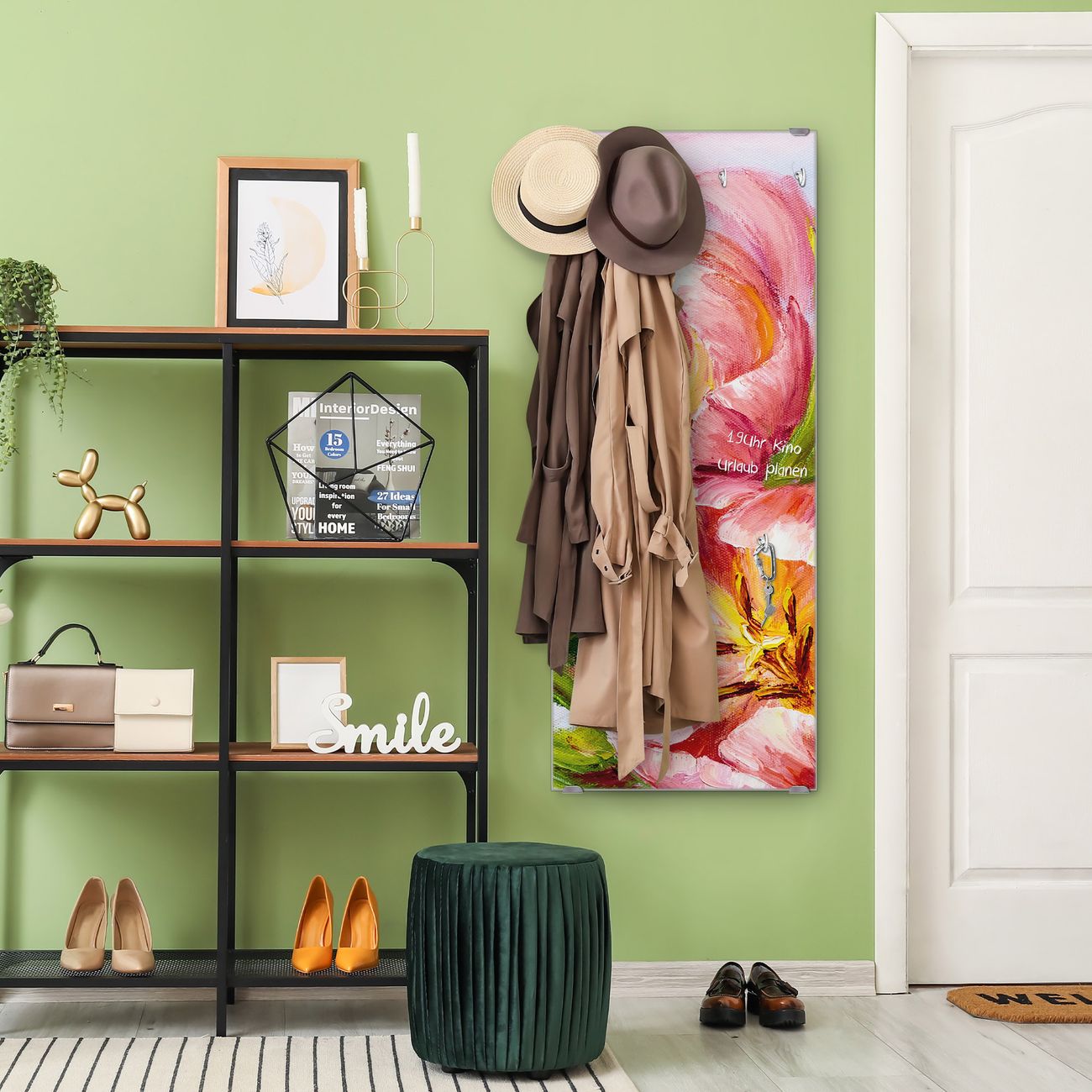 FUNKTION: Die banjado Wandgarderobe mit Motiv Tulpen Detail ist Ihr täglicher Begleiter. Zuverlässig hängen hier Ihre Jacken und Mäntel griffbereit. Das Echtglas ist Ihr Paneel auch beschreibbar und wieder abwischbar. DESIGN: Sie erhalten eine Garderobenleiste aus elegantem Echtglas mit dem Farbbrillanten Motiv Tulpen Detail hinterklebt. Das Design ist zeitlos klassisch, ohne dabei auf Funktionalität zu verzichten. Suchen Sie aus einer Vielzahl von Motiven das für Ihre Einrichtung Passende aus. DETAILS: Die Flurgarderobe besteht aus 4mm gehärtetem Sicherheitsglas. Sie ist 50cm breit, 125cm hoch und 6cm tief. Die Garderobenhaken zur Selbstmontage präsentieren sich in Edelstahl-Optik, ebenso die Abstandshalter für die Wandmontage. Ihre neue Garderobe ist sofort einsatzbereit. NUTZEN: Ihre neue Garderobe hält nicht nur zuverlässig Ihre Kleidung, sie ist auch optisch ein Blickfang. Durch das Glas können Sie an der Garderobe mit wasserlöslichen Kreidestiften oder Whiteboard-Markern auch Nachrichten hinterlassen. BANJADO: Wir sind ein kleines kreatives Team aus Sachsen und entwickeln Produkte die Design und Funktionalität verbinden sollen. Viel Freude mit Ihrer neuen Garderobe wünscht das banjado-Team!
