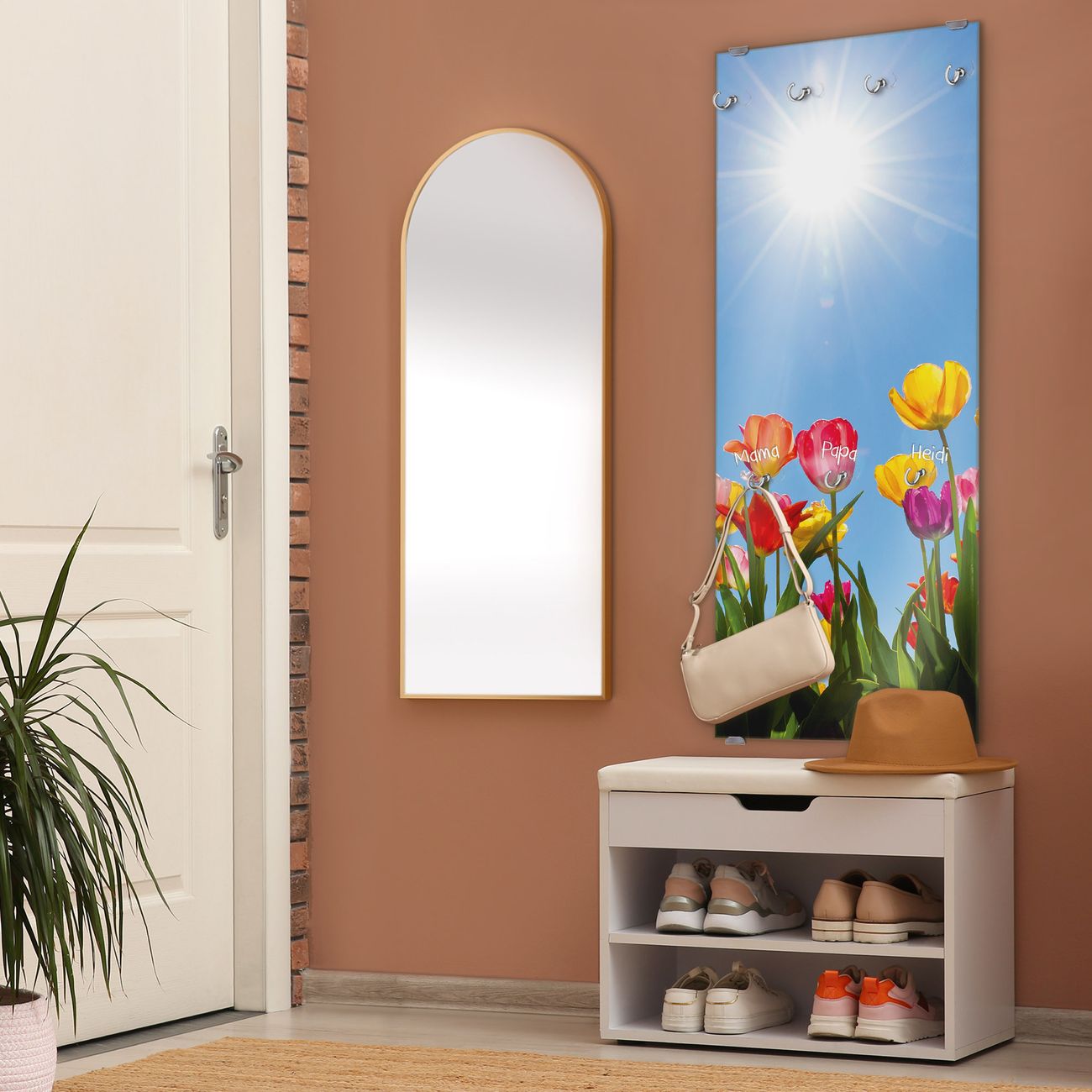 FUNKTION: Die banjado Wandgarderobe mit Motiv Tulpenmeer ist Ihr täglicher Begleiter. Zuverlässig hängen hier Ihre Jacken und Mäntel griffbereit. Das Echtglas ist Ihr Paneel auch beschreibbar und wieder abwischbar. DESIGN: Sie erhalten eine Garderobenleiste aus elegantem Echtglas mit dem Farbbrillanten Motiv Tulpenmeer hinterklebt. Das Design ist zeitlos klassisch, ohne dabei auf Funktionalität zu verzichten. Suchen Sie aus einer Vielzahl von Motiven das für Ihre Einrichtung Passende aus. DETAILS: Die Flurgarderobe besteht aus 4mm gehärtetem Sicherheitsglas. Sie ist 50cm breit, 125cm hoch und 6cm tief. Die Garderobenhaken zur Selbstmontage präsentieren sich in Edelstahl-Optik, ebenso die Abstandshalter für die Wandmontage. Ihre neue Garderobe ist sofort einsatzbereit. NUTZEN: Ihre neue Garderobe hält nicht nur zuverlässig Ihre Kleidung, sie ist auch optisch ein Blickfang. Durch das Glas können Sie an der Garderobe mit wasserlöslichen Kreidestiften oder Whiteboard-Markern auch Nachrichten hinterlassen. BANJADO: Wir sind ein kleines kreatives Team aus Sachsen und entwickeln Produkte die Design und Funktionalität verbinden sollen. Viel Freude mit Ihrer neuen Garderobe wünscht das banjado-Team!