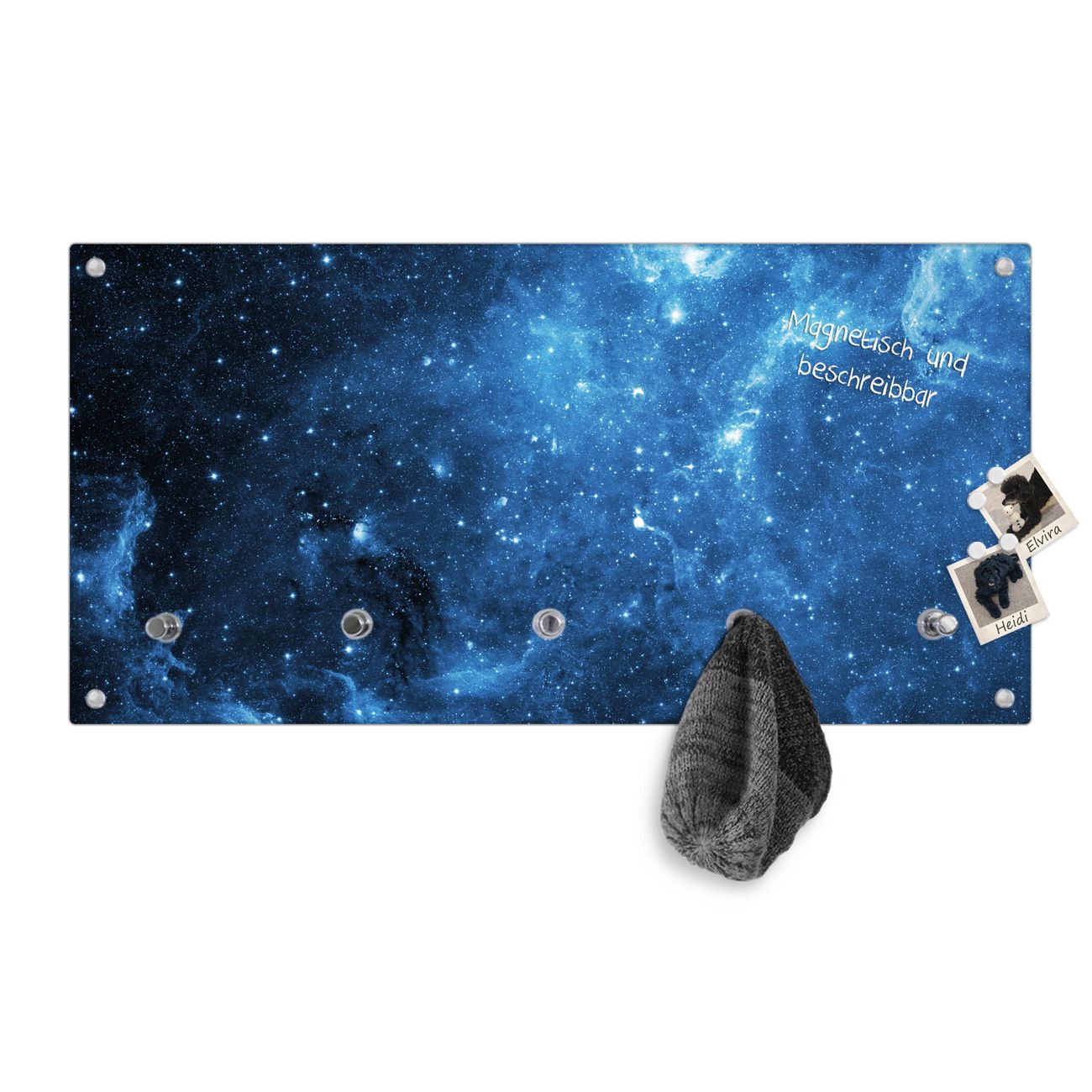 Bitte beachten Sie, dass an dieser Garderobe nur starke Neodym-Magnete halten! FUNKTION: Die banjado Wandgarderobe mit Motiv Universum ist Ihr täglicher Begleiter. Zuverlässig hängen hier Ihre Jacken und Mäntel griffbereit. Gleichzeitig ist die Design Garderobe magnetisch, Sie können Notizen anheften und durch das Echtglas ist Ihr Paneel auch beschreibbar und wieder abwischbar. DESIGN: Sie erhalten eine Garderobenleiste aus elegantem Echtglas mit dem Farbbrillanten Motiv Universum hinterklebt. Das Design ist zeitlos klassisch, ohne dabei auf Funktionalität zu verzichten. Suchen Sie aus einer Vielzahl von Motiven das für Ihre Einrichtung Passende aus. DETAILS: Die Flurgarderobe besteht aus 4mm gehärtetem Sicherheitsglas. Sie ist 80cm breit, 40cm hoch und 6cm tief. Die Garderobenhaken zur Selbstmontage präsentieren sich in Edelstahl-Optik, ebenso die Abstandshalter für die Wandmontage. Ihre neue Garderobe ist sofort einsatzbereit. NUTZEN: Ihre neue Garderobe hält nicht nur zuverlässig Ihre Kleidung, sie ist auch optisch ein Blickfang. Durch die magnetische Wirkung können Sie mit 4 beigefügten extrastarken Neodym-Magneten Notizen anheften und mit wasserlöslichen Kreidestiften oder Whiteboard-Markern auch Nachrichten hinterlassen. BANJADO: Wir sind ein kleines kreatives Team aus Sachsen und entwickeln Produkte die Design und Funktionalität verbinden sollen. Viel Freude mit Ihrer neuen Garderobe wünscht das banjado-Team!