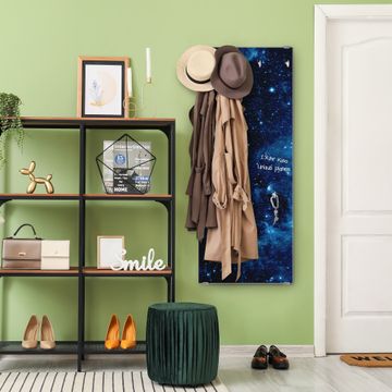 FUNKTION: Die banjado Wandgarderobe mit Motiv Universum ist Ihr täglicher Begleiter. Zuverlässig hängen hier Ihre Jacken und Mäntel griffbereit. Das Echtglas ist Ihr Paneel auch beschreibbar und wieder abwischbar. DESIGN: Sie erhalten eine Garderobenleiste aus elegantem Echtglas mit dem Farbbrillanten Motiv Universum hinterklebt. Das Design ist zeitlos klassisch, ohne dabei auf Funktionalität zu verzichten. Suchen Sie aus einer Vielzahl von Motiven das für Ihre Einrichtung Passende aus. DETAILS: Die Flurgarderobe besteht aus 4mm gehärtetem Sicherheitsglas. Sie ist 50cm breit, 125cm hoch und 6cm tief. Die Garderobenhaken zur Selbstmontage präsentieren sich in Edelstahl-Optik, ebenso die Abstandshalter für die Wandmontage. Ihre neue Garderobe ist sofort einsatzbereit. NUTZEN: Ihre neue Garderobe hält nicht nur zuverlässig Ihre Kleidung, sie ist auch optisch ein Blickfang. Durch das Glas können Sie an der Garderobe mit wasserlöslichen Kreidestiften oder Whiteboard-Markern auch Nachrichten hinterlassen. BANJADO: Wir sind ein kleines kreatives Team aus Sachsen und entwickeln Produkte die Design und Funktionalität verbinden sollen. Viel Freude mit Ihrer neuen Garderobe wünscht das banjado-Team!