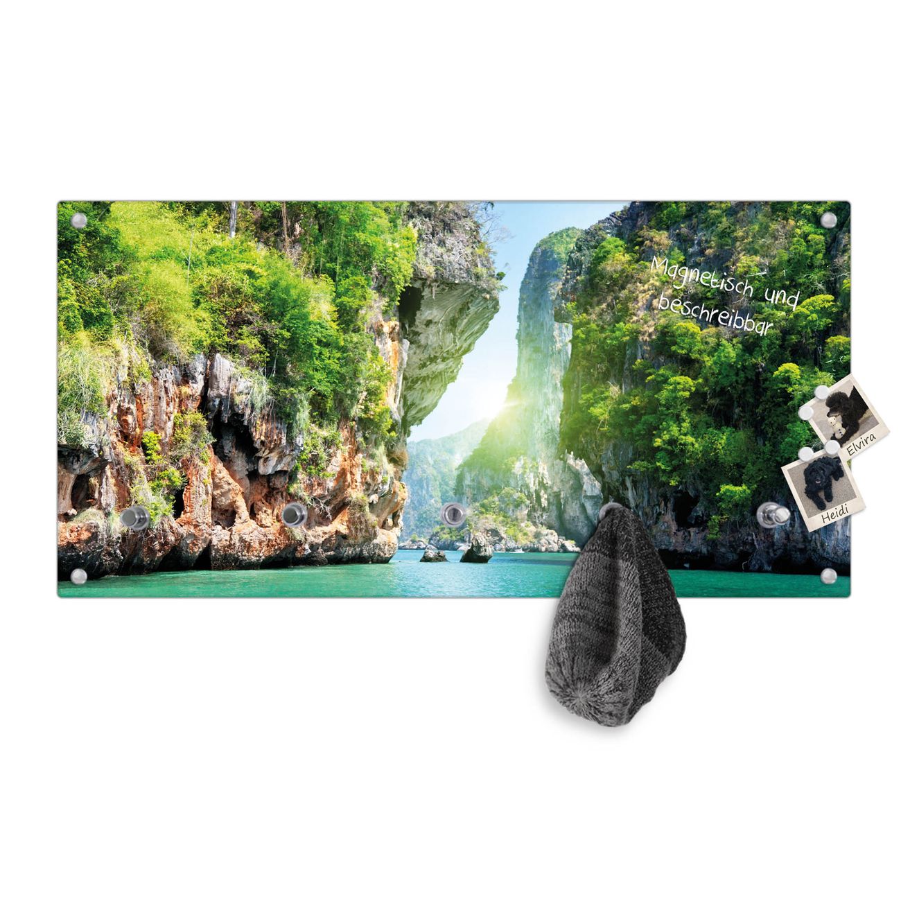 Bitte beachten Sie, dass an dieser Garderobe nur starke Neodym-Magnete halten! FUNKTION: Die banjado Wandgarderobe mit Motiv Versteckte Bucht ist Ihr täglicher Begleiter. Zuverlässig hängen hier Ihre Jacken und Mäntel griffbereit. Gleichzeitig ist die Design Garderobe magnetisch, Sie können Notizen anheften und durch das Echtglas ist Ihr Paneel auch beschreibbar und wieder abwischbar. DESIGN: Sie erhalten eine Garderobenleiste aus elegantem Echtglas mit dem Farbbrillanten Motiv Versteckte Bucht hinterklebt. Das Design ist zeitlos klassisch, ohne dabei auf Funktionalität zu verzichten. Suchen Sie aus einer Vielzahl von Motiven das für Ihre Einrichtung Passende aus. DETAILS: Die Flurgarderobe besteht aus 4mm gehärtetem Sicherheitsglas. Sie ist 80cm breit, 40cm hoch und 6cm tief. Die Garderobenhaken zur Selbstmontage präsentieren sich in Edelstahl-Optik, ebenso die Abstandshalter für die Wandmontage. Ihre neue Garderobe ist sofort einsatzbereit. NUTZEN: Ihre neue Garderobe hält nicht nur zuverlässig Ihre Kleidung, sie ist auch optisch ein Blickfang. Durch die magnetische Wirkung können Sie mit 4 beigefügten extrastarken Neodym-Magneten Notizen anheften und mit wasserlöslichen Kreidestiften oder Whiteboard-Markern auch Nachrichten hinterlassen. BANJADO: Wir sind ein kleines kreatives Team aus Sachsen und entwickeln Produkte die Design und Funktionalität verbinden sollen. Viel Freude mit Ihrer neuen Garderobe wünscht das banjado-Team!