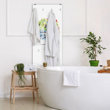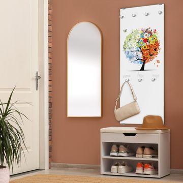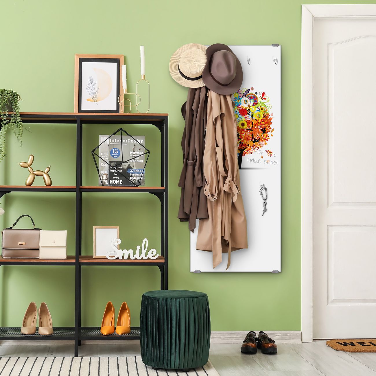 FUNKTION: Die banjado Wandgarderobe mit Motiv Vier Jahreszeiten ist Ihr täglicher Begleiter. Zuverlässig hängen hier Ihre Jacken und Mäntel griffbereit. Das Echtglas ist Ihr Paneel auch beschreibbar und wieder abwischbar. DESIGN: Sie erhalten eine Garderobenleiste aus elegantem Echtglas mit dem Farbbrillanten Motiv Vier Jahreszeiten hinterklebt. Das Design ist zeitlos klassisch, ohne dabei auf Funktionalität zu verzichten. Suchen Sie aus einer Vielzahl von Motiven das für Ihre Einrichtung Passende aus. DETAILS: Die Flurgarderobe besteht aus 4mm gehärtetem Sicherheitsglas. Sie ist 50cm breit, 125cm hoch und 6cm tief. Die Garderobenhaken zur Selbstmontage präsentieren sich in Edelstahl-Optik, ebenso die Abstandshalter für die Wandmontage. Ihre neue Garderobe ist sofort einsatzbereit. NUTZEN: Ihre neue Garderobe hält nicht nur zuverlässig Ihre Kleidung, sie ist auch optisch ein Blickfang. Durch das Glas können Sie an der Garderobe mit wasserlöslichen Kreidestiften oder Whiteboard-Markern auch Nachrichten hinterlassen. BANJADO: Wir sind ein kleines kreatives Team aus Sachsen und entwickeln Produkte die Design und Funktionalität verbinden sollen. Viel Freude mit Ihrer neuen Garderobe wünscht das banjado-Team!