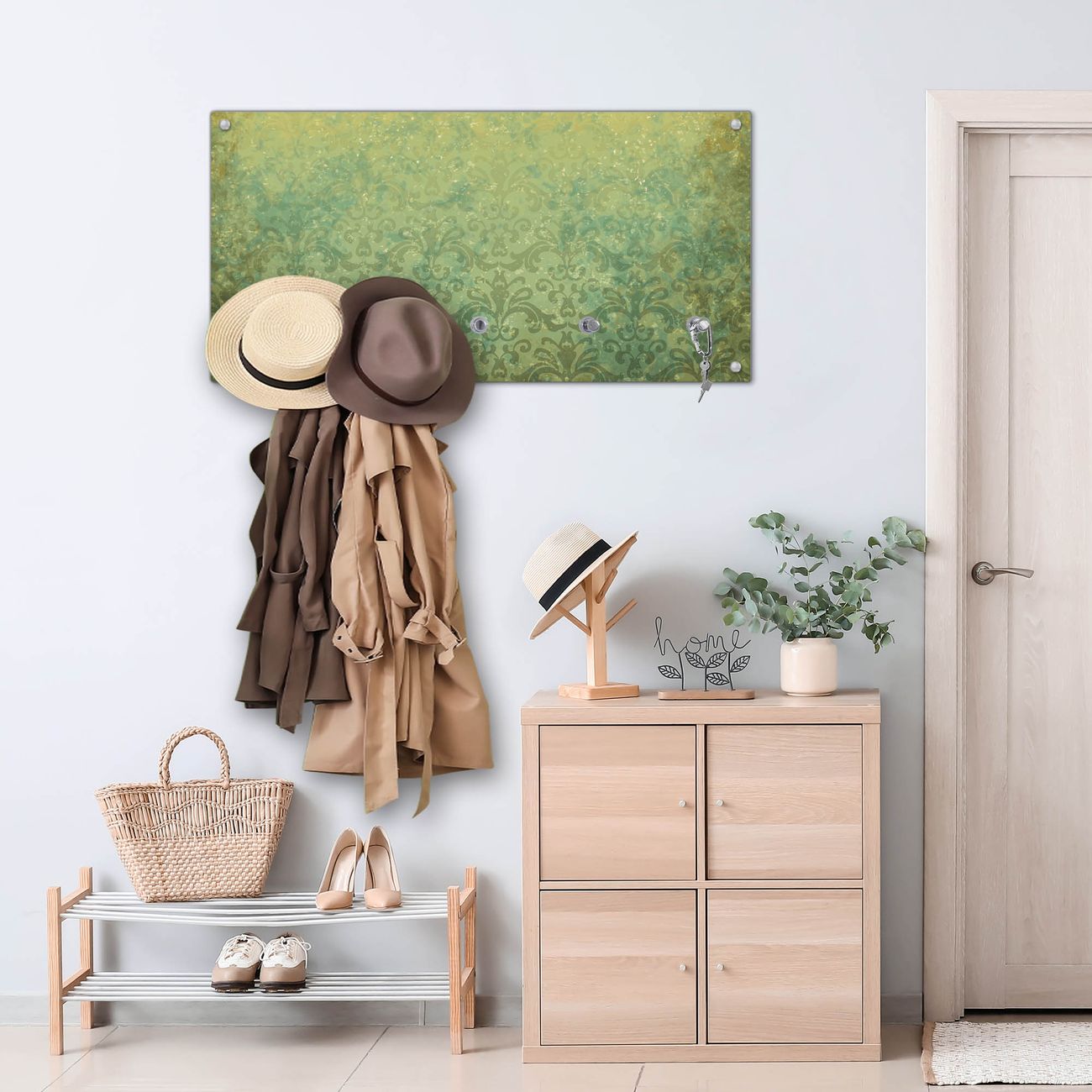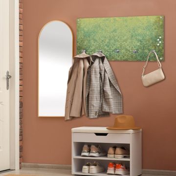 Bitte beachten Sie, dass an dieser Garderobe nur starke Neodym-Magnete halten! FUNKTION: Die banjado Wandgarderobe mit Motiv Vintage Messing ist Ihr täglicher Begleiter. Zuverlässig hängen hier Ihre Jacken und Mäntel griffbereit. Gleichzeitig ist die Design Garderobe magnetisch, Sie können Notizen anheften und durch das Echtglas ist Ihr Paneel auch beschreibbar und wieder abwischbar. DESIGN: Sie erhalten eine Garderobenleiste aus elegantem Echtglas mit dem Farbbrillanten Motiv Vintage Messing hinterklebt. Das Design ist zeitlos klassisch, ohne dabei auf Funktionalität zu verzichten. Suchen Sie aus einer Vielzahl von Motiven das für Ihre Einrichtung Passende aus. DETAILS: Die Flurgarderobe besteht aus 4mm gehärtetem Sicherheitsglas. Sie ist 80cm breit, 40cm hoch und 6cm tief. Die Garderobenhaken zur Selbstmontage präsentieren sich in Edelstahl-Optik, ebenso die Abstandshalter für die Wandmontage. Ihre neue Garderobe ist sofort einsatzbereit. NUTZEN: Ihre neue Garderobe hält nicht nur zuverlässig Ihre Kleidung, sie ist auch optisch ein Blickfang. Durch die magnetische Wirkung können Sie mit 4 beigefügten extrastarken Neodym-Magneten Notizen anheften und mit wasserlöslichen Kreidestiften oder Whiteboard-Markern auch Nachrichten hinterlassen. BANJADO: Wir sind ein kleines kreatives Team aus Sachsen und entwickeln Produkte die Design und Funktionalität verbinden sollen. Viel Freude mit Ihrer neuen Garderobe wünscht das banjado-Team!