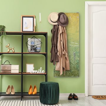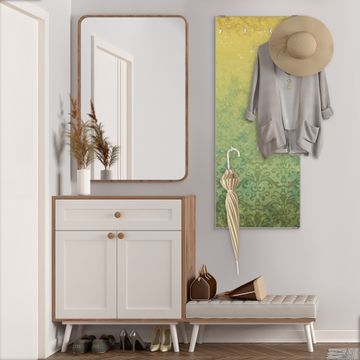 FUNKTION: Die banjado Wandgarderobe mit Motiv Vintage Messing ist Ihr täglicher Begleiter. Zuverlässig hängen hier Ihre Jacken und Mäntel griffbereit. Das Echtglas ist Ihr Paneel auch beschreibbar und wieder abwischbar. DESIGN: Sie erhalten eine Garderobenleiste aus elegantem Echtglas mit dem Farbbrillanten Motiv Vintage Messing hinterklebt. Das Design ist zeitlos klassisch, ohne dabei auf Funktionalität zu verzichten. Suchen Sie aus einer Vielzahl von Motiven das für Ihre Einrichtung Passende aus. DETAILS: Die Flurgarderobe besteht aus 4mm gehärtetem Sicherheitsglas. Sie ist 50cm breit, 125cm hoch und 6cm tief. Die Garderobenhaken zur Selbstmontage präsentieren sich in Edelstahl-Optik, ebenso die Abstandshalter für die Wandmontage. Ihre neue Garderobe ist sofort einsatzbereit. NUTZEN: Ihre neue Garderobe hält nicht nur zuverlässig Ihre Kleidung, sie ist auch optisch ein Blickfang. Durch das Glas können Sie an der Garderobe mit wasserlöslichen Kreidestiften oder Whiteboard-Markern auch Nachrichten hinterlassen. BANJADO: Wir sind ein kleines kreatives Team aus Sachsen und entwickeln Produkte die Design und Funktionalität verbinden sollen. Viel Freude mit Ihrer neuen Garderobe wünscht das banjado-Team!