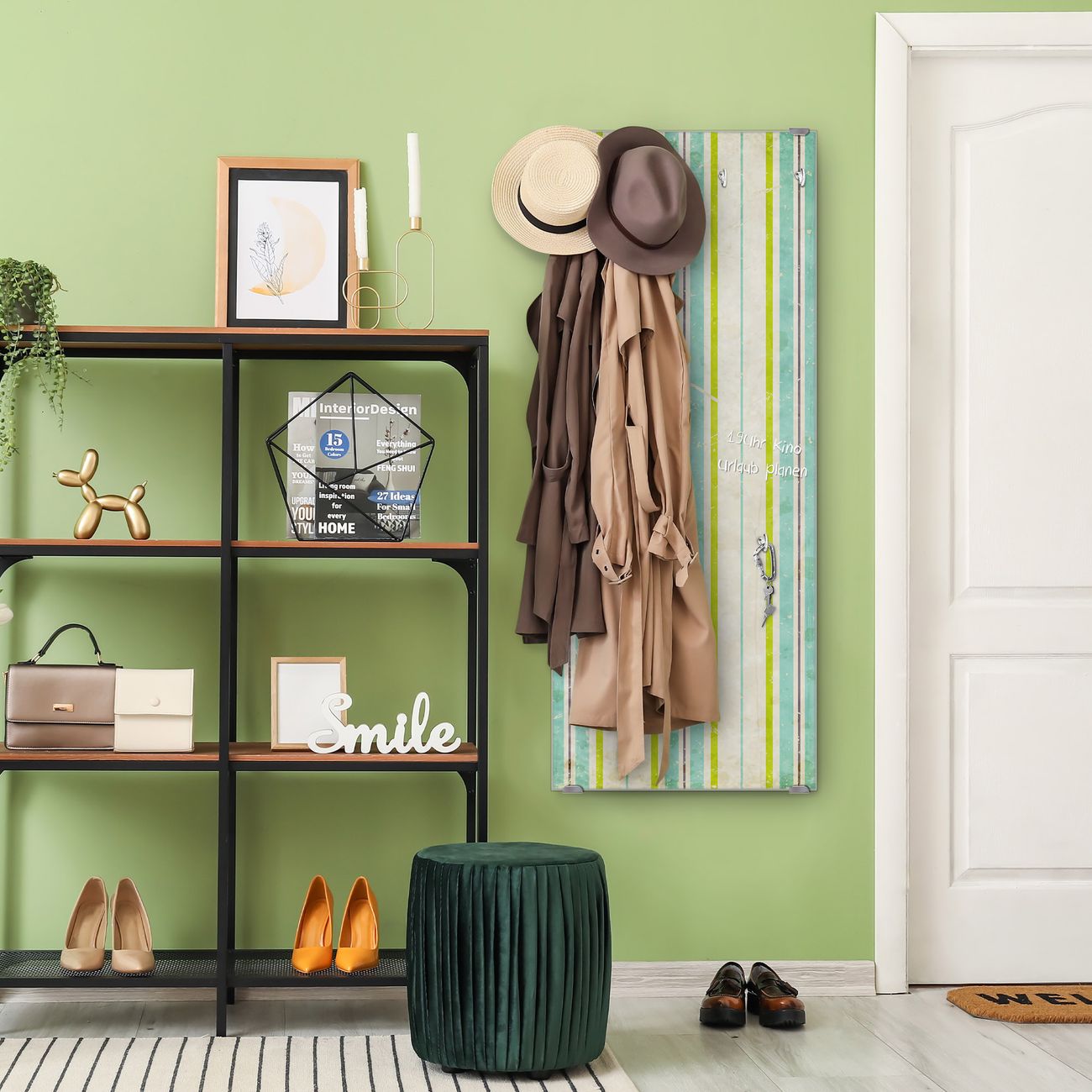 FUNKTION: Die banjado Wandgarderobe mit Motiv Vintage Streifenmuster ist Ihr täglicher Begleiter. Zuverlässig hängen hier Ihre Jacken und Mäntel griffbereit. Das Echtglas ist Ihr Paneel auch beschreibbar und wieder abwischbar. DESIGN: Sie erhalten eine Garderobenleiste aus elegantem Echtglas mit dem Farbbrillanten Motiv Vintage Streifenmuster hinterklebt. Das Design ist zeitlos klassisch, ohne dabei auf Funktionalität zu verzichten. Suchen Sie aus einer Vielzahl von Motiven das für Ihre Einrichtung Passende aus. DETAILS: Die Flurgarderobe besteht aus 4mm gehärtetem Sicherheitsglas. Sie ist 50cm breit, 125cm hoch und 6cm tief. Die Garderobenhaken zur Selbstmontage präsentieren sich in Edelstahl-Optik, ebenso die Abstandshalter für die Wandmontage. Ihre neue Garderobe ist sofort einsatzbereit. NUTZEN: Ihre neue Garderobe hält nicht nur zuverlässig Ihre Kleidung, sie ist auch optisch ein Blickfang. Durch das Glas können Sie an der Garderobe mit wasserlöslichen Kreidestiften oder Whiteboard-Markern auch Nachrichten hinterlassen. BANJADO: Wir sind ein kleines kreatives Team aus Sachsen und entwickeln Produkte die Design und Funktionalität verbinden sollen. Viel Freude mit Ihrer neuen Garderobe wünscht das banjado-Team!
