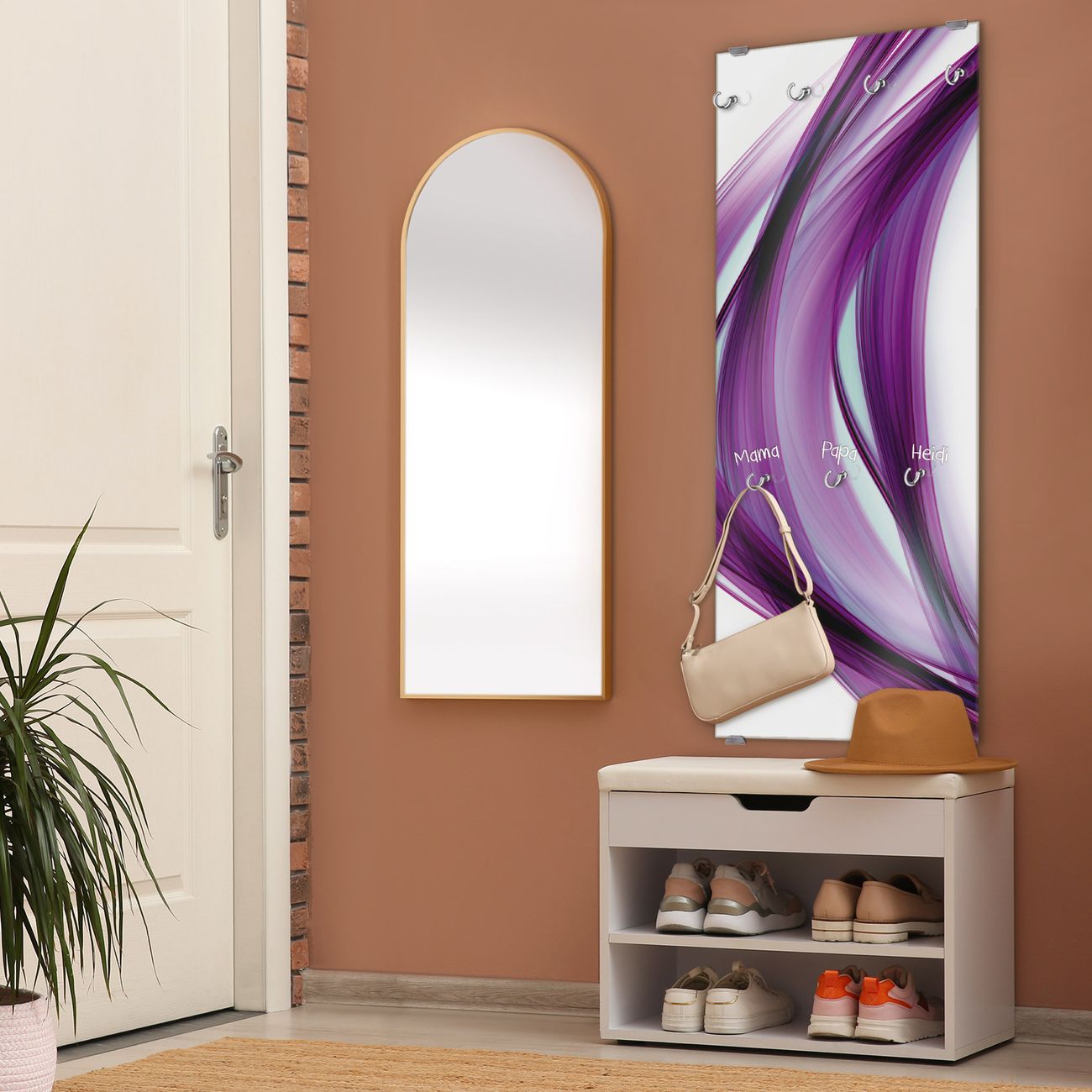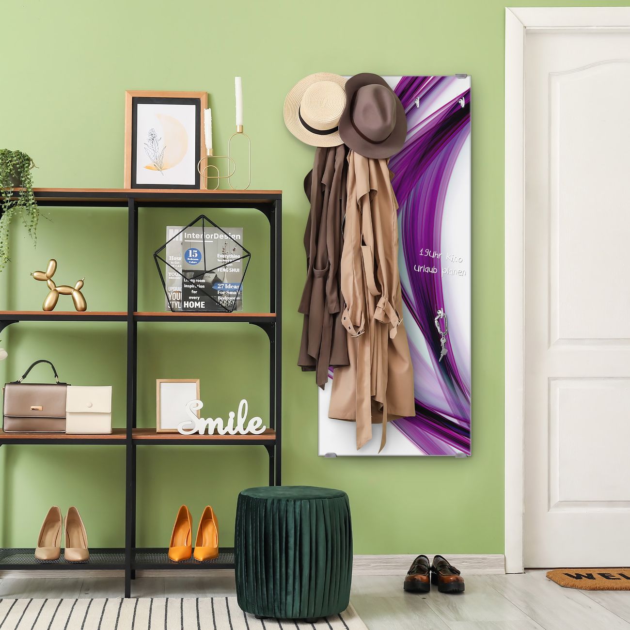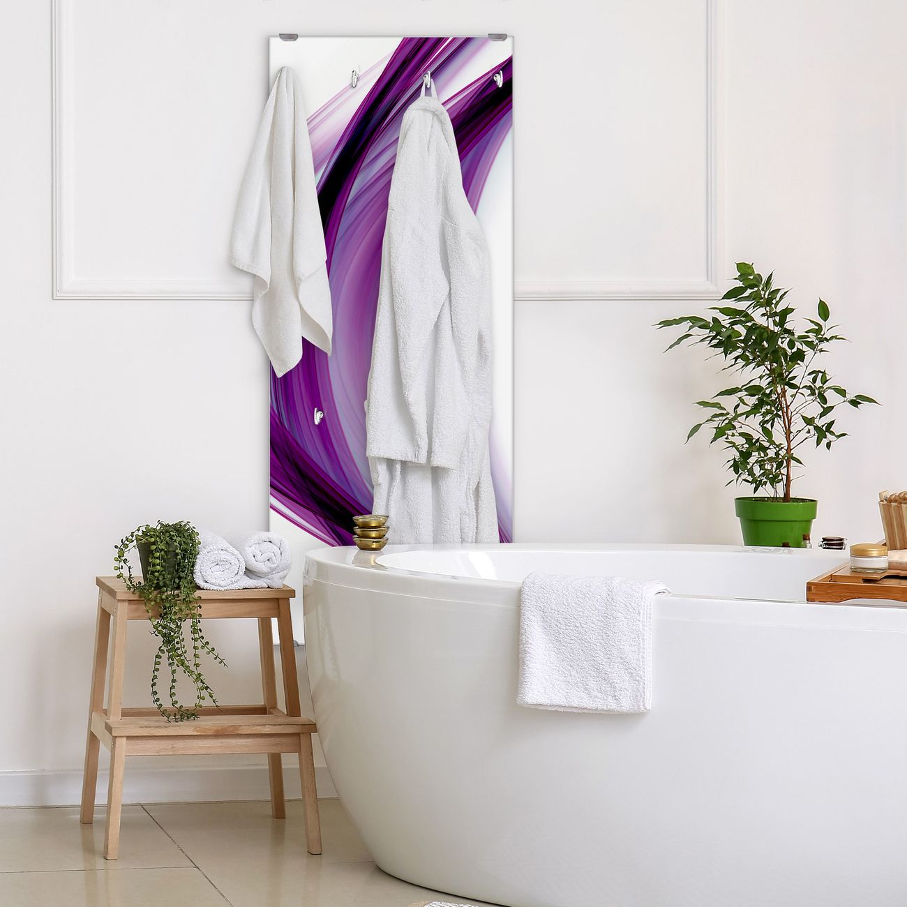 FUNKTION: Die banjado Wandgarderobe mit Motiv Violet Element ist Ihr täglicher Begleiter. Zuverlässig hängen hier Ihre Jacken und Mäntel griffbereit. Das Echtglas ist Ihr Paneel auch beschreibbar und wieder abwischbar. DESIGN: Sie erhalten eine Garderobenleiste aus elegantem Echtglas mit dem Farbbrillanten Motiv Violet Element hinterklebt. Das Design ist zeitlos klassisch, ohne dabei auf Funktionalität zu verzichten. Suchen Sie aus einer Vielzahl von Motiven das für Ihre Einrichtung Passende aus. DETAILS: Die Flurgarderobe besteht aus 4mm gehärtetem Sicherheitsglas. Sie ist 50cm breit, 125cm hoch und 6cm tief. Die Garderobenhaken zur Selbstmontage präsentieren sich in Edelstahl-Optik, ebenso die Abstandshalter für die Wandmontage. Ihre neue Garderobe ist sofort einsatzbereit. NUTZEN: Ihre neue Garderobe hält nicht nur zuverlässig Ihre Kleidung, sie ist auch optisch ein Blickfang. Durch das Glas können Sie an der Garderobe mit wasserlöslichen Kreidestiften oder Whiteboard-Markern auch Nachrichten hinterlassen. BANJADO: Wir sind ein kleines kreatives Team aus Sachsen und entwickeln Produkte die Design und Funktionalität verbinden sollen. Viel Freude mit Ihrer neuen Garderobe wünscht das banjado-Team!