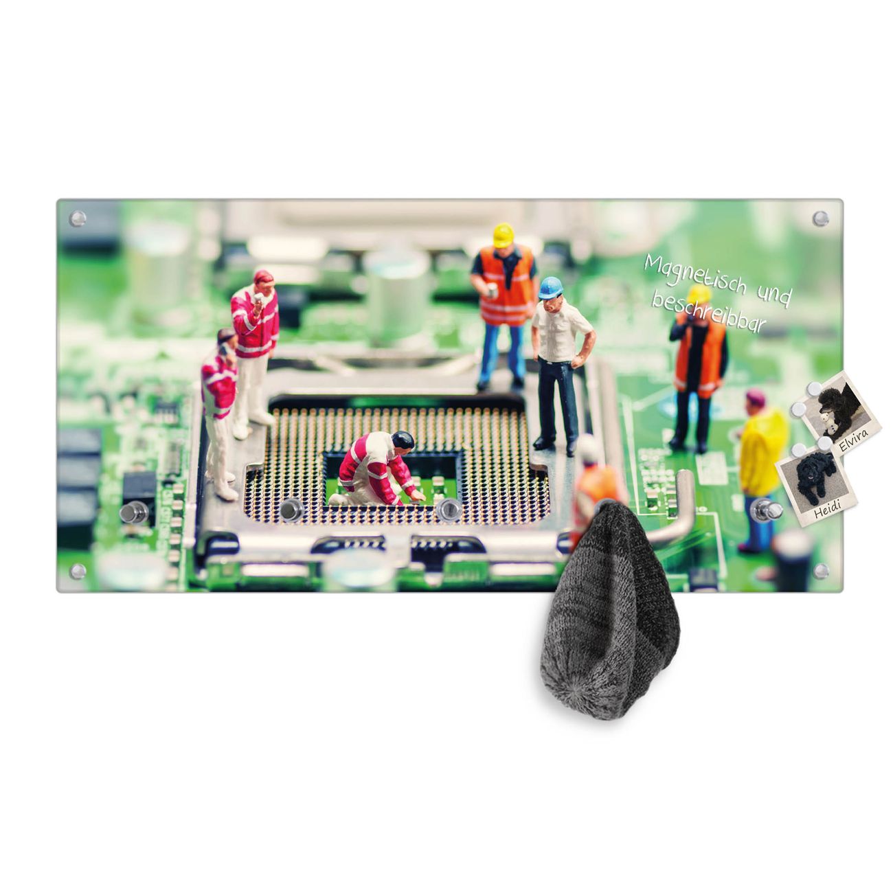 Bitte beachten Sie, dass an dieser Garderobe nur starke Neodym-Magnete halten! FUNKTION: Die banjado Wandgarderobe mit Motiv Wartungsarbeiten ist Ihr täglicher Begleiter. Zuverlässig hängen hier Ihre Jacken und Mäntel griffbereit. Gleichzeitig ist die Design Garderobe magnetisch, Sie können Notizen anheften und durch das Echtglas ist Ihr Paneel auch beschreibbar und wieder abwischbar. DESIGN: Sie erhalten eine Garderobenleiste aus elegantem Echtglas mit dem Farbbrillanten Motiv Wartungsarbeiten hinterklebt. Das Design ist zeitlos klassisch, ohne dabei auf Funktionalität zu verzichten. Suchen Sie aus einer Vielzahl von Motiven das für Ihre Einrichtung Passende aus. DETAILS: Die Flurgarderobe besteht aus 4mm gehärtetem Sicherheitsglas. Sie ist 80cm breit, 40cm hoch und 6cm tief. Die Garderobenhaken zur Selbstmontage präsentieren sich in Edelstahl-Optik, ebenso die Abstandshalter für die Wandmontage. Ihre neue Garderobe ist sofort einsatzbereit. NUTZEN: Ihre neue Garderobe hält nicht nur zuverlässig Ihre Kleidung, sie ist auch optisch ein Blickfang. Durch die magnetische Wirkung können Sie mit 4 beigefügten extrastarken Neodym-Magneten Notizen anheften und mit wasserlöslichen Kreidestiften oder Whiteboard-Markern auch Nachrichten hinterlassen. BANJADO: Wir sind ein kleines kreatives Team aus Sachsen und entwickeln Produkte die Design und Funktionalität verbinden sollen. Viel Freude mit Ihrer neuen Garderobe wünscht das banjado-Team!