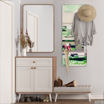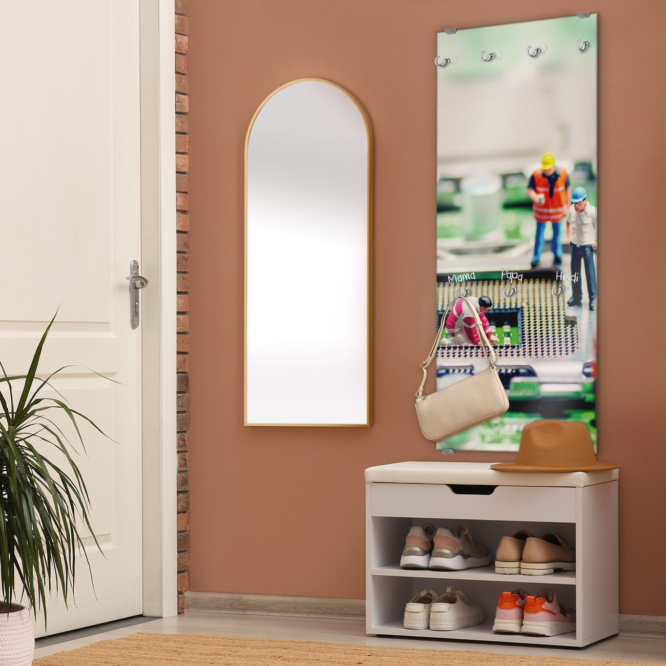 FUNKTION: Die banjado Wandgarderobe mit Motiv Wartungsarbeiten ist Ihr täglicher Begleiter. Zuverlässig hängen hier Ihre Jacken und Mäntel griffbereit. Das Echtglas ist Ihr Paneel auch beschreibbar und wieder abwischbar. DESIGN: Sie erhalten eine Garderobenleiste aus elegantem Echtglas mit dem Farbbrillanten Motiv Wartungsarbeiten hinterklebt. Das Design ist zeitlos klassisch, ohne dabei auf Funktionalität zu verzichten. Suchen Sie aus einer Vielzahl von Motiven das für Ihre Einrichtung Passende aus. DETAILS: Die Flurgarderobe besteht aus 4mm gehärtetem Sicherheitsglas. Sie ist 50cm breit, 125cm hoch und 6cm tief. Die Garderobenhaken zur Selbstmontage präsentieren sich in Edelstahl-Optik, ebenso die Abstandshalter für die Wandmontage. Ihre neue Garderobe ist sofort einsatzbereit. NUTZEN: Ihre neue Garderobe hält nicht nur zuverlässig Ihre Kleidung, sie ist auch optisch ein Blickfang. Durch das Glas können Sie an der Garderobe mit wasserlöslichen Kreidestiften oder Whiteboard-Markern auch Nachrichten hinterlassen. BANJADO: Wir sind ein kleines kreatives Team aus Sachsen und entwickeln Produkte die Design und Funktionalität verbinden sollen. Viel Freude mit Ihrer neuen Garderobe wünscht das banjado-Team!