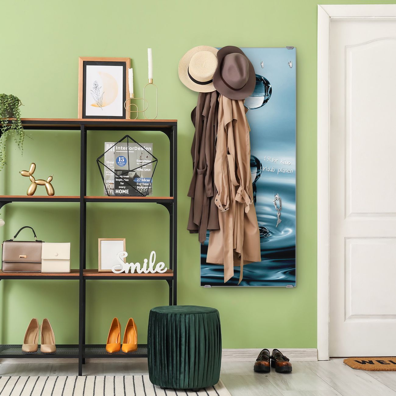 FUNKTION: Die banjado Wandgarderobe mit Motiv Wassertropfen ist Ihr täglicher Begleiter. Zuverlässig hängen hier Ihre Jacken und Mäntel griffbereit. Das Echtglas ist Ihr Paneel auch beschreibbar und wieder abwischbar. DESIGN: Sie erhalten eine Garderobenleiste aus elegantem Echtglas mit dem Farbbrillanten Motiv Wassertropfen hinterklebt. Das Design ist zeitlos klassisch, ohne dabei auf Funktionalität zu verzichten. Suchen Sie aus einer Vielzahl von Motiven das für Ihre Einrichtung Passende aus. DETAILS: Die Flurgarderobe besteht aus 4mm gehärtetem Sicherheitsglas. Sie ist 50cm breit, 125cm hoch und 6cm tief. Die Garderobenhaken zur Selbstmontage präsentieren sich in Edelstahl-Optik, ebenso die Abstandshalter für die Wandmontage. Ihre neue Garderobe ist sofort einsatzbereit. NUTZEN: Ihre neue Garderobe hält nicht nur zuverlässig Ihre Kleidung, sie ist auch optisch ein Blickfang. Durch das Glas können Sie an der Garderobe mit wasserlöslichen Kreidestiften oder Whiteboard-Markern auch Nachrichten hinterlassen. BANJADO: Wir sind ein kleines kreatives Team aus Sachsen und entwickeln Produkte die Design und Funktionalität verbinden sollen. Viel Freude mit Ihrer neuen Garderobe wünscht das banjado-Team!