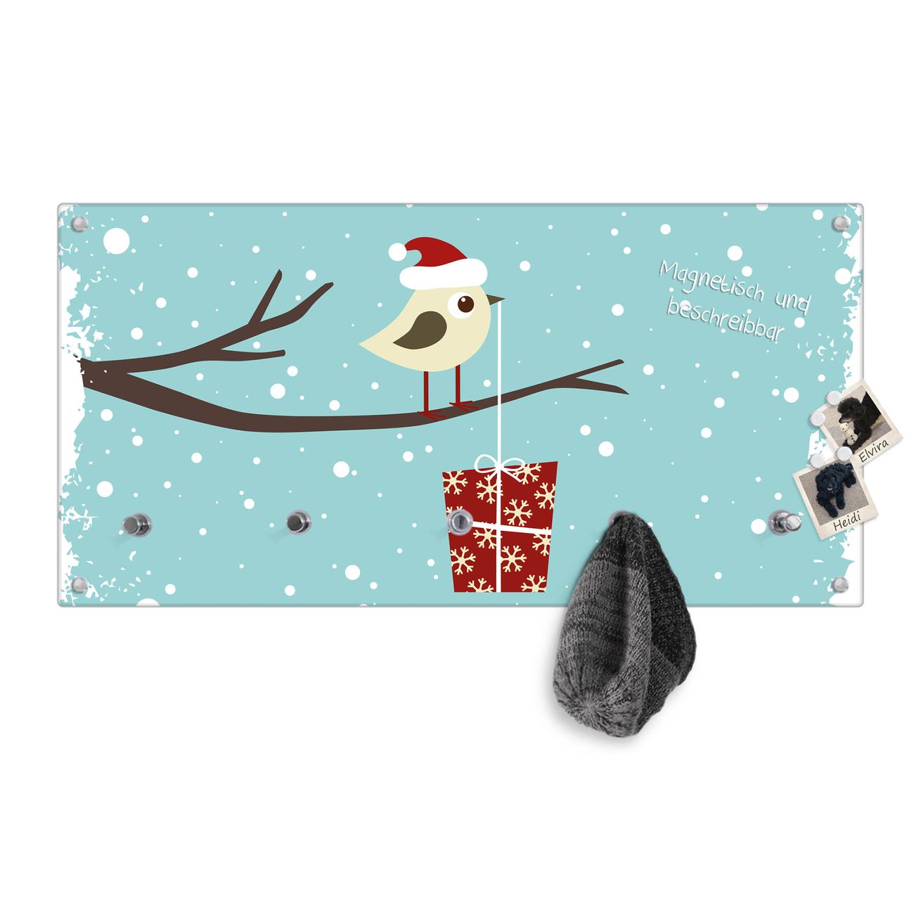 Bitte beachten Sie, dass an dieser Garderobe nur starke Neodym-Magnete halten! FUNKTION: Die banjado Wandgarderobe mit Motiv Weihnachten ist Ihr täglicher Begleiter. Zuverlässig hängen hier Ihre Jacken und Mäntel griffbereit. Gleichzeitig ist die Design Garderobe magnetisch, Sie können Notizen anheften und durch das Echtglas ist Ihr Paneel auch beschreibbar und wieder abwischbar. DESIGN: Sie erhalten eine Garderobenleiste aus elegantem Echtglas mit dem Farbbrillanten Motiv Weihnachten hinterklebt. Das Design ist zeitlos klassisch, ohne dabei auf Funktionalität zu verzichten. Suchen Sie aus einer Vielzahl von Motiven das für Ihre Einrichtung Passende aus. DETAILS: Die Flurgarderobe besteht aus 4mm gehärtetem Sicherheitsglas. Sie ist 80cm breit, 40cm hoch und 6cm tief. Die Garderobenhaken zur Selbstmontage präsentieren sich in Edelstahl-Optik, ebenso die Abstandshalter für die Wandmontage. Ihre neue Garderobe ist sofort einsatzbereit. NUTZEN: Ihre neue Garderobe hält nicht nur zuverlässig Ihre Kleidung, sie ist auch optisch ein Blickfang. Durch die magnetische Wirkung können Sie mit 4 beigefügten extrastarken Neodym-Magneten Notizen anheften und mit wasserlöslichen Kreidestiften oder Whiteboard-Markern auch Nachrichten hinterlassen. BANJADO: Wir sind ein kleines kreatives Team aus Sachsen und entwickeln Produkte die Design und Funktionalität verbinden sollen. Viel Freude mit Ihrer neuen Garderobe wünscht das banjado-Team!