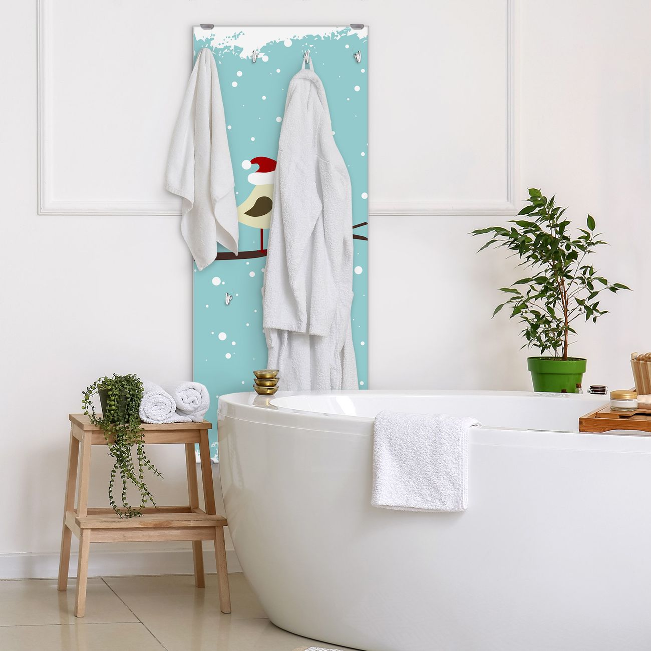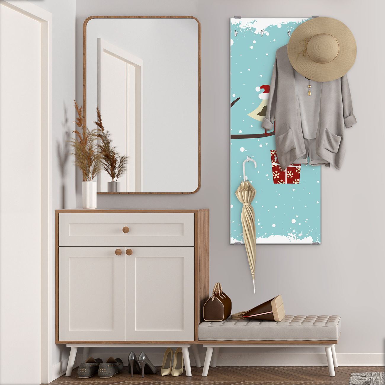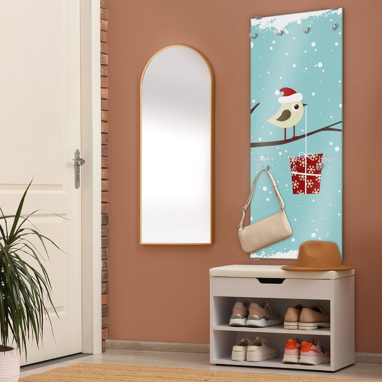 FUNKTION: Die banjado Wandgarderobe mit Motiv Weihnachten ist Ihr täglicher Begleiter. Zuverlässig hängen hier Ihre Jacken und Mäntel griffbereit. Das Echtglas ist Ihr Paneel auch beschreibbar und wieder abwischbar. DESIGN: Sie erhalten eine Garderobenleiste aus elegantem Echtglas mit dem Farbbrillanten Motiv Weihnachten hinterklebt. Das Design ist zeitlos klassisch, ohne dabei auf Funktionalität zu verzichten. Suchen Sie aus einer Vielzahl von Motiven das für Ihre Einrichtung Passende aus. DETAILS: Die Flurgarderobe besteht aus 4mm gehärtetem Sicherheitsglas. Sie ist 50cm breit, 125cm hoch und 6cm tief. Die Garderobenhaken zur Selbstmontage präsentieren sich in Edelstahl-Optik, ebenso die Abstandshalter für die Wandmontage. Ihre neue Garderobe ist sofort einsatzbereit. NUTZEN: Ihre neue Garderobe hält nicht nur zuverlässig Ihre Kleidung, sie ist auch optisch ein Blickfang. Durch das Glas können Sie an der Garderobe mit wasserlöslichen Kreidestiften oder Whiteboard-Markern auch Nachrichten hinterlassen. BANJADO: Wir sind ein kleines kreatives Team aus Sachsen und entwickeln Produkte die Design und Funktionalität verbinden sollen. Viel Freude mit Ihrer neuen Garderobe wünscht das banjado-Team!