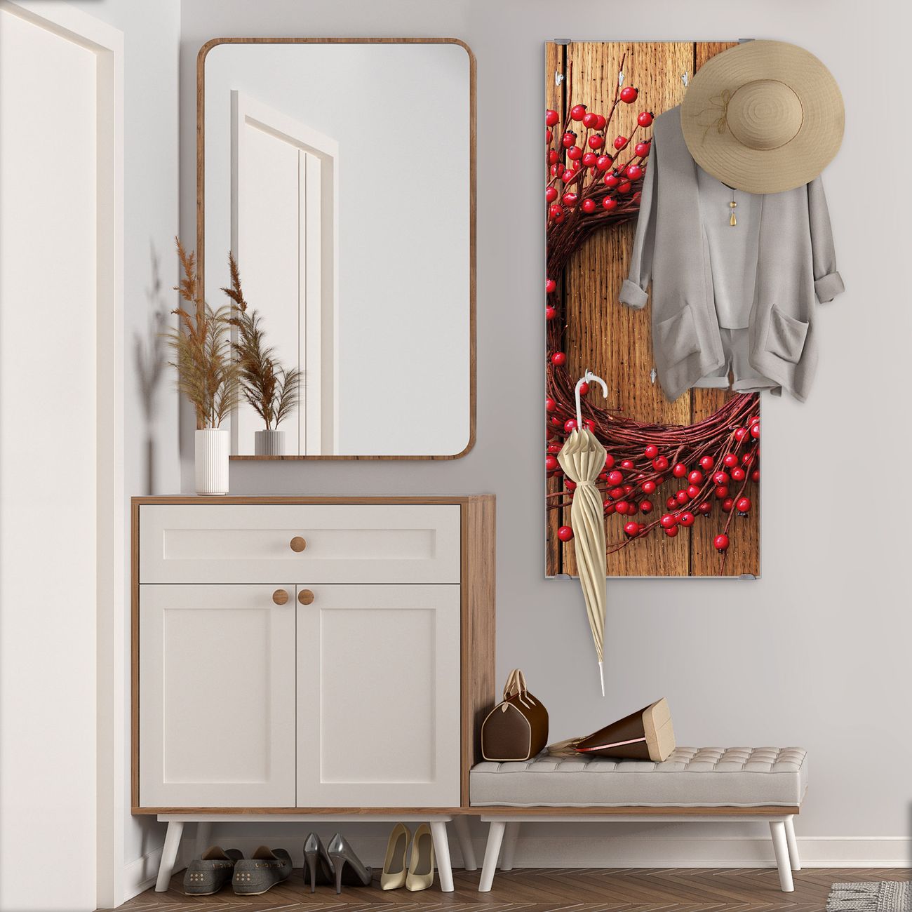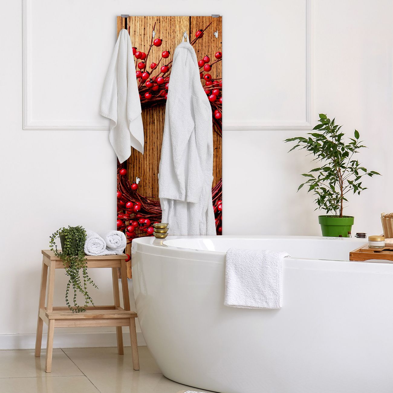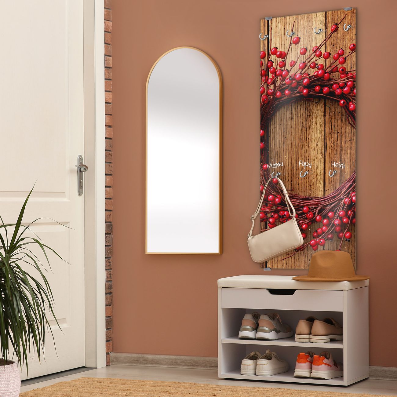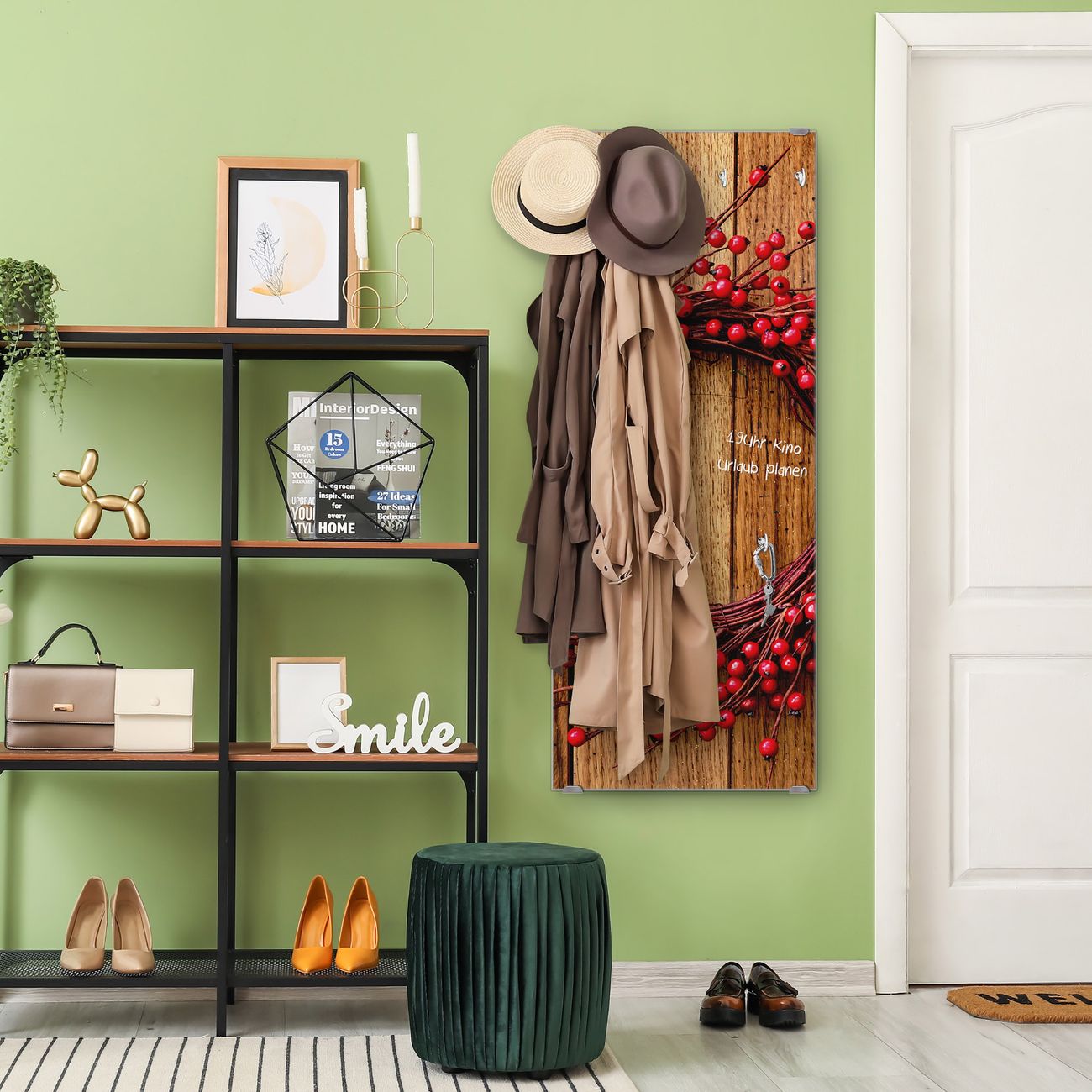 FUNKTION: Die banjado Wandgarderobe mit Motiv Weihnachtskranz ist Ihr täglicher Begleiter. Zuverlässig hängen hier Ihre Jacken und Mäntel griffbereit. Das Echtglas ist Ihr Paneel auch beschreibbar und wieder abwischbar. DESIGN: Sie erhalten eine Garderobenleiste aus elegantem Echtglas mit dem Farbbrillanten Motiv Weihnachtskranz hinterklebt. Das Design ist zeitlos klassisch, ohne dabei auf Funktionalität zu verzichten. Suchen Sie aus einer Vielzahl von Motiven das für Ihre Einrichtung Passende aus. DETAILS: Die Flurgarderobe besteht aus 4mm gehärtetem Sicherheitsglas. Sie ist 50cm breit, 125cm hoch und 6cm tief. Die Garderobenhaken zur Selbstmontage präsentieren sich in Edelstahl-Optik, ebenso die Abstandshalter für die Wandmontage. Ihre neue Garderobe ist sofort einsatzbereit. NUTZEN: Ihre neue Garderobe hält nicht nur zuverlässig Ihre Kleidung, sie ist auch optisch ein Blickfang. Durch das Glas können Sie an der Garderobe mit wasserlöslichen Kreidestiften oder Whiteboard-Markern auch Nachrichten hinterlassen. BANJADO: Wir sind ein kleines kreatives Team aus Sachsen und entwickeln Produkte die Design und Funktionalität verbinden sollen. Viel Freude mit Ihrer neuen Garderobe wünscht das banjado-Team!