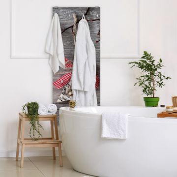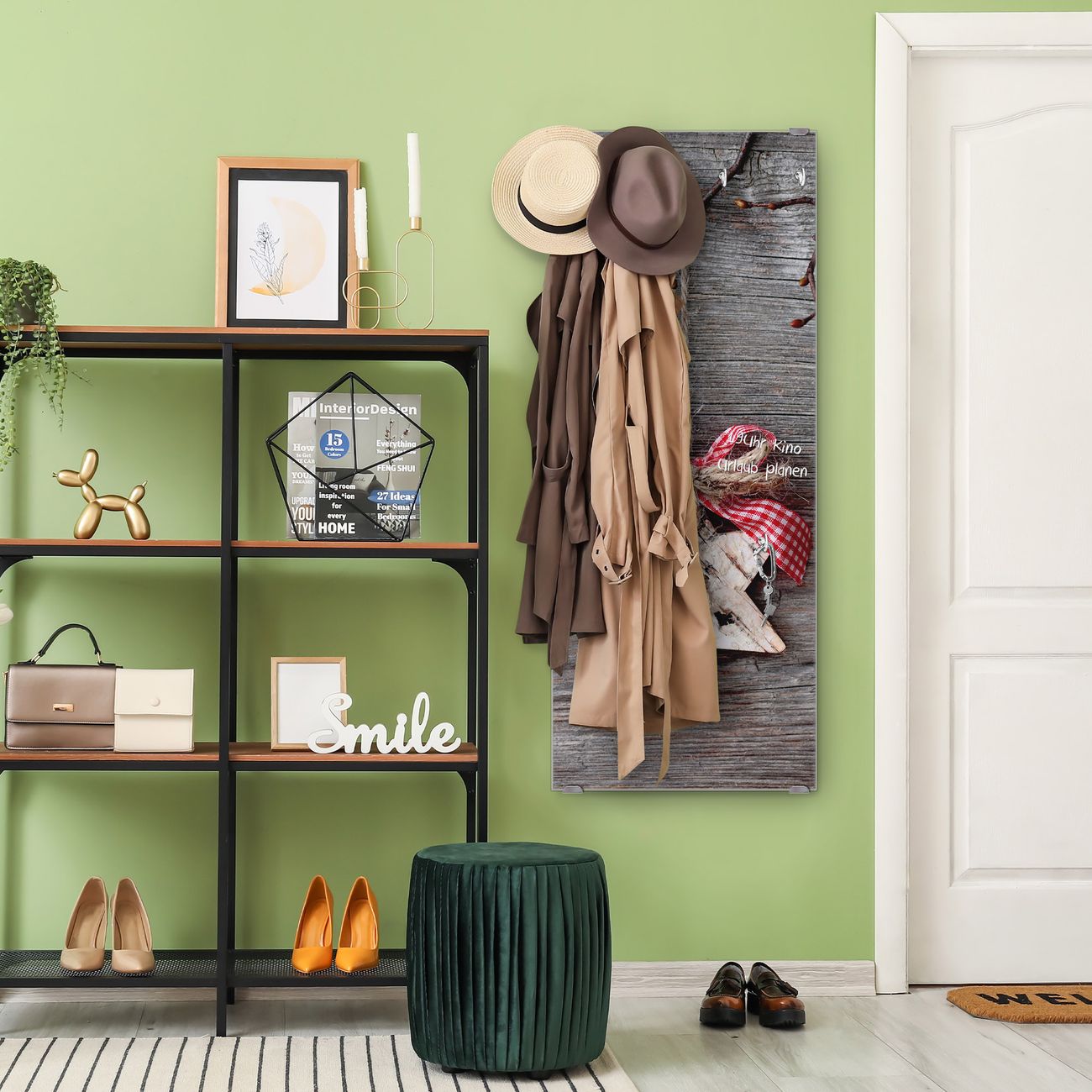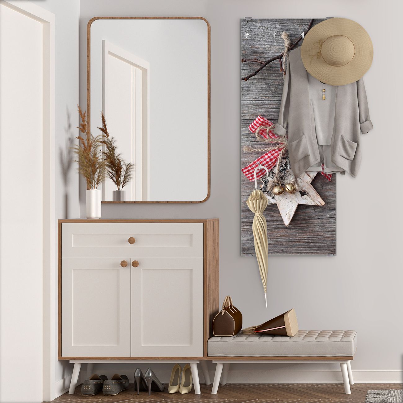 FUNKTION: Die banjado Wandgarderobe mit Motiv Weihnachtsstern ist Ihr täglicher Begleiter. Zuverlässig hängen hier Ihre Jacken und Mäntel griffbereit. Das Echtglas ist Ihr Paneel auch beschreibbar und wieder abwischbar. DESIGN: Sie erhalten eine Garderobenleiste aus elegantem Echtglas mit dem Farbbrillanten Motiv Weihnachtsstern hinterklebt. Das Design ist zeitlos klassisch, ohne dabei auf Funktionalität zu verzichten. Suchen Sie aus einer Vielzahl von Motiven das für Ihre Einrichtung Passende aus. DETAILS: Die Flurgarderobe besteht aus 4mm gehärtetem Sicherheitsglas. Sie ist 50cm breit, 125cm hoch und 6cm tief. Die Garderobenhaken zur Selbstmontage präsentieren sich in Edelstahl-Optik, ebenso die Abstandshalter für die Wandmontage. Ihre neue Garderobe ist sofort einsatzbereit. NUTZEN: Ihre neue Garderobe hält nicht nur zuverlässig Ihre Kleidung, sie ist auch optisch ein Blickfang. Durch das Glas können Sie an der Garderobe mit wasserlöslichen Kreidestiften oder Whiteboard-Markern auch Nachrichten hinterlassen. BANJADO: Wir sind ein kleines kreatives Team aus Sachsen und entwickeln Produkte die Design und Funktionalität verbinden sollen. Viel Freude mit Ihrer neuen Garderobe wünscht das banjado-Team!