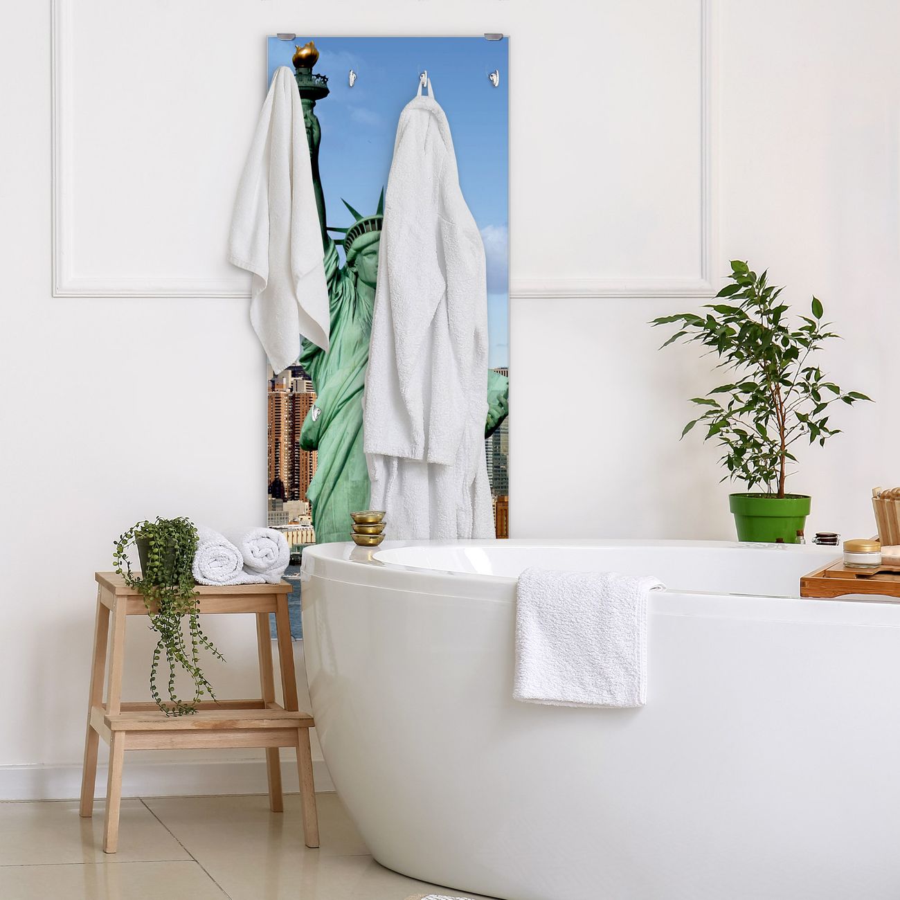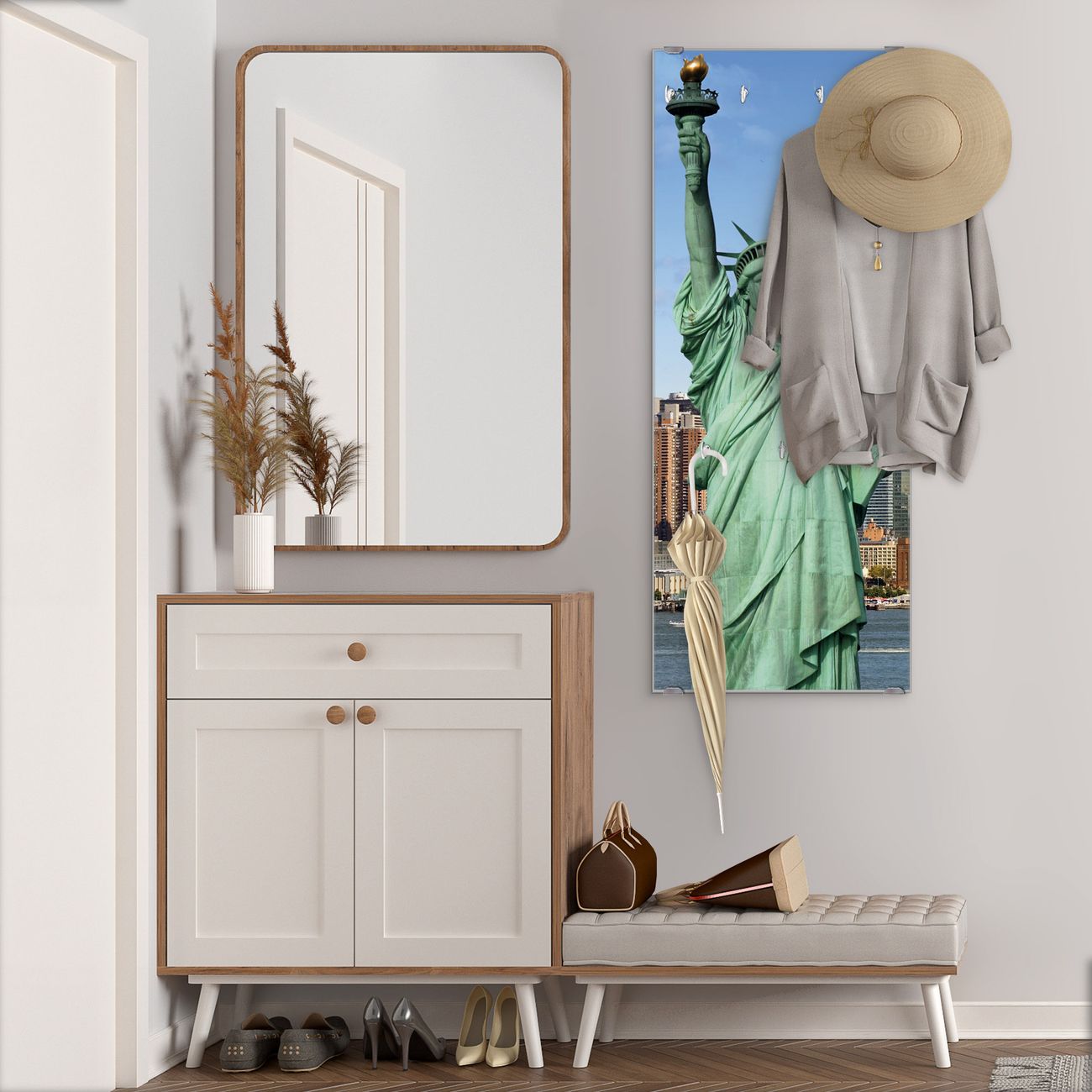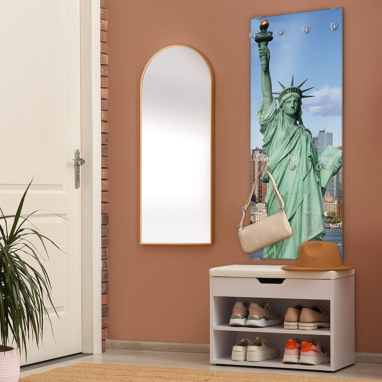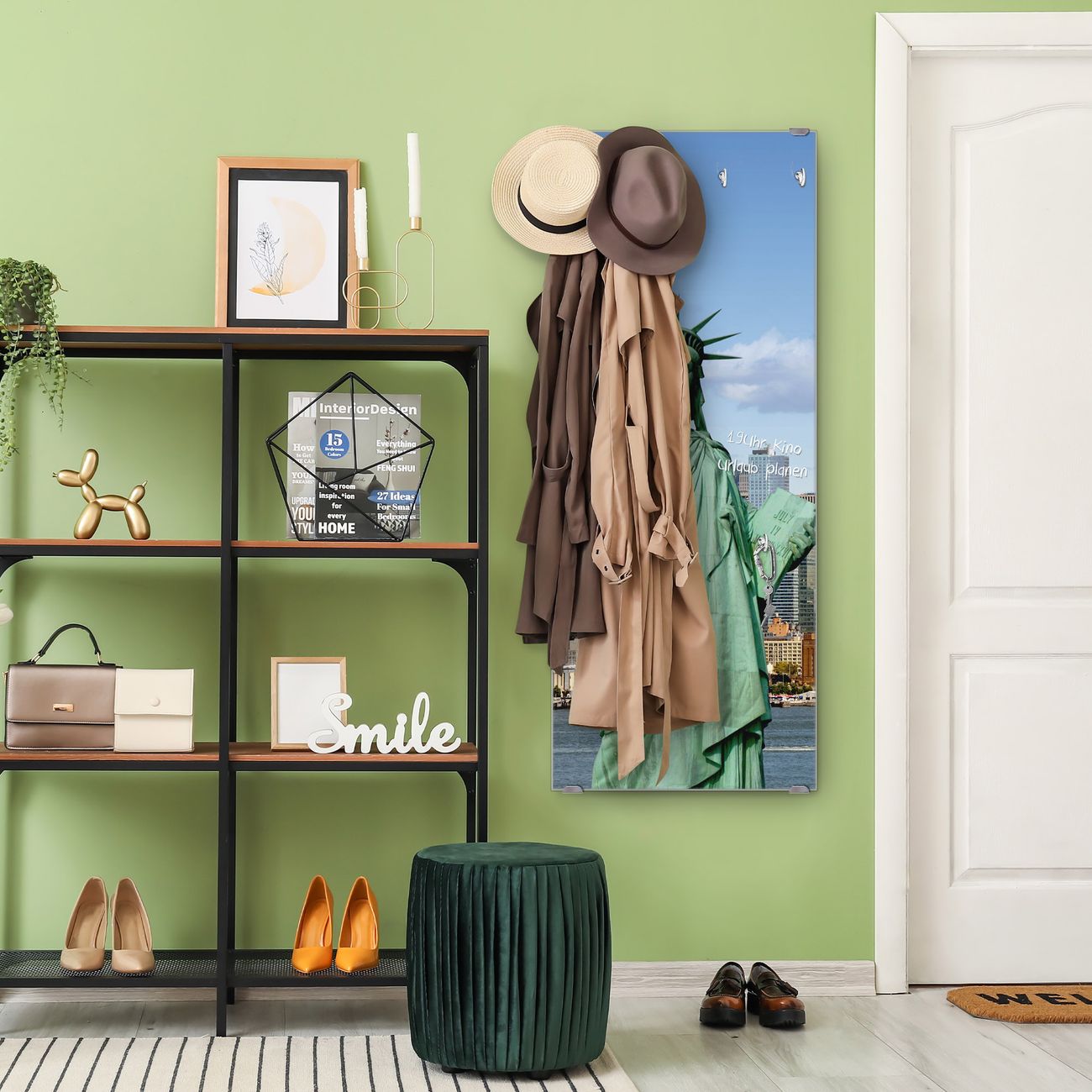 FUNKTION: Die banjado Wandgarderobe mit Motiv Welcome To NY ist Ihr täglicher Begleiter. Zuverlässig hängen hier Ihre Jacken und Mäntel griffbereit. Das Echtglas ist Ihr Paneel auch beschreibbar und wieder abwischbar. DESIGN: Sie erhalten eine Garderobenleiste aus elegantem Echtglas mit dem Farbbrillanten Motiv Welcome To NY hinterklebt. Das Design ist zeitlos klassisch, ohne dabei auf Funktionalität zu verzichten. Suchen Sie aus einer Vielzahl von Motiven das für Ihre Einrichtung Passende aus. DETAILS: Die Flurgarderobe besteht aus 4mm gehärtetem Sicherheitsglas. Sie ist 50cm breit, 125cm hoch und 6cm tief. Die Garderobenhaken zur Selbstmontage präsentieren sich in Edelstahl-Optik, ebenso die Abstandshalter für die Wandmontage. Ihre neue Garderobe ist sofort einsatzbereit. NUTZEN: Ihre neue Garderobe hält nicht nur zuverlässig Ihre Kleidung, sie ist auch optisch ein Blickfang. Durch das Glas können Sie an der Garderobe mit wasserlöslichen Kreidestiften oder Whiteboard-Markern auch Nachrichten hinterlassen. BANJADO: Wir sind ein kleines kreatives Team aus Sachsen und entwickeln Produkte die Design und Funktionalität verbinden sollen. Viel Freude mit Ihrer neuen Garderobe wünscht das banjado-Team!