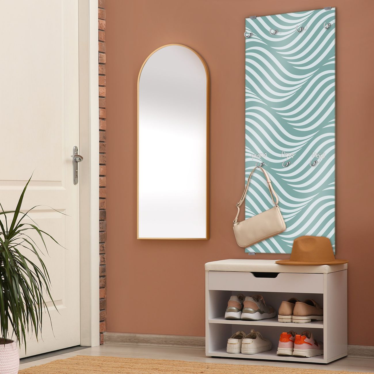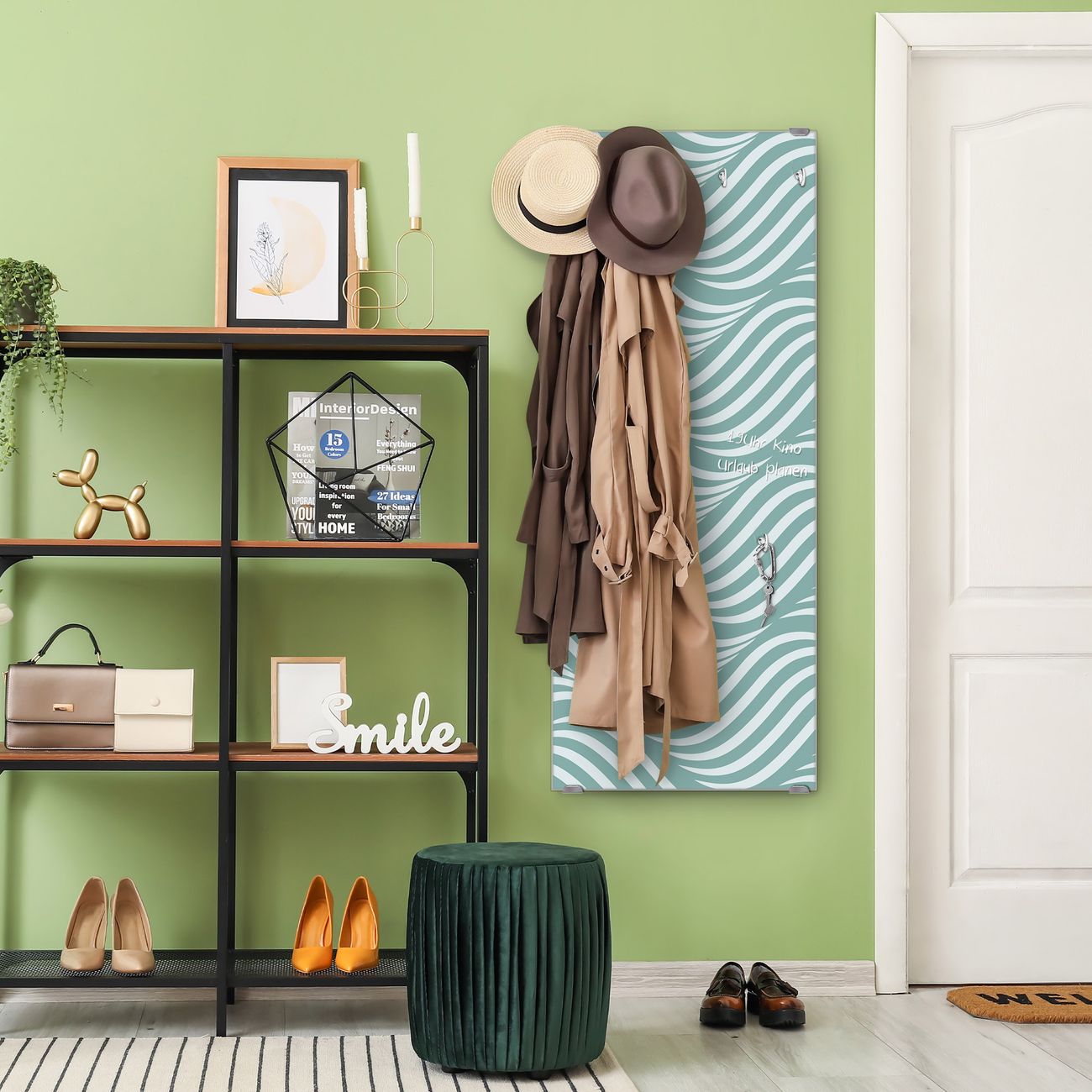 FUNKTION: Die banjado Wandgarderobe mit Motiv Wellen Lindgrün ist Ihr täglicher Begleiter. Zuverlässig hängen hier Ihre Jacken und Mäntel griffbereit. Das Echtglas ist Ihr Paneel auch beschreibbar und wieder abwischbar. DESIGN: Sie erhalten eine Garderobenleiste aus elegantem Echtglas mit dem Farbbrillanten Motiv Wellen Lindgrün hinterklebt. Das Design ist zeitlos klassisch, ohne dabei auf Funktionalität zu verzichten. Suchen Sie aus einer Vielzahl von Motiven das für Ihre Einrichtung Passende aus. DETAILS: Die Flurgarderobe besteht aus 4mm gehärtetem Sicherheitsglas. Sie ist 50cm breit, 125cm hoch und 6cm tief. Die Garderobenhaken zur Selbstmontage präsentieren sich in Edelstahl-Optik, ebenso die Abstandshalter für die Wandmontage. Ihre neue Garderobe ist sofort einsatzbereit. NUTZEN: Ihre neue Garderobe hält nicht nur zuverlässig Ihre Kleidung, sie ist auch optisch ein Blickfang. Durch das Glas können Sie an der Garderobe mit wasserlöslichen Kreidestiften oder Whiteboard-Markern auch Nachrichten hinterlassen. BANJADO: Wir sind ein kleines kreatives Team aus Sachsen und entwickeln Produkte die Design und Funktionalität verbinden sollen. Viel Freude mit Ihrer neuen Garderobe wünscht das banjado-Team!