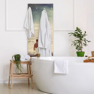FUNKTION: Die banjado Wandgarderobe mit Motiv Wellenreiten Gehen 2 ist Ihr täglicher Begleiter. Zuverlässig hängen hier Ihre Jacken und Mäntel griffbereit. Das Echtglas ist Ihr Paneel auch beschreibbar und wieder abwischbar. DESIGN: Sie erhalten eine Garderobenleiste aus elegantem Echtglas mit dem Farbbrillanten Motiv Wellenreiten Gehen 2 hinterklebt. Das Design ist zeitlos klassisch, ohne dabei auf Funktionalität zu verzichten. Suchen Sie aus einer Vielzahl von Motiven das für Ihre Einrichtung Passende aus. DETAILS: Die Flurgarderobe besteht aus 4mm gehärtetem Sicherheitsglas. Sie ist 50cm breit, 125cm hoch und 6cm tief. Die Garderobenhaken zur Selbstmontage präsentieren sich in Edelstahl-Optik, ebenso die Abstandshalter für die Wandmontage. Ihre neue Garderobe ist sofort einsatzbereit. NUTZEN: Ihre neue Garderobe hält nicht nur zuverlässig Ihre Kleidung, sie ist auch optisch ein Blickfang. Durch das Glas können Sie an der Garderobe mit wasserlöslichen Kreidestiften oder Whiteboard-Markern auch Nachrichten hinterlassen. BANJADO: Wir sind ein kleines kreatives Team aus Sachsen und entwickeln Produkte die Design und Funktionalität verbinden sollen. Viel Freude mit Ihrer neuen Garderobe wünscht das banjado-Team!
