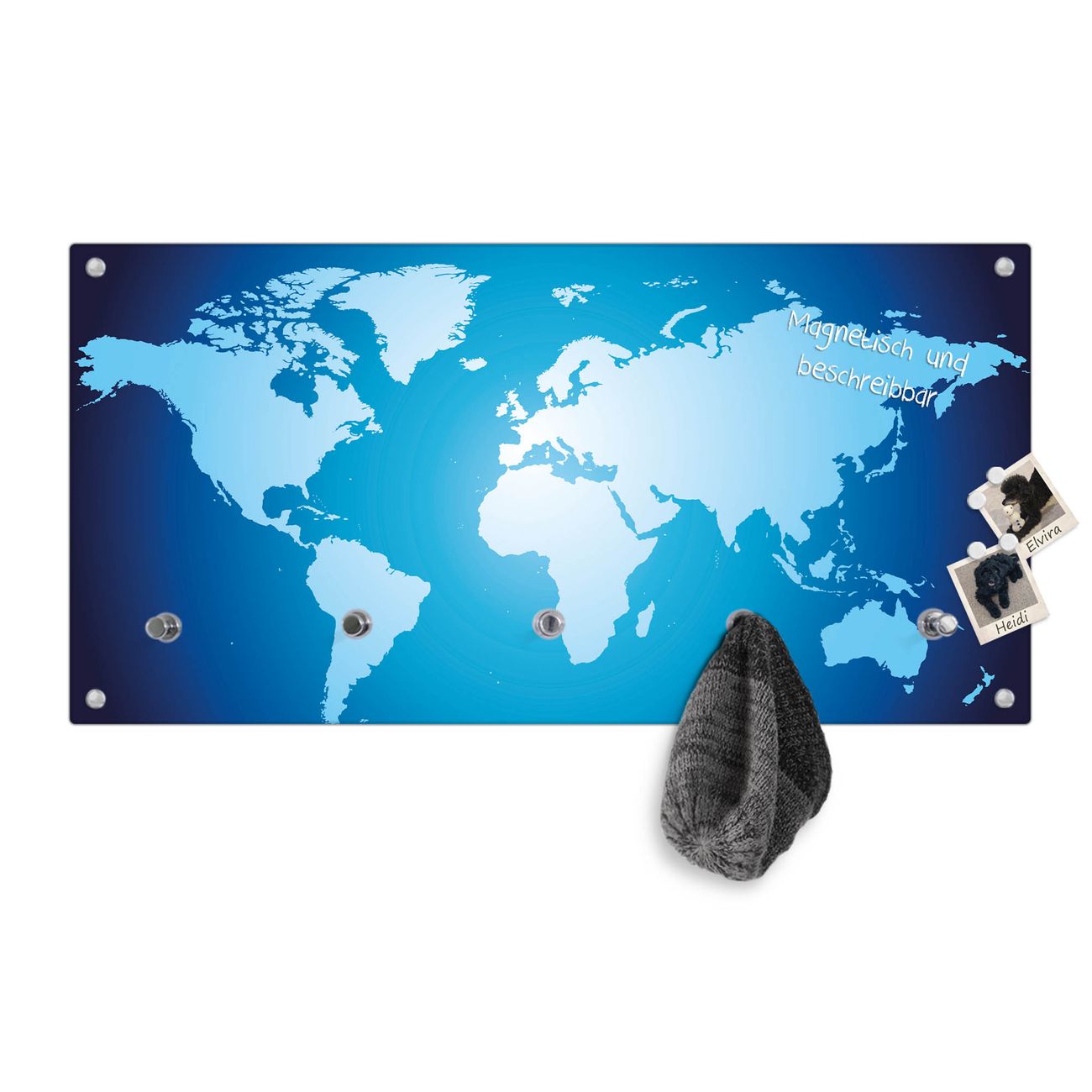 Bitte beachten Sie, dass an dieser Garderobe nur starke Neodym-Magnete halten! FUNKTION: Die banjado Wandgarderobe mit Motiv Weltkarte ist Ihr täglicher Begleiter. Zuverlässig hängen hier Ihre Jacken und Mäntel griffbereit. Gleichzeitig ist die Design Garderobe magnetisch, Sie können Notizen anheften und durch das Echtglas ist Ihr Paneel auch beschreibbar und wieder abwischbar. DESIGN: Sie erhalten eine Garderobenleiste aus elegantem Echtglas mit dem Farbbrillanten Motiv Weltkarte hinterklebt. Das Design ist zeitlos klassisch, ohne dabei auf Funktionalität zu verzichten. Suchen Sie aus einer Vielzahl von Motiven das für Ihre Einrichtung Passende aus. DETAILS: Die Flurgarderobe besteht aus 4mm gehärtetem Sicherheitsglas. Sie ist 80cm breit, 40cm hoch und 6cm tief. Die Garderobenhaken zur Selbstmontage präsentieren sich in Edelstahl-Optik, ebenso die Abstandshalter für die Wandmontage. Ihre neue Garderobe ist sofort einsatzbereit. NUTZEN: Ihre neue Garderobe hält nicht nur zuverlässig Ihre Kleidung, sie ist auch optisch ein Blickfang. Durch die magnetische Wirkung können Sie mit 4 beigefügten extrastarken Neodym-Magneten Notizen anheften und mit wasserlöslichen Kreidestiften oder Whiteboard-Markern auch Nachrichten hinterlassen. BANJADO: Wir sind ein kleines kreatives Team aus Sachsen und entwickeln Produkte die Design und Funktionalität verbinden sollen. Viel Freude mit Ihrer neuen Garderobe wünscht das banjado-Team!