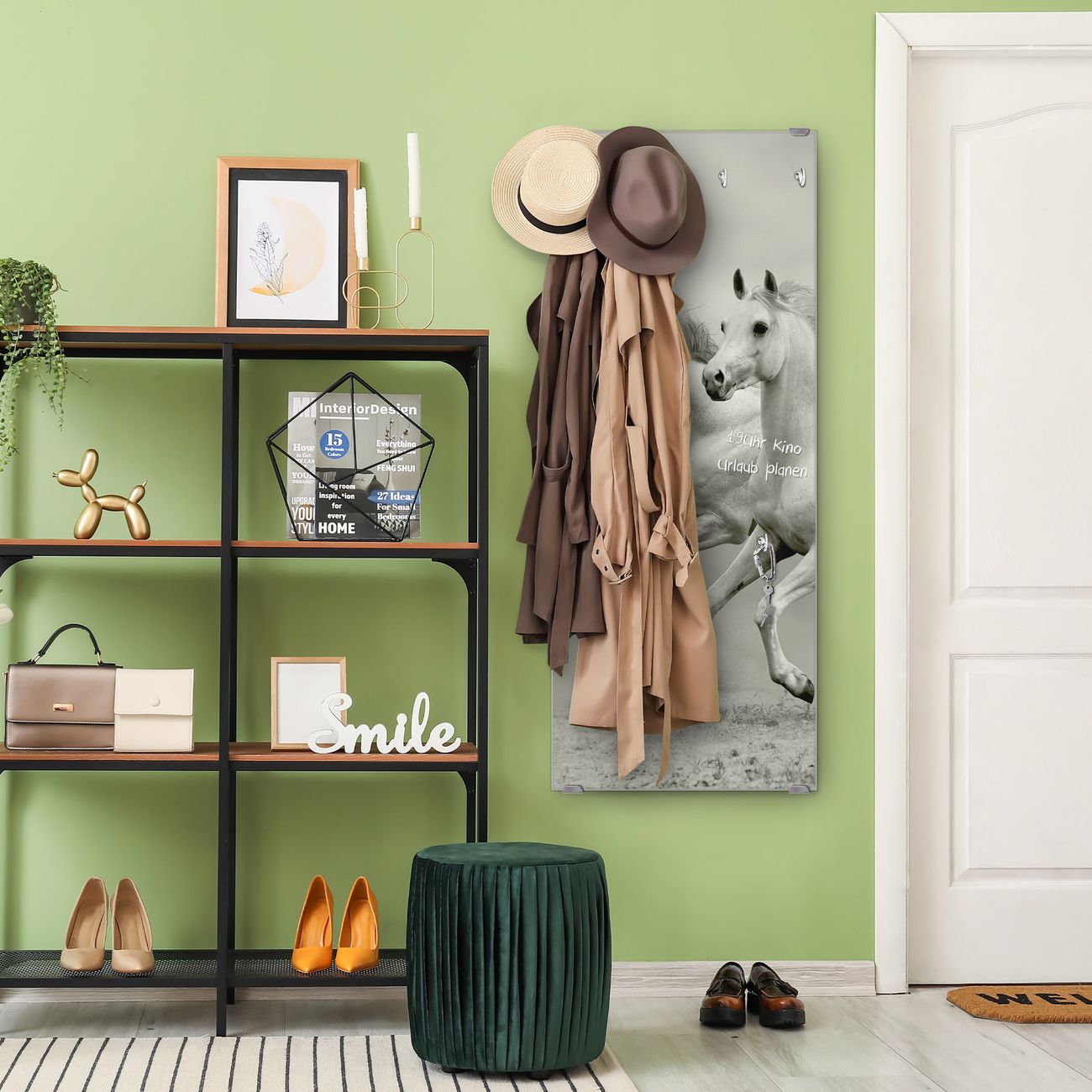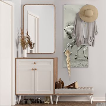 FUNKTION: Die banjado Wandgarderobe mit Motiv Wilde Pferde SW ist Ihr täglicher Begleiter. Zuverlässig hängen hier Ihre Jacken und Mäntel griffbereit. Das Echtglas ist Ihr Paneel auch beschreibbar und wieder abwischbar. DESIGN: Sie erhalten eine Garderobenleiste aus elegantem Echtglas mit dem Farbbrillanten Motiv Wilde Pferde SW hinterklebt. Das Design ist zeitlos klassisch, ohne dabei auf Funktionalität zu verzichten. Suchen Sie aus einer Vielzahl von Motiven das für Ihre Einrichtung Passende aus. DETAILS: Die Flurgarderobe besteht aus 4mm gehärtetem Sicherheitsglas. Sie ist 50cm breit, 125cm hoch und 6cm tief. Die Garderobenhaken zur Selbstmontage präsentieren sich in Edelstahl-Optik, ebenso die Abstandshalter für die Wandmontage. Ihre neue Garderobe ist sofort einsatzbereit. NUTZEN: Ihre neue Garderobe hält nicht nur zuverlässig Ihre Kleidung, sie ist auch optisch ein Blickfang. Durch das Glas können Sie an der Garderobe mit wasserlöslichen Kreidestiften oder Whiteboard-Markern auch Nachrichten hinterlassen. BANJADO: Wir sind ein kleines kreatives Team aus Sachsen und entwickeln Produkte die Design und Funktionalität verbinden sollen. Viel Freude mit Ihrer neuen Garderobe wünscht das banjado-Team!
