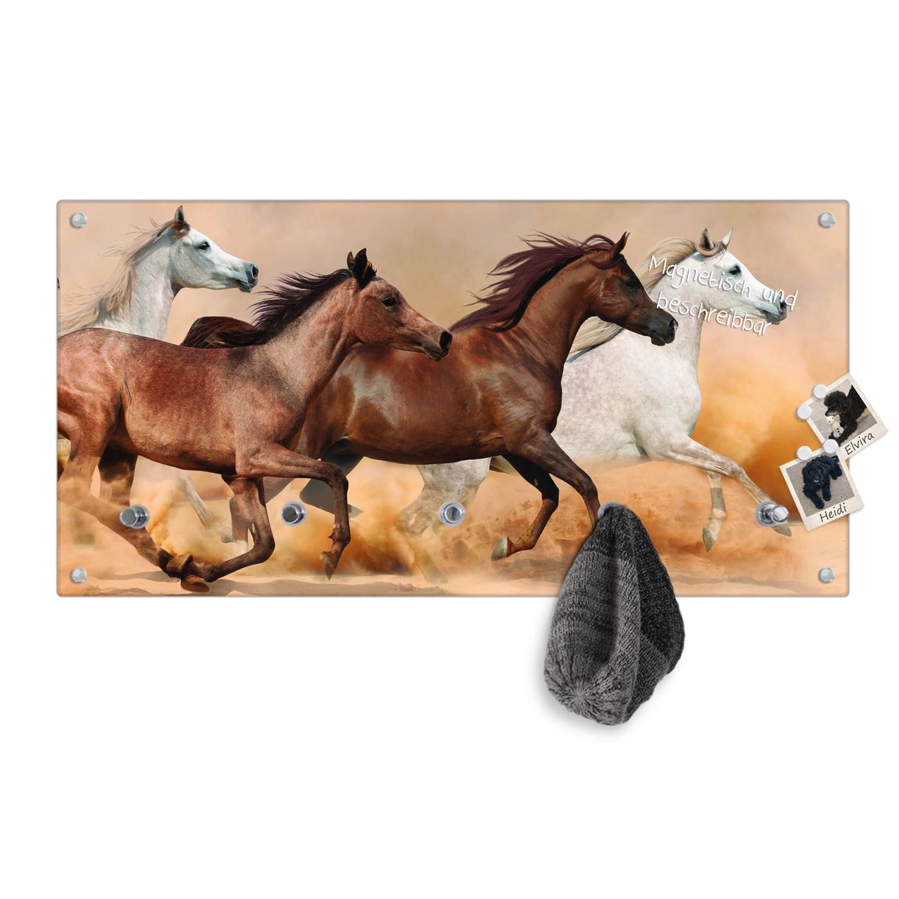 Bitte beachten Sie, dass an dieser Garderobe nur starke Neodym-Magnete halten! FUNKTION: Die banjado Wandgarderobe mit Motiv Wilde Pferde ist Ihr täglicher Begleiter. Zuverlässig hängen hier Ihre Jacken und Mäntel griffbereit. Gleichzeitig ist die Design Garderobe magnetisch, Sie können Notizen anheften und durch das Echtglas ist Ihr Paneel auch beschreibbar und wieder abwischbar. DESIGN: Sie erhalten eine Garderobenleiste aus elegantem Echtglas mit dem Farbbrillanten Motiv Wilde Pferde hinterklebt. Das Design ist zeitlos klassisch, ohne dabei auf Funktionalität zu verzichten. Suchen Sie aus einer Vielzahl von Motiven das für Ihre Einrichtung Passende aus. DETAILS: Die Flurgarderobe besteht aus 4mm gehärtetem Sicherheitsglas. Sie ist 80cm breit, 40cm hoch und 6cm tief. Die Garderobenhaken zur Selbstmontage präsentieren sich in Edelstahl-Optik, ebenso die Abstandshalter für die Wandmontage. Ihre neue Garderobe ist sofort einsatzbereit. NUTZEN: Ihre neue Garderobe hält nicht nur zuverlässig Ihre Kleidung, sie ist auch optisch ein Blickfang. Durch die magnetische Wirkung können Sie mit 4 beigefügten extrastarken Neodym-Magneten Notizen anheften und mit wasserlöslichen Kreidestiften oder Whiteboard-Markern auch Nachrichten hinterlassen. BANJADO: Wir sind ein kleines kreatives Team aus Sachsen und entwickeln Produkte die Design und Funktionalität verbinden sollen. Viel Freude mit Ihrer neuen Garderobe wünscht das banjado-Team!