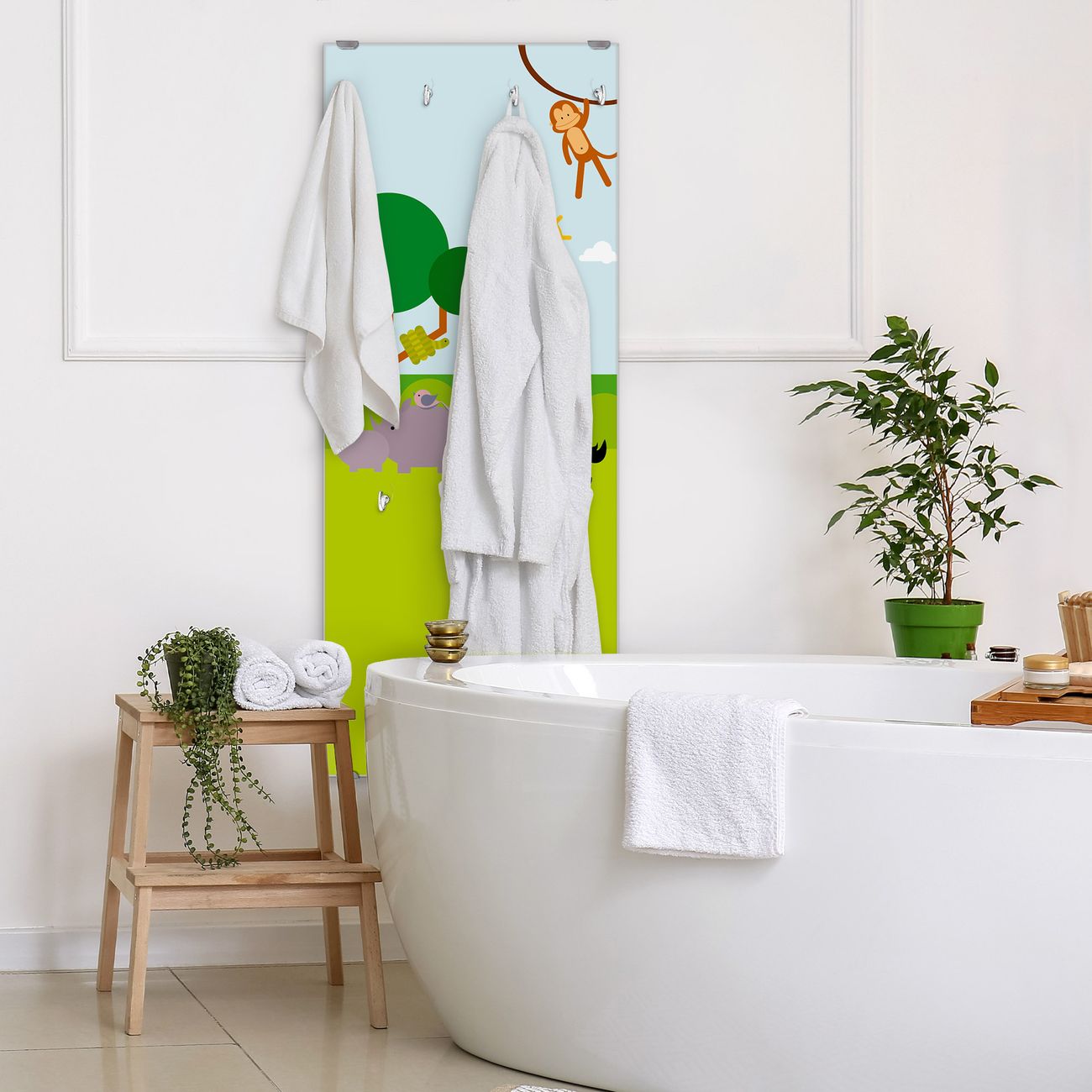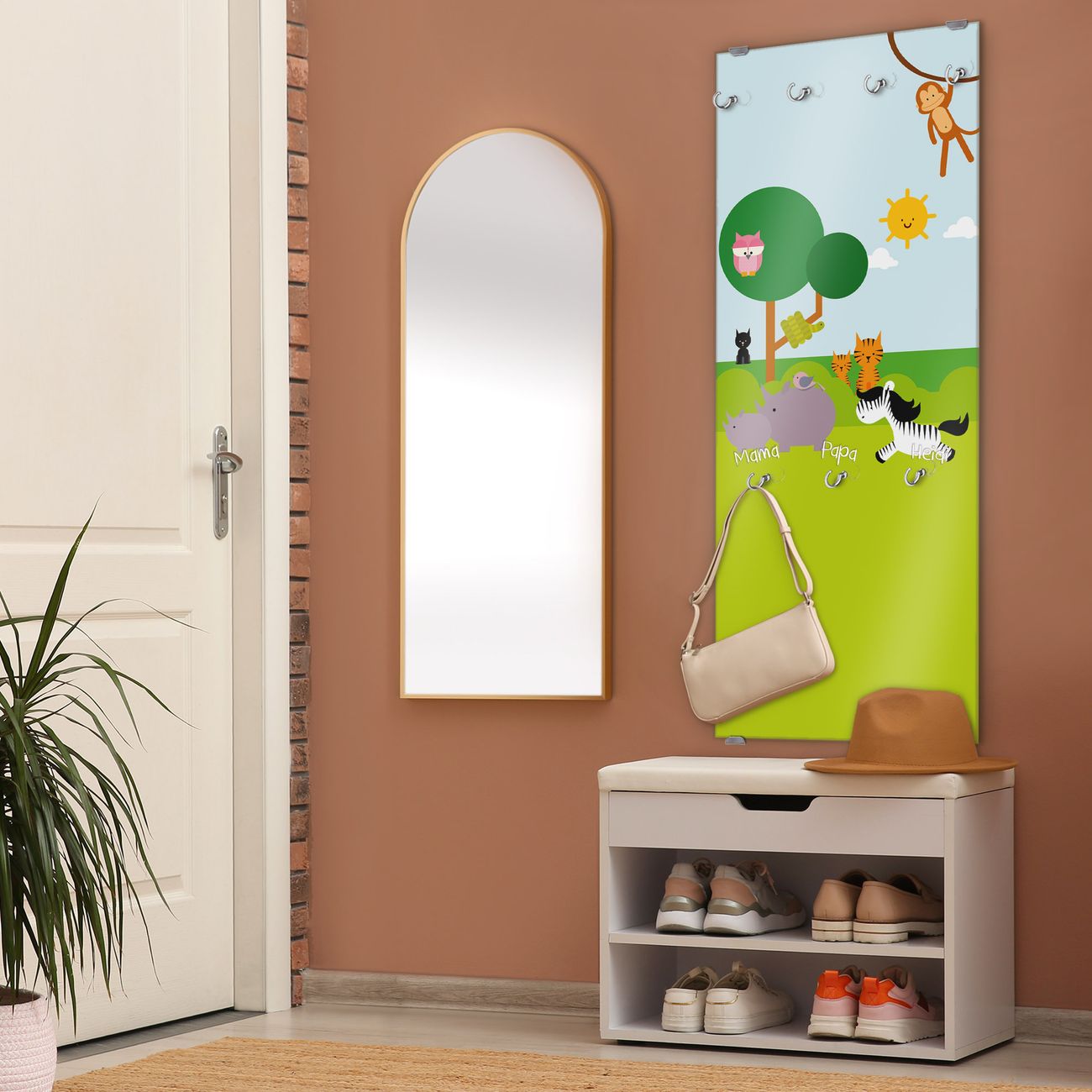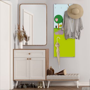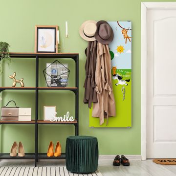 FUNKTION: Die banjado Wandgarderobe mit Motiv Wilde Tiere ist Ihr täglicher Begleiter. Zuverlässig hängen hier Ihre Jacken und Mäntel griffbereit. Das Echtglas ist Ihr Paneel auch beschreibbar und wieder abwischbar. DESIGN: Sie erhalten eine Garderobenleiste aus elegantem Echtglas mit dem Farbbrillanten Motiv Wilde Tiere hinterklebt. Das Design ist zeitlos klassisch, ohne dabei auf Funktionalität zu verzichten. Suchen Sie aus einer Vielzahl von Motiven das für Ihre Einrichtung Passende aus. DETAILS: Die Flurgarderobe besteht aus 4mm gehärtetem Sicherheitsglas. Sie ist 50cm breit, 125cm hoch und 6cm tief. Die Garderobenhaken zur Selbstmontage präsentieren sich in Edelstahl-Optik, ebenso die Abstandshalter für die Wandmontage. Ihre neue Garderobe ist sofort einsatzbereit. NUTZEN: Ihre neue Garderobe hält nicht nur zuverlässig Ihre Kleidung, sie ist auch optisch ein Blickfang. Durch das Glas können Sie an der Garderobe mit wasserlöslichen Kreidestiften oder Whiteboard-Markern auch Nachrichten hinterlassen. BANJADO: Wir sind ein kleines kreatives Team aus Sachsen und entwickeln Produkte die Design und Funktionalität verbinden sollen. Viel Freude mit Ihrer neuen Garderobe wünscht das banjado-Team!