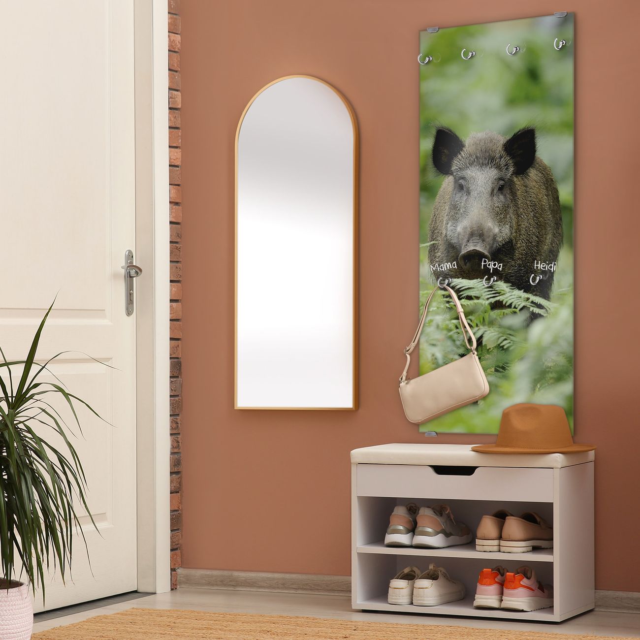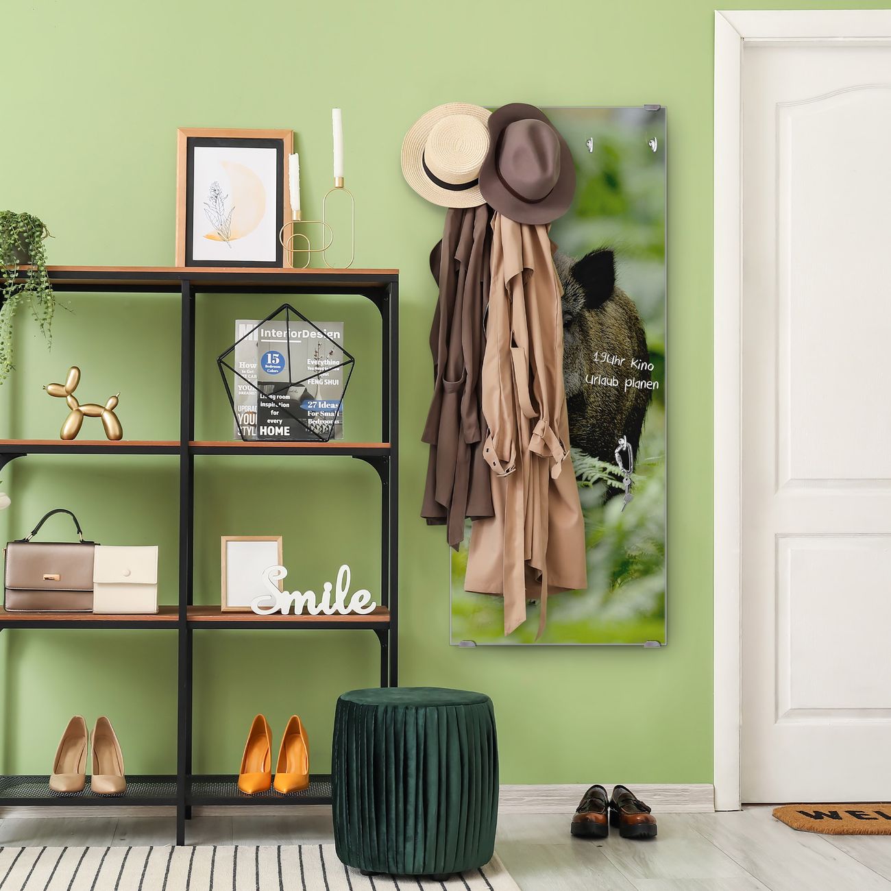 FUNKTION: Die banjado Wandgarderobe mit Motiv Wildschwein ist Ihr täglicher Begleiter. Zuverlässig hängen hier Ihre Jacken und Mäntel griffbereit. Das Echtglas ist Ihr Paneel auch beschreibbar und wieder abwischbar. DESIGN: Sie erhalten eine Garderobenleiste aus elegantem Echtglas mit dem Farbbrillanten Motiv Wildschwein hinterklebt. Das Design ist zeitlos klassisch, ohne dabei auf Funktionalität zu verzichten. Suchen Sie aus einer Vielzahl von Motiven das für Ihre Einrichtung Passende aus. DETAILS: Die Flurgarderobe besteht aus 4mm gehärtetem Sicherheitsglas. Sie ist 50cm breit, 125cm hoch und 6cm tief. Die Garderobenhaken zur Selbstmontage präsentieren sich in Edelstahl-Optik, ebenso die Abstandshalter für die Wandmontage. Ihre neue Garderobe ist sofort einsatzbereit. NUTZEN: Ihre neue Garderobe hält nicht nur zuverlässig Ihre Kleidung, sie ist auch optisch ein Blickfang. Durch das Glas können Sie an der Garderobe mit wasserlöslichen Kreidestiften oder Whiteboard-Markern auch Nachrichten hinterlassen. BANJADO: Wir sind ein kleines kreatives Team aus Sachsen und entwickeln Produkte die Design und Funktionalität verbinden sollen. Viel Freude mit Ihrer neuen Garderobe wünscht das banjado-Team!