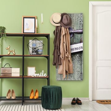 FUNKTION: Die banjado Wandgarderobe mit Motiv Willkommen ist Ihr täglicher Begleiter. Zuverlässig hängen hier Ihre Jacken und Mäntel griffbereit. Das Echtglas ist Ihr Paneel auch beschreibbar und wieder abwischbar. DESIGN: Sie erhalten eine Garderobenleiste aus elegantem Echtglas mit dem Farbbrillanten Motiv Willkommen hinterklebt. Das Design ist zeitlos klassisch, ohne dabei auf Funktionalität zu verzichten. Suchen Sie aus einer Vielzahl von Motiven das für Ihre Einrichtung Passende aus. DETAILS: Die Flurgarderobe besteht aus 4mm gehärtetem Sicherheitsglas. Sie ist 50cm breit, 125cm hoch und 6cm tief. Die Garderobenhaken zur Selbstmontage präsentieren sich in Edelstahl-Optik, ebenso die Abstandshalter für die Wandmontage. Ihre neue Garderobe ist sofort einsatzbereit. NUTZEN: Ihre neue Garderobe hält nicht nur zuverlässig Ihre Kleidung, sie ist auch optisch ein Blickfang. Durch das Glas können Sie an der Garderobe mit wasserlöslichen Kreidestiften oder Whiteboard-Markern auch Nachrichten hinterlassen. BANJADO: Wir sind ein kleines kreatives Team aus Sachsen und entwickeln Produkte die Design und Funktionalität verbinden sollen. Viel Freude mit Ihrer neuen Garderobe wünscht das banjado-Team!