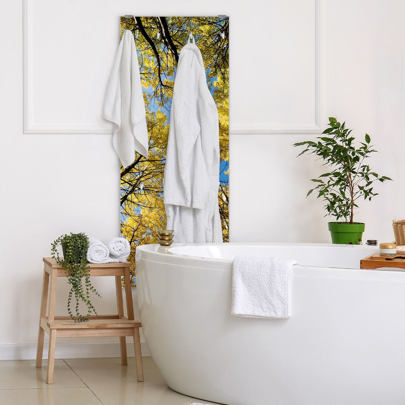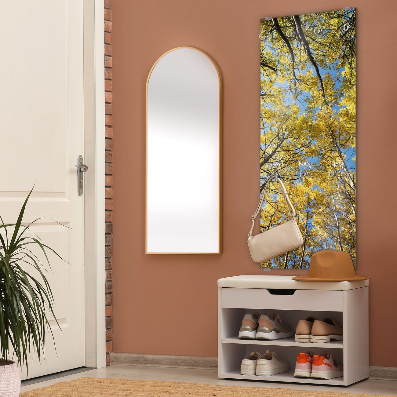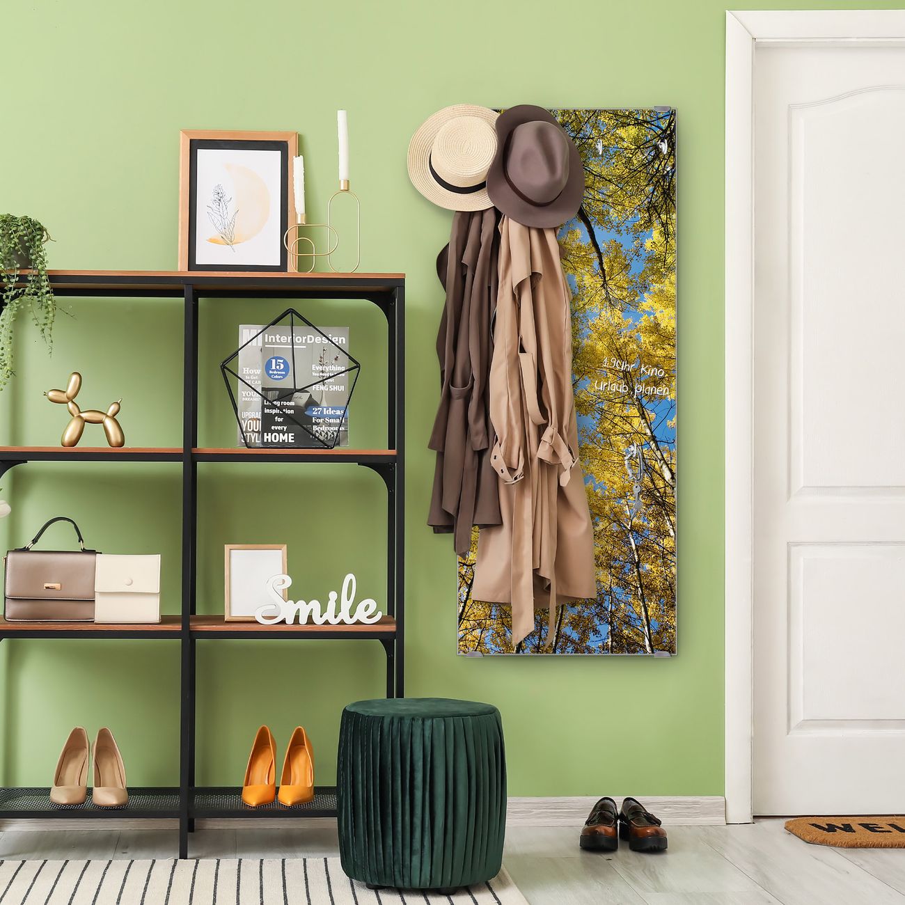 FUNKTION: Die banjado Wandgarderobe mit Motiv Wipfel ist Ihr täglicher Begleiter. Zuverlässig hängen hier Ihre Jacken und Mäntel griffbereit. Das Echtglas ist Ihr Paneel auch beschreibbar und wieder abwischbar. DESIGN: Sie erhalten eine Garderobenleiste aus elegantem Echtglas mit dem Farbbrillanten Motiv Wipfel hinterklebt. Das Design ist zeitlos klassisch, ohne dabei auf Funktionalität zu verzichten. Suchen Sie aus einer Vielzahl von Motiven das für Ihre Einrichtung Passende aus. DETAILS: Die Flurgarderobe besteht aus 4mm gehärtetem Sicherheitsglas. Sie ist 50cm breit, 125cm hoch und 6cm tief. Die Garderobenhaken zur Selbstmontage präsentieren sich in Edelstahl-Optik, ebenso die Abstandshalter für die Wandmontage. Ihre neue Garderobe ist sofort einsatzbereit. NUTZEN: Ihre neue Garderobe hält nicht nur zuverlässig Ihre Kleidung, sie ist auch optisch ein Blickfang. Durch das Glas können Sie an der Garderobe mit wasserlöslichen Kreidestiften oder Whiteboard-Markern auch Nachrichten hinterlassen. BANJADO: Wir sind ein kleines kreatives Team aus Sachsen und entwickeln Produkte die Design und Funktionalität verbinden sollen. Viel Freude mit Ihrer neuen Garderobe wünscht das banjado-Team!