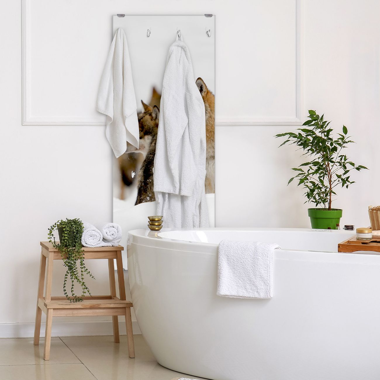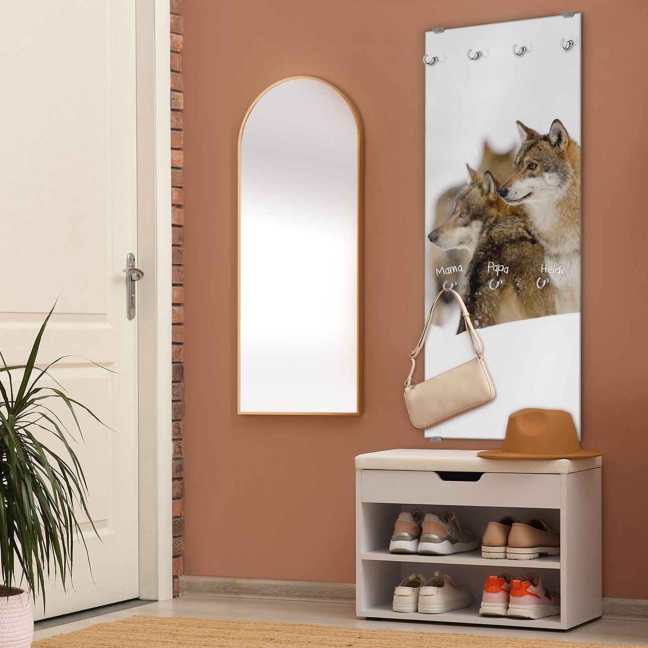 FUNKTION: Die banjado Wandgarderobe mit Motiv Wölfe ist Ihr täglicher Begleiter. Zuverlässig hängen hier Ihre Jacken und Mäntel griffbereit. Das Echtglas ist Ihr Paneel auch beschreibbar und wieder abwischbar. DESIGN: Sie erhalten eine Garderobenleiste aus elegantem Echtglas mit dem Farbbrillanten Motiv Wölfe hinterklebt. Das Design ist zeitlos klassisch, ohne dabei auf Funktionalität zu verzichten. Suchen Sie aus einer Vielzahl von Motiven das für Ihre Einrichtung Passende aus. DETAILS: Die Flurgarderobe besteht aus 4mm gehärtetem Sicherheitsglas. Sie ist 50cm breit, 125cm hoch und 6cm tief. Die Garderobenhaken zur Selbstmontage präsentieren sich in Edelstahl-Optik, ebenso die Abstandshalter für die Wandmontage. Ihre neue Garderobe ist sofort einsatzbereit. NUTZEN: Ihre neue Garderobe hält nicht nur zuverlässig Ihre Kleidung, sie ist auch optisch ein Blickfang. Durch das Glas können Sie an der Garderobe mit wasserlöslichen Kreidestiften oder Whiteboard-Markern auch Nachrichten hinterlassen. BANJADO: Wir sind ein kleines kreatives Team aus Sachsen und entwickeln Produkte die Design und Funktionalität verbinden sollen. Viel Freude mit Ihrer neuen Garderobe wünscht das banjado-Team!