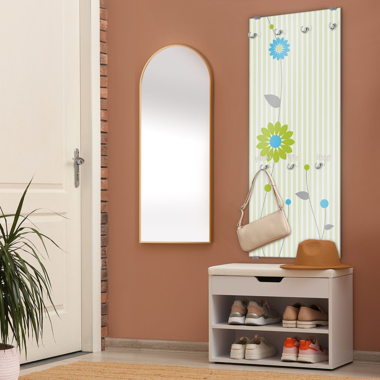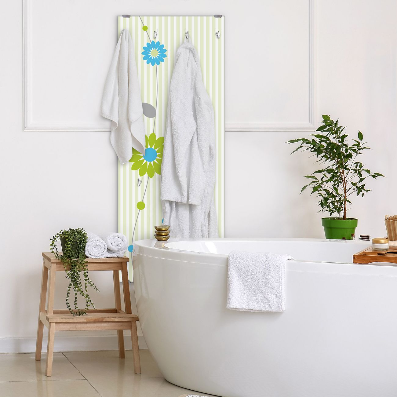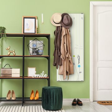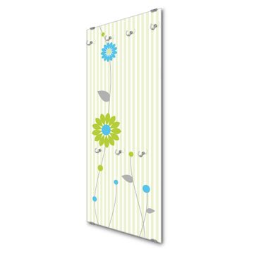 FUNKTION: Die banjado Wandgarderobe mit Motiv Zarte Blumen ist Ihr täglicher Begleiter. Zuverlässig hängen hier Ihre Jacken und Mäntel griffbereit. Das Echtglas ist Ihr Paneel auch beschreibbar und wieder abwischbar. DESIGN: Sie erhalten eine Garderobenleiste aus elegantem Echtglas mit dem Farbbrillanten Motiv Zarte Blumen hinterklebt. Das Design ist zeitlos klassisch, ohne dabei auf Funktionalität zu verzichten. Suchen Sie aus einer Vielzahl von Motiven das für Ihre Einrichtung Passende aus. DETAILS: Die Flurgarderobe besteht aus 4mm gehärtetem Sicherheitsglas. Sie ist 50cm breit, 125cm hoch und 6cm tief. Die Garderobenhaken zur Selbstmontage präsentieren sich in Edelstahl-Optik, ebenso die Abstandshalter für die Wandmontage. Ihre neue Garderobe ist sofort einsatzbereit. NUTZEN: Ihre neue Garderobe hält nicht nur zuverlässig Ihre Kleidung, sie ist auch optisch ein Blickfang. Durch das Glas können Sie an der Garderobe mit wasserlöslichen Kreidestiften oder Whiteboard-Markern auch Nachrichten hinterlassen. BANJADO: Wir sind ein kleines kreatives Team aus Sachsen und entwickeln Produkte die Design und Funktionalität verbinden sollen. Viel Freude mit Ihrer neuen Garderobe wünscht das banjado-Team!