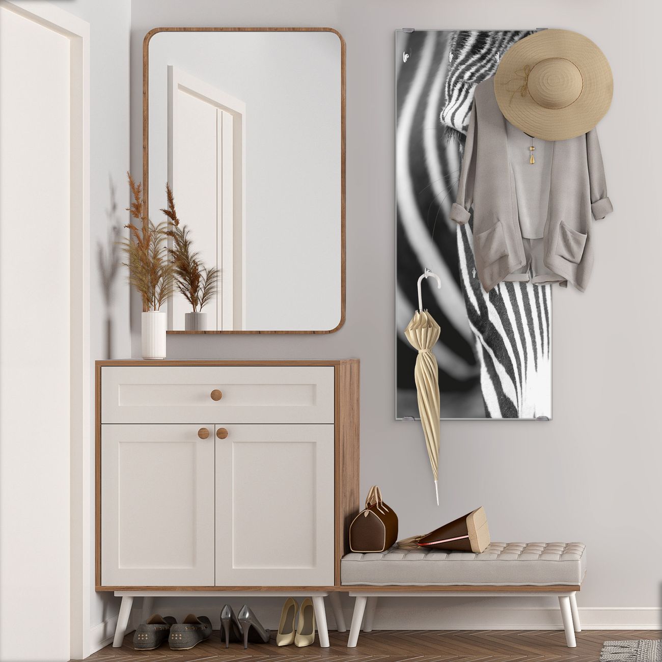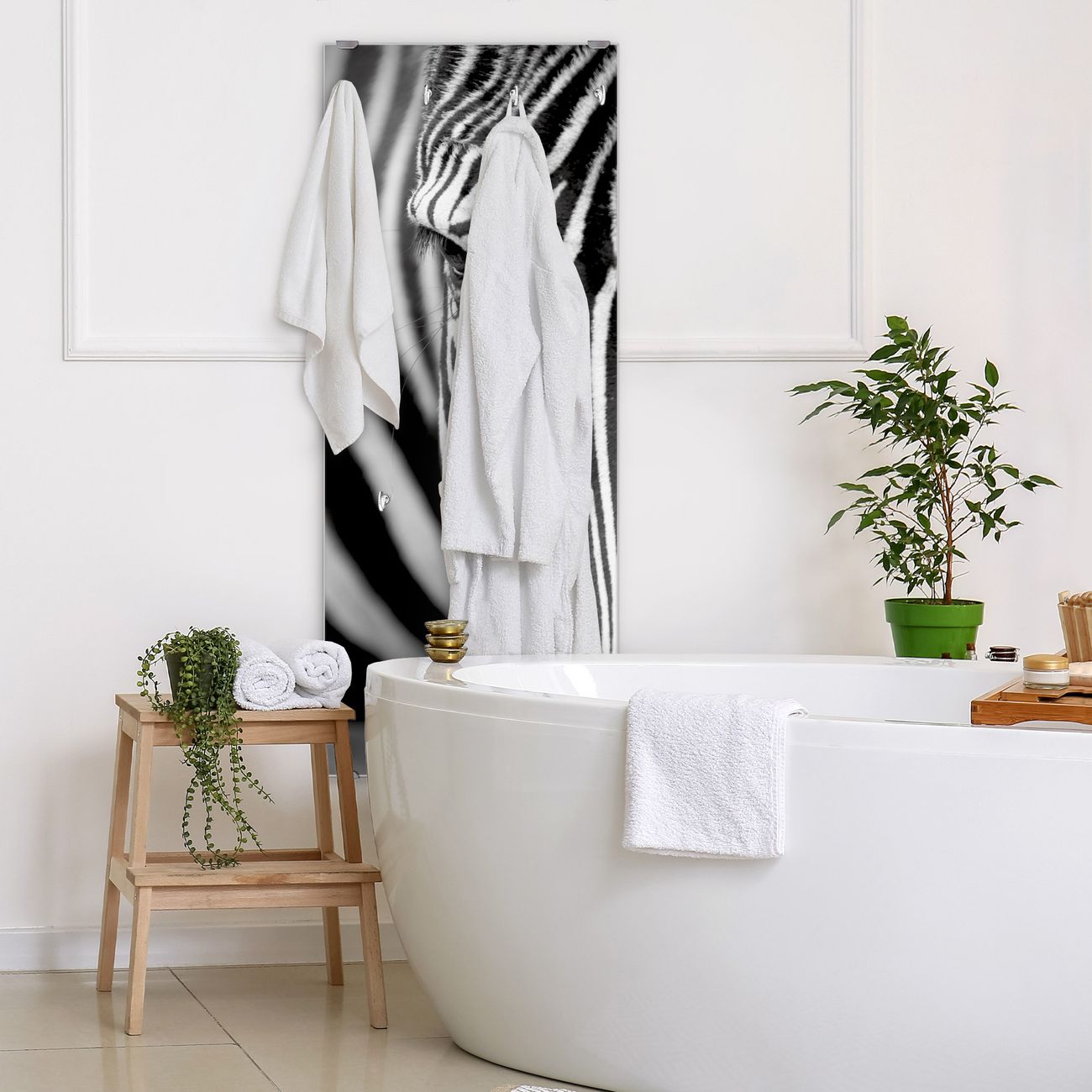 FUNKTION: Die banjado Wandgarderobe mit Motiv Zebra En Face ist Ihr täglicher Begleiter. Zuverlässig hängen hier Ihre Jacken und Mäntel griffbereit. Das Echtglas ist Ihr Paneel auch beschreibbar und wieder abwischbar. DESIGN: Sie erhalten eine Garderobenleiste aus elegantem Echtglas mit dem Farbbrillanten Motiv Zebra En Face hinterklebt. Das Design ist zeitlos klassisch, ohne dabei auf Funktionalität zu verzichten. Suchen Sie aus einer Vielzahl von Motiven das für Ihre Einrichtung Passende aus. DETAILS: Die Flurgarderobe besteht aus 4mm gehärtetem Sicherheitsglas. Sie ist 50cm breit, 125cm hoch und 6cm tief. Die Garderobenhaken zur Selbstmontage präsentieren sich in Edelstahl-Optik, ebenso die Abstandshalter für die Wandmontage. Ihre neue Garderobe ist sofort einsatzbereit. NUTZEN: Ihre neue Garderobe hält nicht nur zuverlässig Ihre Kleidung, sie ist auch optisch ein Blickfang. Durch das Glas können Sie an der Garderobe mit wasserlöslichen Kreidestiften oder Whiteboard-Markern auch Nachrichten hinterlassen. BANJADO: Wir sind ein kleines kreatives Team aus Sachsen und entwickeln Produkte die Design und Funktionalität verbinden sollen. Viel Freude mit Ihrer neuen Garderobe wünscht das banjado-Team!