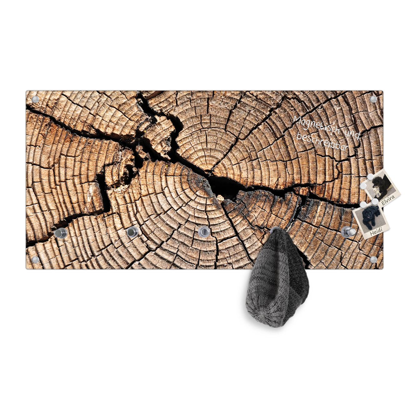 Bitte beachten Sie, dass an dieser Garderobe nur starke Neodym-Magnete halten! FUNKTION: Die banjado Wandgarderobe mit Motiv Zeichen Der Zeit ist Ihr täglicher Begleiter. Zuverlässig hängen hier Ihre Jacken und Mäntel griffbereit. Gleichzeitig ist die Design Garderobe magnetisch, Sie können Notizen anheften und durch das Echtglas ist Ihr Paneel auch beschreibbar und wieder abwischbar. DESIGN: Sie erhalten eine Garderobenleiste aus elegantem Echtglas mit dem Farbbrillanten Motiv Zeichen Der Zeit hinterklebt. Das Design ist zeitlos klassisch, ohne dabei auf Funktionalität zu verzichten. Suchen Sie aus einer Vielzahl von Motiven das für Ihre Einrichtung Passende aus. DETAILS: Die Flurgarderobe besteht aus 4mm gehärtetem Sicherheitsglas. Sie ist 80cm breit, 40cm hoch und 6cm tief. Die Garderobenhaken zur Selbstmontage präsentieren sich in Edelstahl-Optik, ebenso die Abstandshalter für die Wandmontage. Ihre neue Garderobe ist sofort einsatzbereit. NUTZEN: Ihre neue Garderobe hält nicht nur zuverlässig Ihre Kleidung, sie ist auch optisch ein Blickfang. Durch die magnetische Wirkung können Sie mit 4 beigefügten extrastarken Neodym-Magneten Notizen anheften und mit wasserlöslichen Kreidestiften oder Whiteboard-Markern auch Nachrichten hinterlassen. BANJADO: Wir sind ein kleines kreatives Team aus Sachsen und entwickeln Produkte die Design und Funktionalität verbinden sollen. Viel Freude mit Ihrer neuen Garderobe wünscht das banjado-Team!