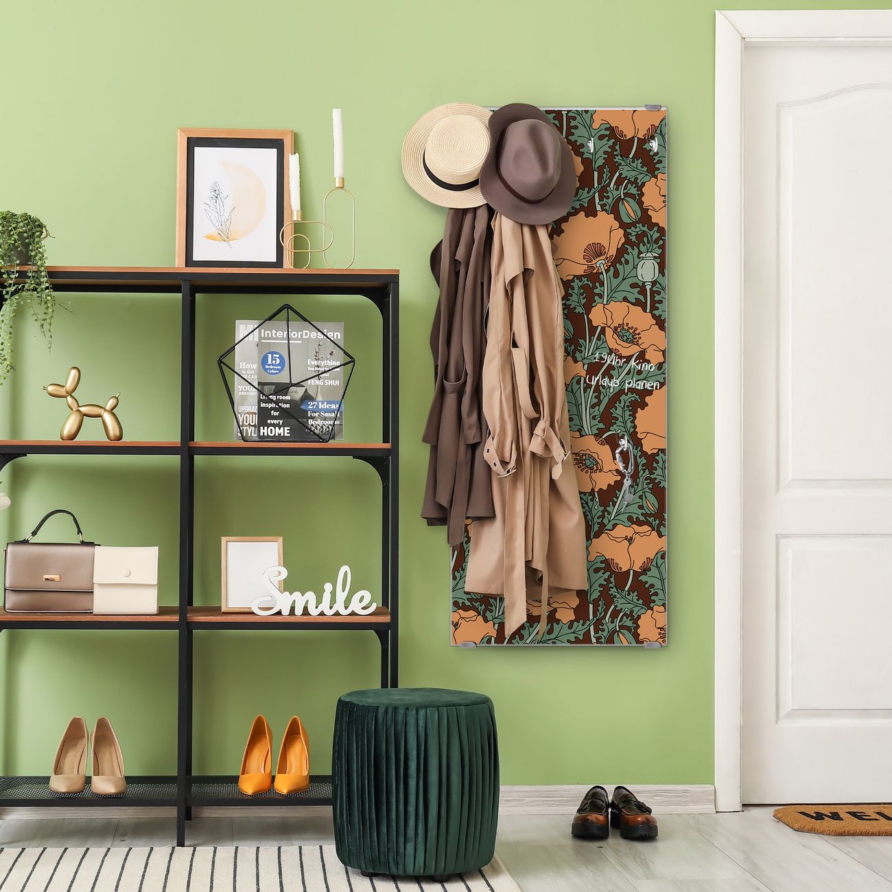 FUNKTION: Die banjado Wandgarderobe mit Motiv Zeichnung Mohn ist Ihr täglicher Begleiter. Zuverlässig hängen hier Ihre Jacken und Mäntel griffbereit. Das Echtglas ist Ihr Paneel auch beschreibbar und wieder abwischbar. DESIGN: Sie erhalten eine Garderobenleiste aus elegantem Echtglas mit dem Farbbrillanten Motiv Zeichnung Mohn hinterklebt. Das Design ist zeitlos klassisch, ohne dabei auf Funktionalität zu verzichten. Suchen Sie aus einer Vielzahl von Motiven das für Ihre Einrichtung Passende aus. DETAILS: Die Flurgarderobe besteht aus 4mm gehärtetem Sicherheitsglas. Sie ist 50cm breit, 125cm hoch und 6cm tief. Die Garderobenhaken zur Selbstmontage präsentieren sich in Edelstahl-Optik, ebenso die Abstandshalter für die Wandmontage. Ihre neue Garderobe ist sofort einsatzbereit. NUTZEN: Ihre neue Garderobe hält nicht nur zuverlässig Ihre Kleidung, sie ist auch optisch ein Blickfang. Durch das Glas können Sie an der Garderobe mit wasserlöslichen Kreidestiften oder Whiteboard-Markern auch Nachrichten hinterlassen. BANJADO: Wir sind ein kleines kreatives Team aus Sachsen und entwickeln Produkte die Design und Funktionalität verbinden sollen. Viel Freude mit Ihrer neuen Garderobe wünscht das banjado-Team!
