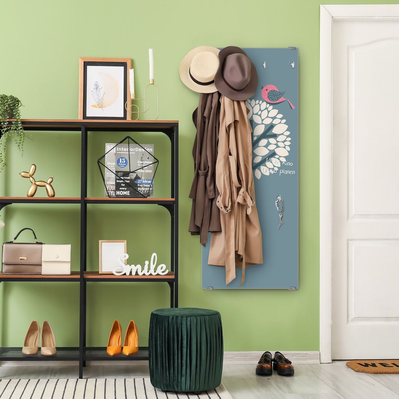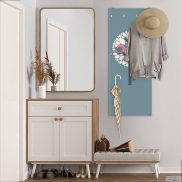 FUNKTION: Die banjado Wandgarderobe mit Motiv Zwei Rosa Vögel ist Ihr täglicher Begleiter. Zuverlässig hängen hier Ihre Jacken und Mäntel griffbereit. Das Echtglas ist Ihr Paneel auch beschreibbar und wieder abwischbar. DESIGN: Sie erhalten eine Garderobenleiste aus elegantem Echtglas mit dem Farbbrillanten Motiv Zwei Rosa Vögel hinterklebt. Das Design ist zeitlos klassisch, ohne dabei auf Funktionalität zu verzichten. Suchen Sie aus einer Vielzahl von Motiven das für Ihre Einrichtung Passende aus. DETAILS: Die Flurgarderobe besteht aus 4mm gehärtetem Sicherheitsglas. Sie ist 50cm breit, 125cm hoch und 6cm tief. Die Garderobenhaken zur Selbstmontage präsentieren sich in Edelstahl-Optik, ebenso die Abstandshalter für die Wandmontage. Ihre neue Garderobe ist sofort einsatzbereit. NUTZEN: Ihre neue Garderobe hält nicht nur zuverlässig Ihre Kleidung, sie ist auch optisch ein Blickfang. Durch das Glas können Sie an der Garderobe mit wasserlöslichen Kreidestiften oder Whiteboard-Markern auch Nachrichten hinterlassen. BANJADO: Wir sind ein kleines kreatives Team aus Sachsen und entwickeln Produkte die Design und Funktionalität verbinden sollen. Viel Freude mit Ihrer neuen Garderobe wünscht das banjado-Team!