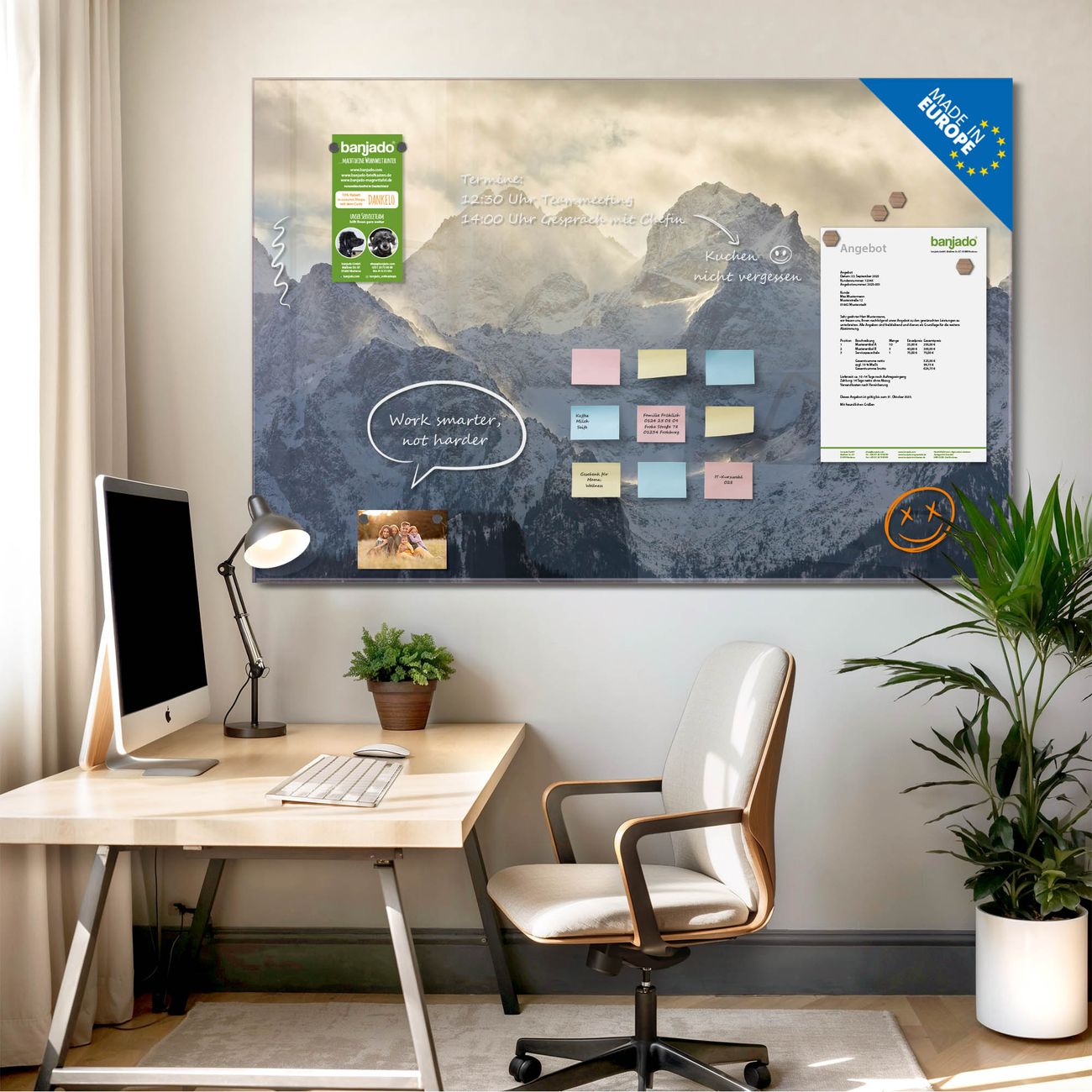 Jede Glas Magnettafel wird in unserer Werkstatt von Hand gefertigt und sorgfältig geprüft. So erhalten Sie ein echtes Qualitätsprodukt, das Funktion und Ästhetik perfekt vereint.?? Warum banjado?