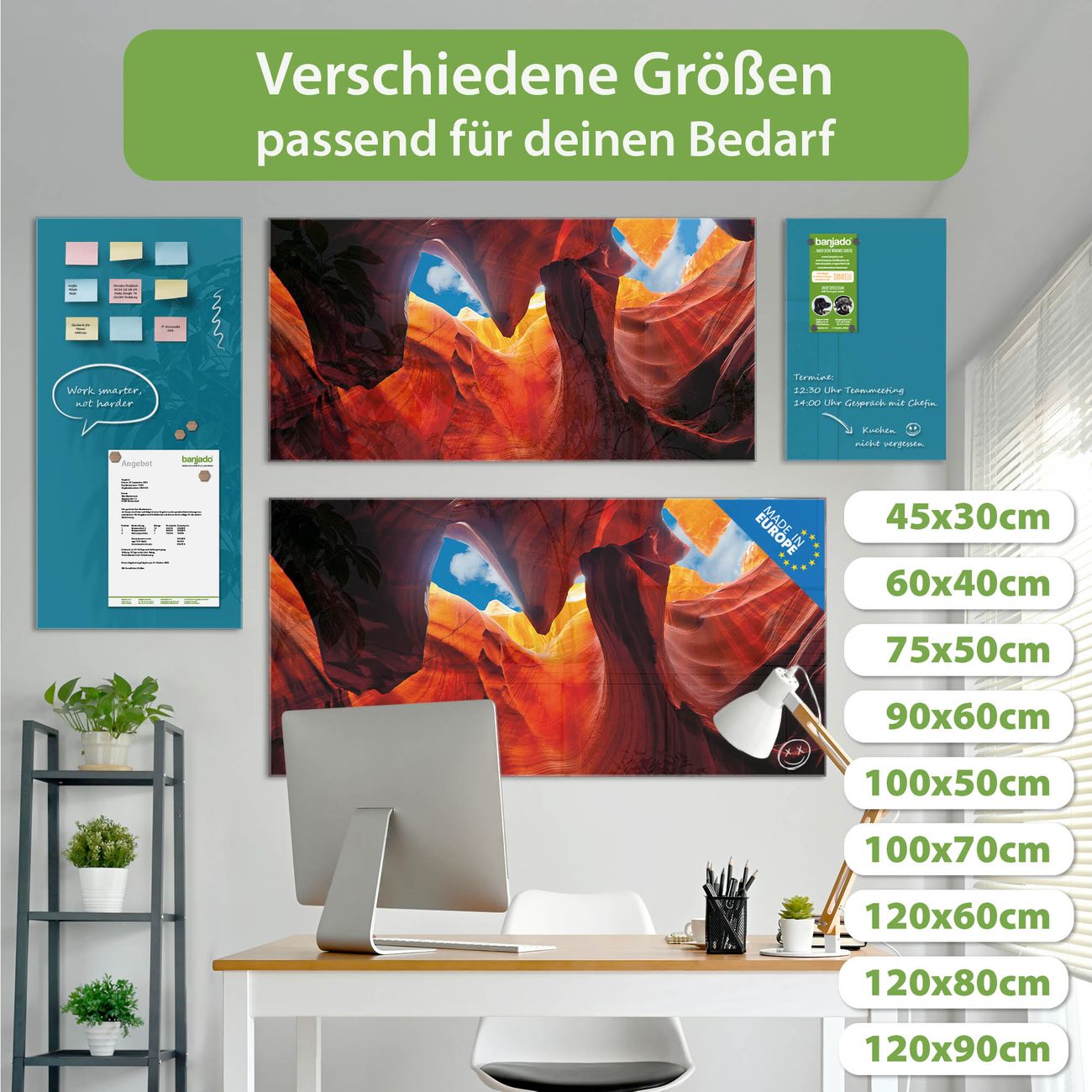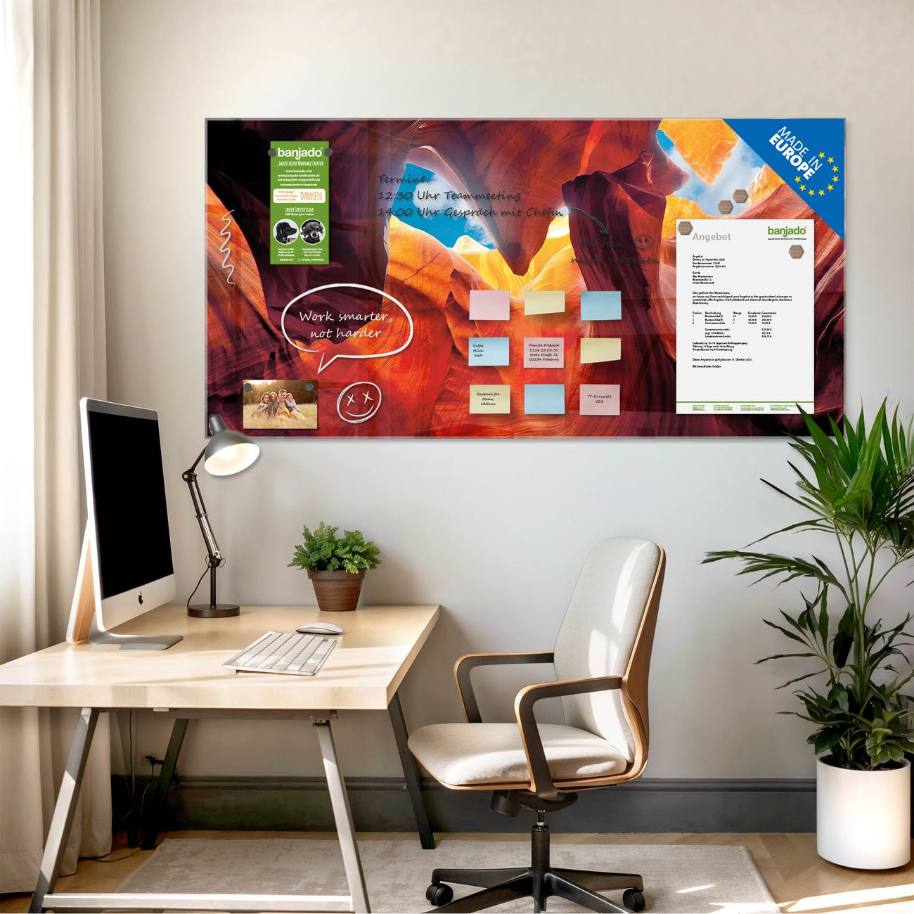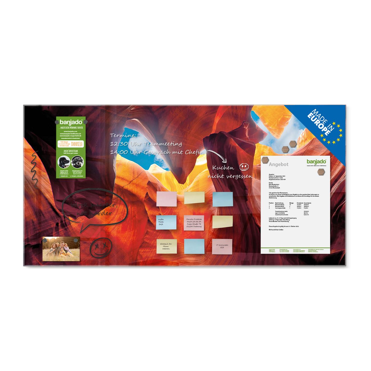 Jede Glas Magnettafel wird in unserer Werkstatt von Hand gefertigt und sorgfältig geprüft. So erhalten Sie ein echtes Qualitätsprodukt, das Funktion und Ästhetik perfekt vereint.?? Warum banjado?